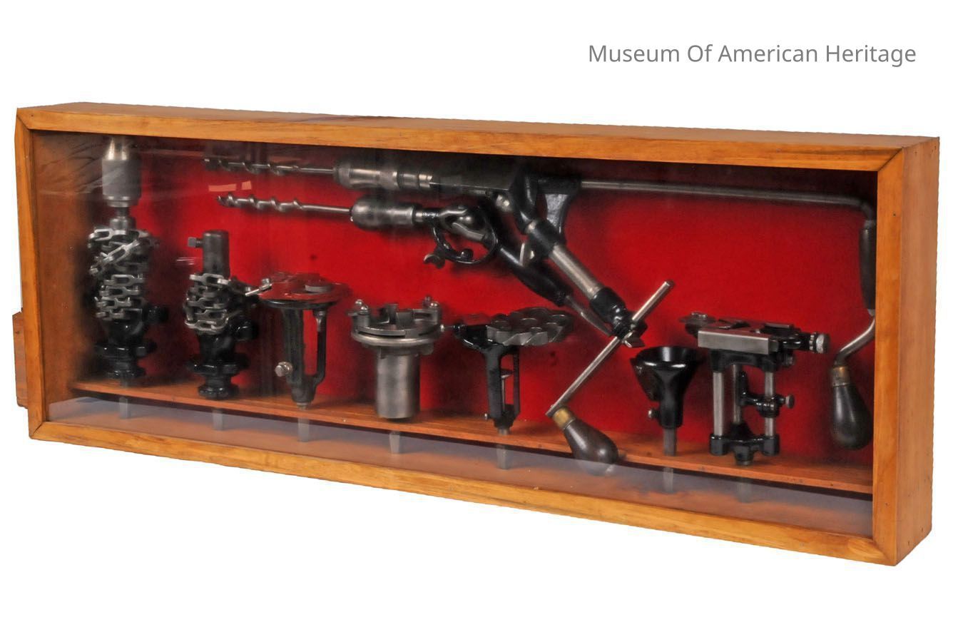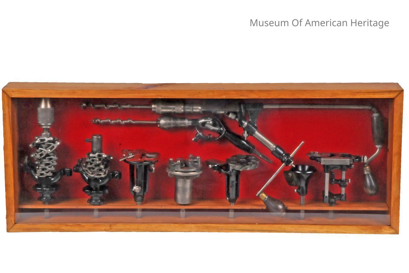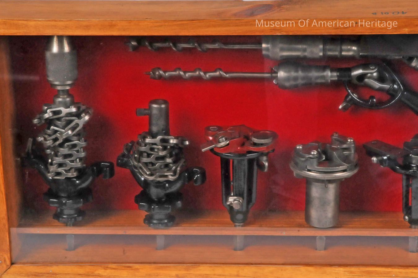 Two display cases of hand drills, drill bits, and attachments.