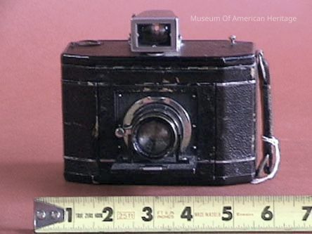Single lens reflex, roll film only. Lens folds up after mirror is raised, all controls under top lid