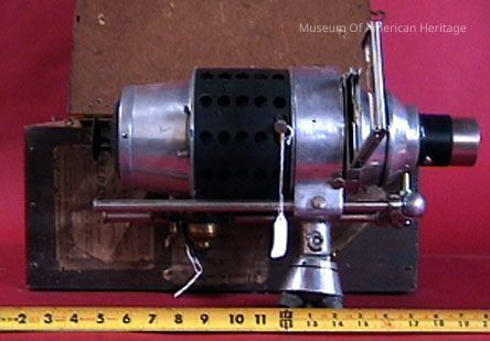 Animatograph, in wood box case, has home made tripod, aluminum slide frame,