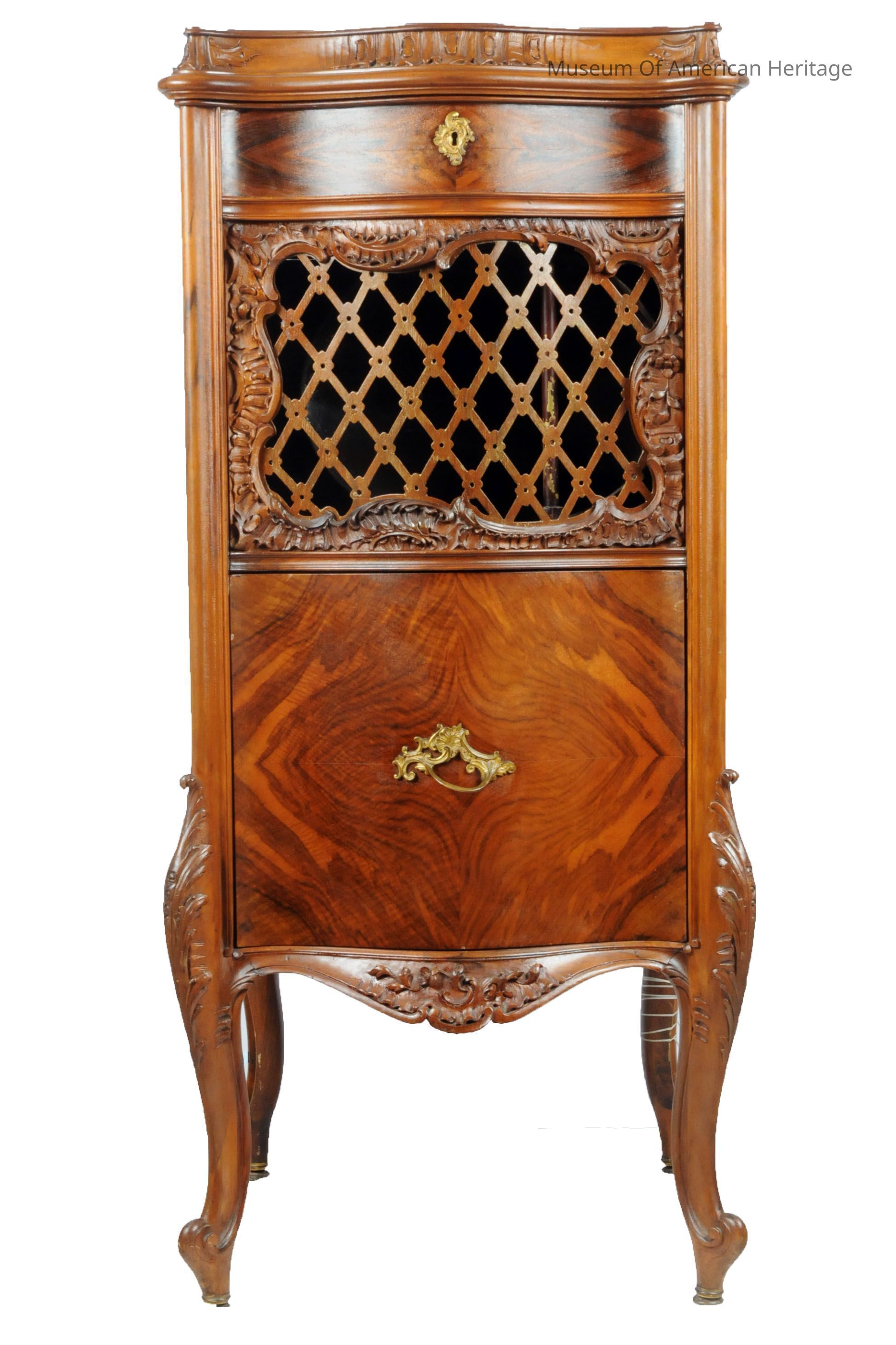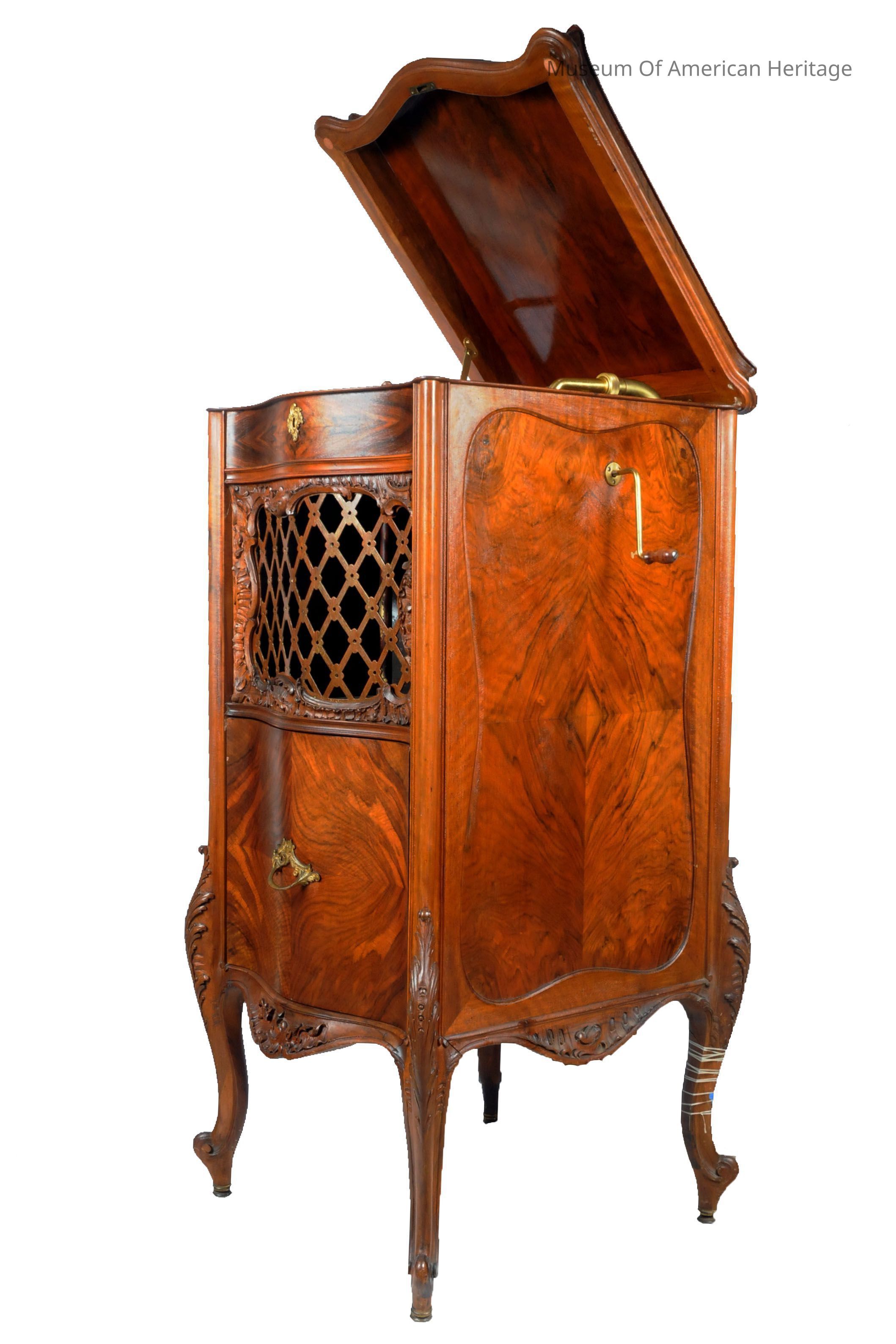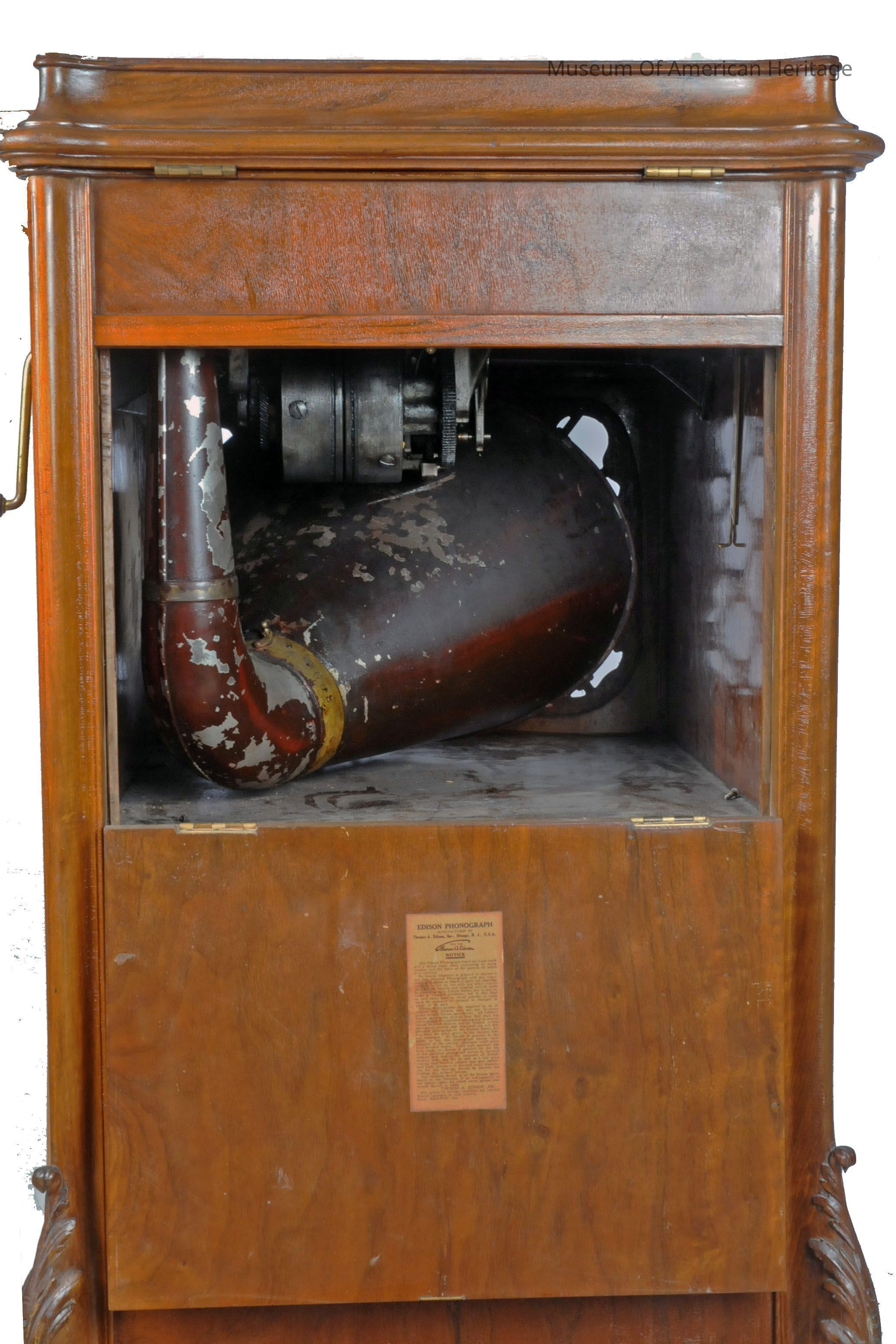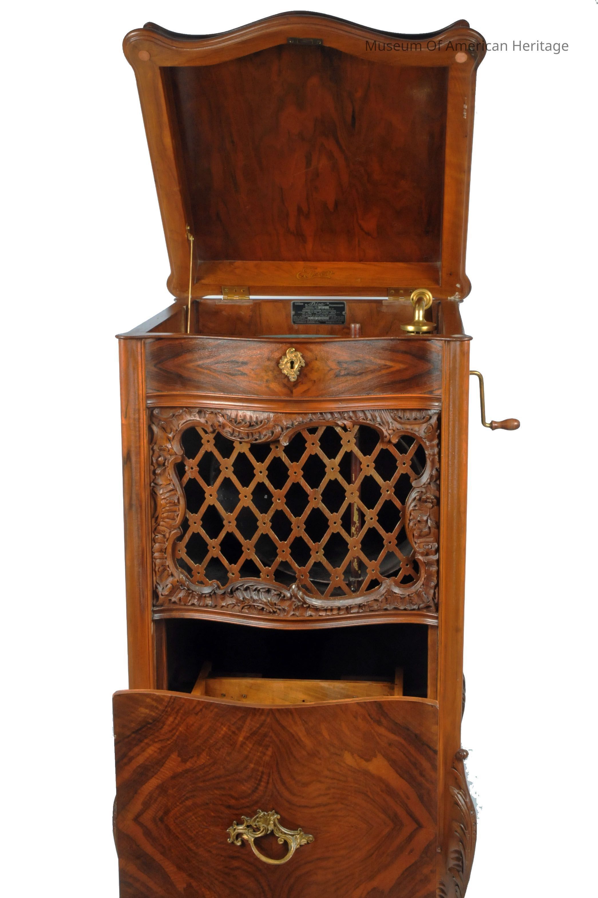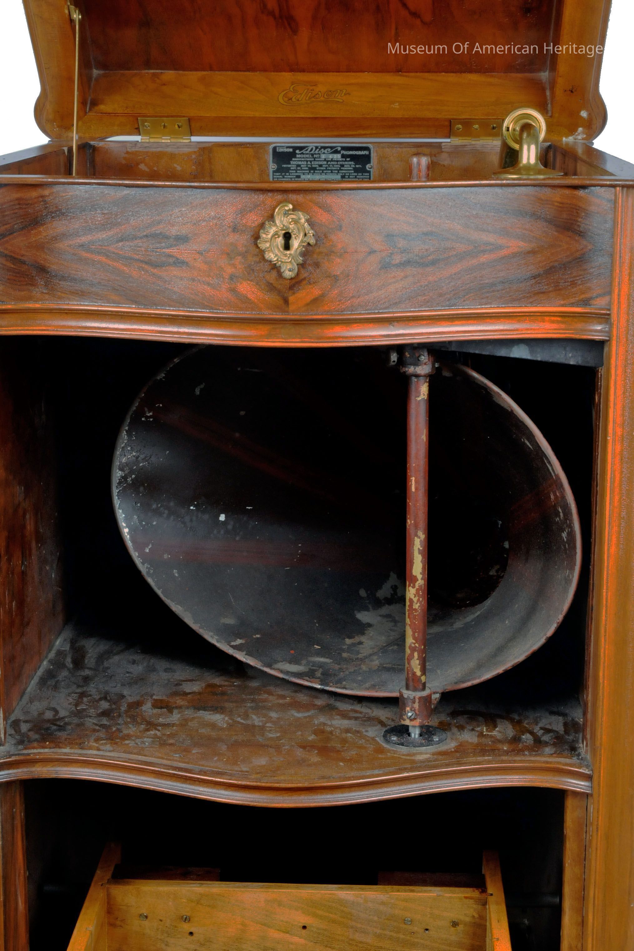 Fruit wood cabinet, brass motor wind crank, record storage drawer, large reproducing horn , patents 1898, 1903,1911.