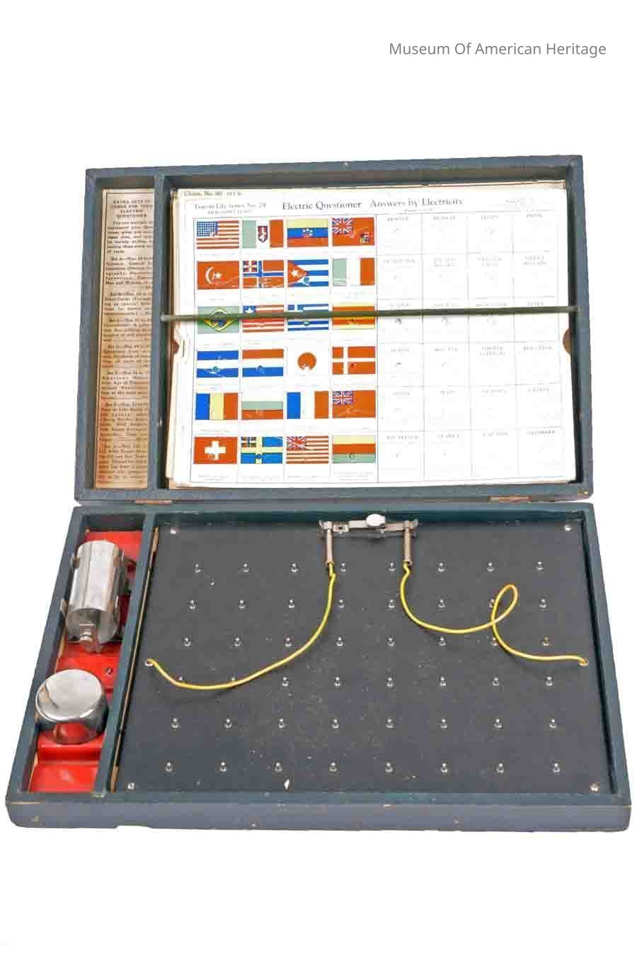 Includes instructions & Morse and Continental telegraph codes, battery storage cylinder and a metal buzzer, 15 different game boards included, 48 metal projections that the boards fit over.