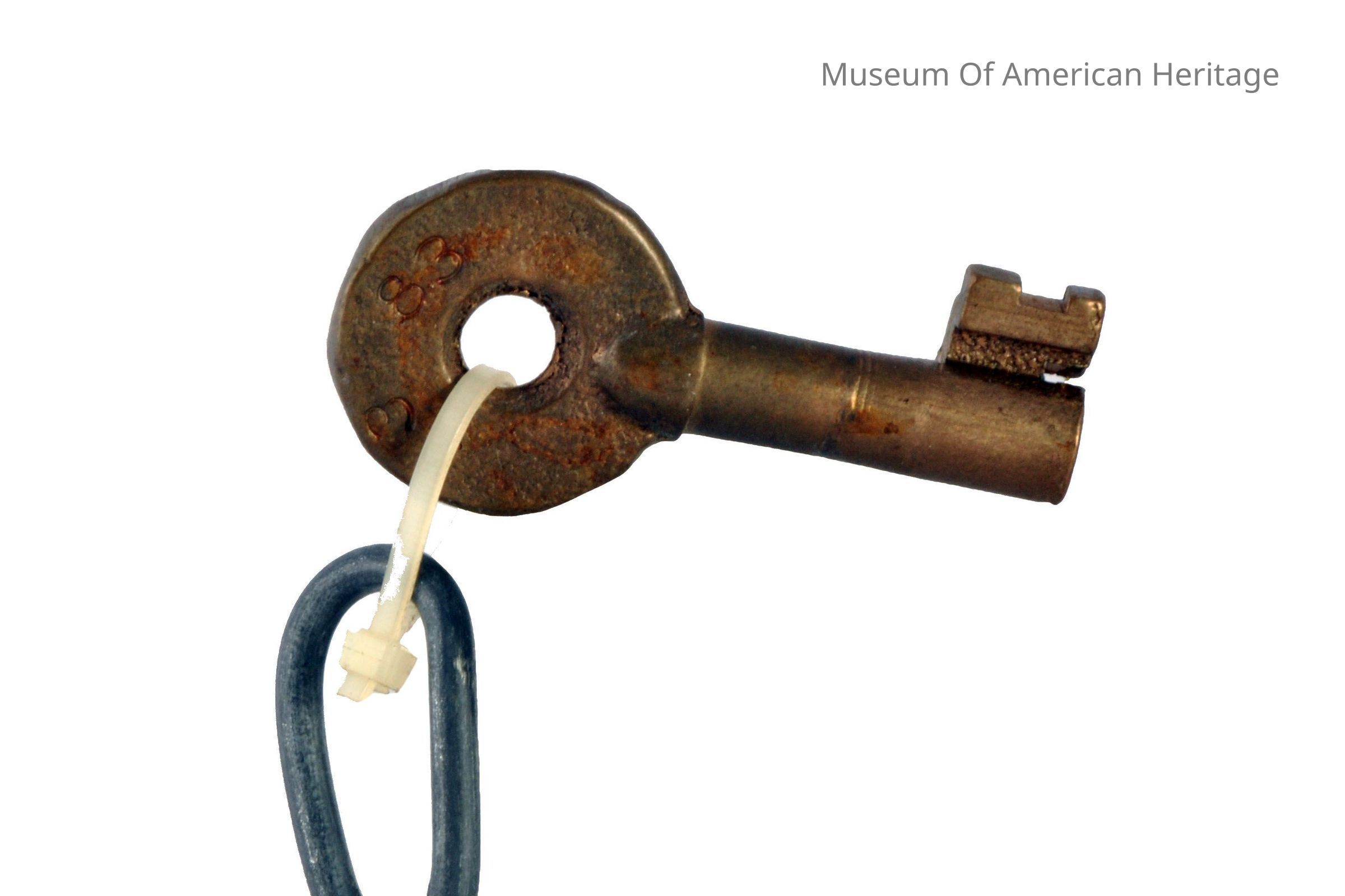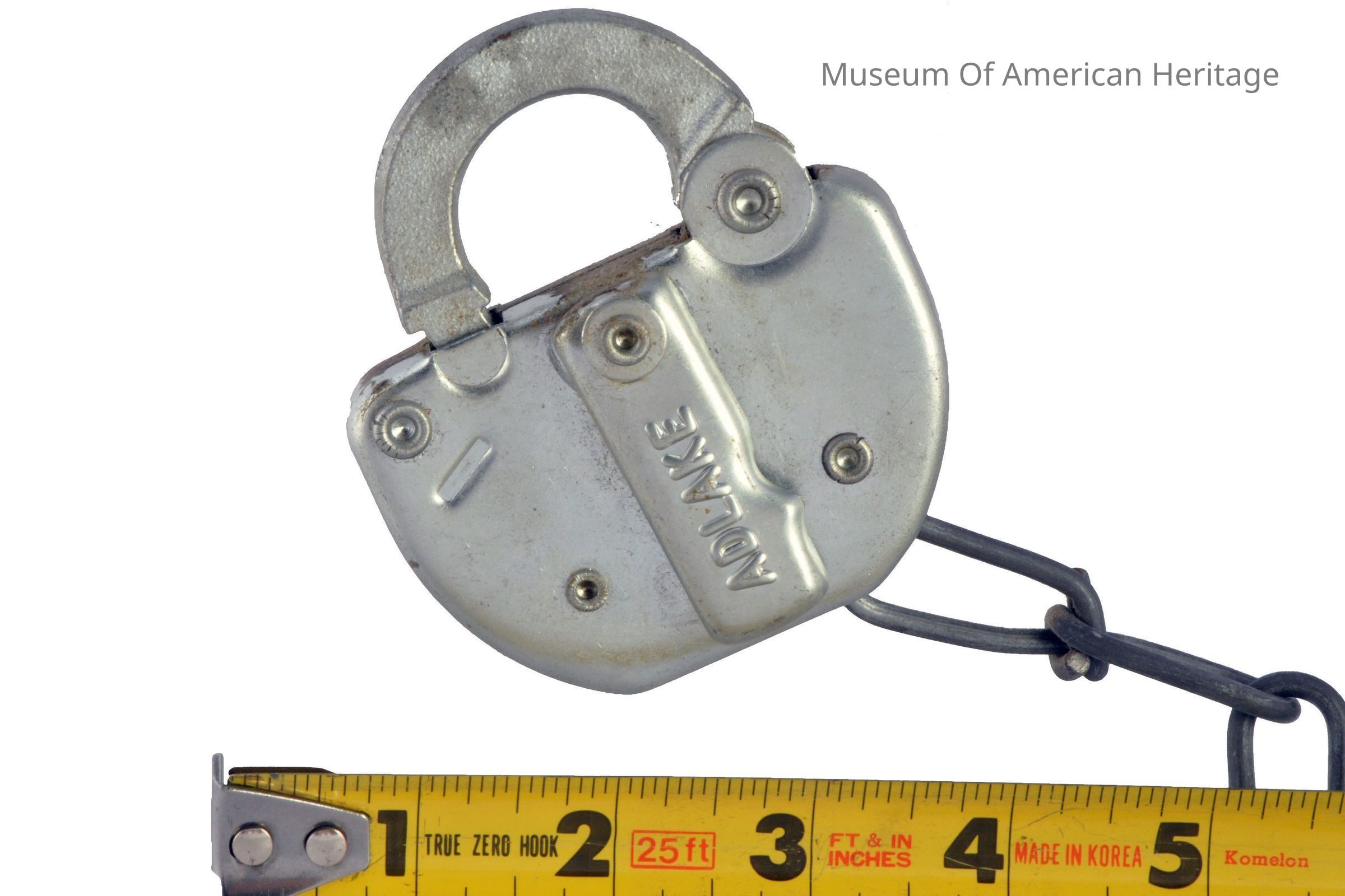 Spring loaded keyhole cover, K9 on lock body, heavy bronze key, 3 93 on key, Adlake on key, key attached to lock by chain.