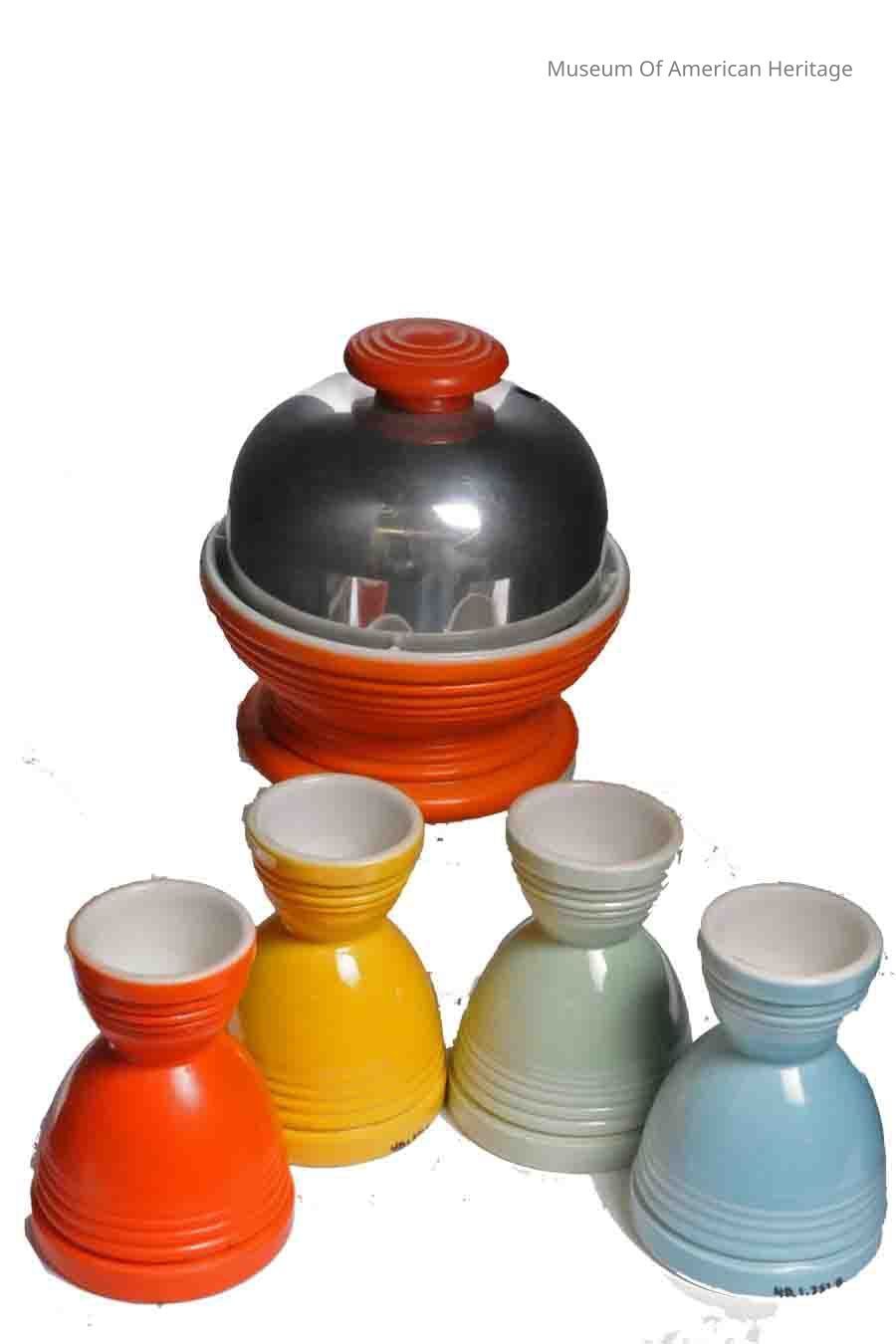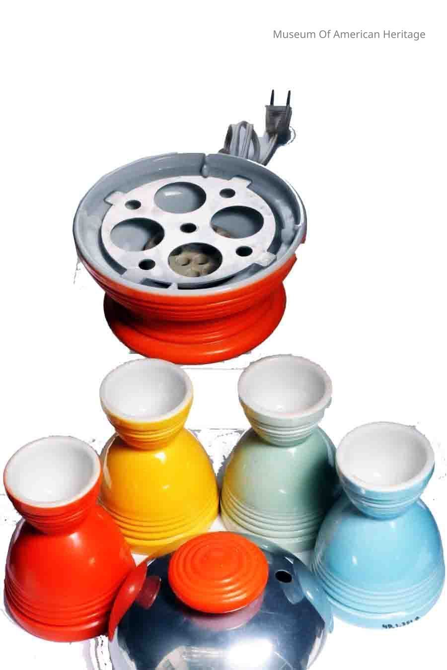 Comes w/ four fiesta egg cups (A,B,C,D), patent no. 1881531, 1913442, instructions on bottom, 110-120 volts, AC only, 3 Amps.