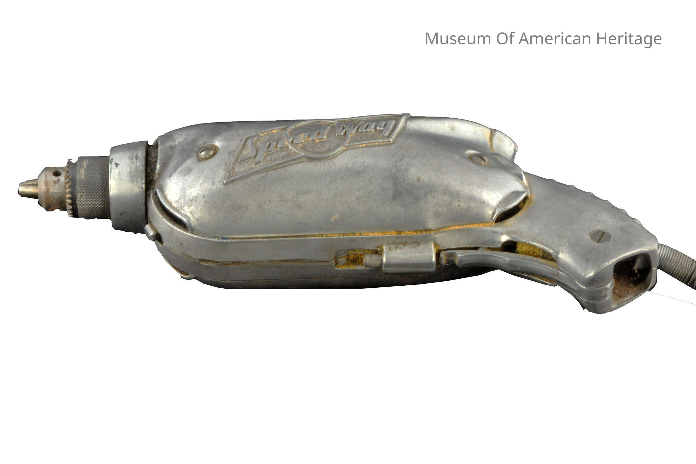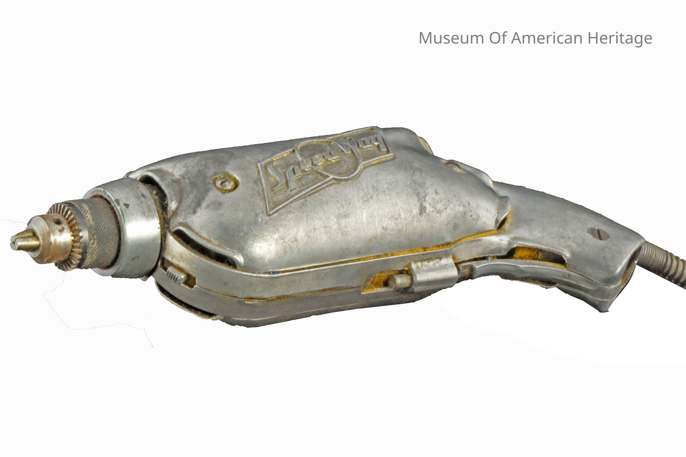 Aluminum housing, on/off switch with pin to hold trigger on, power cord.