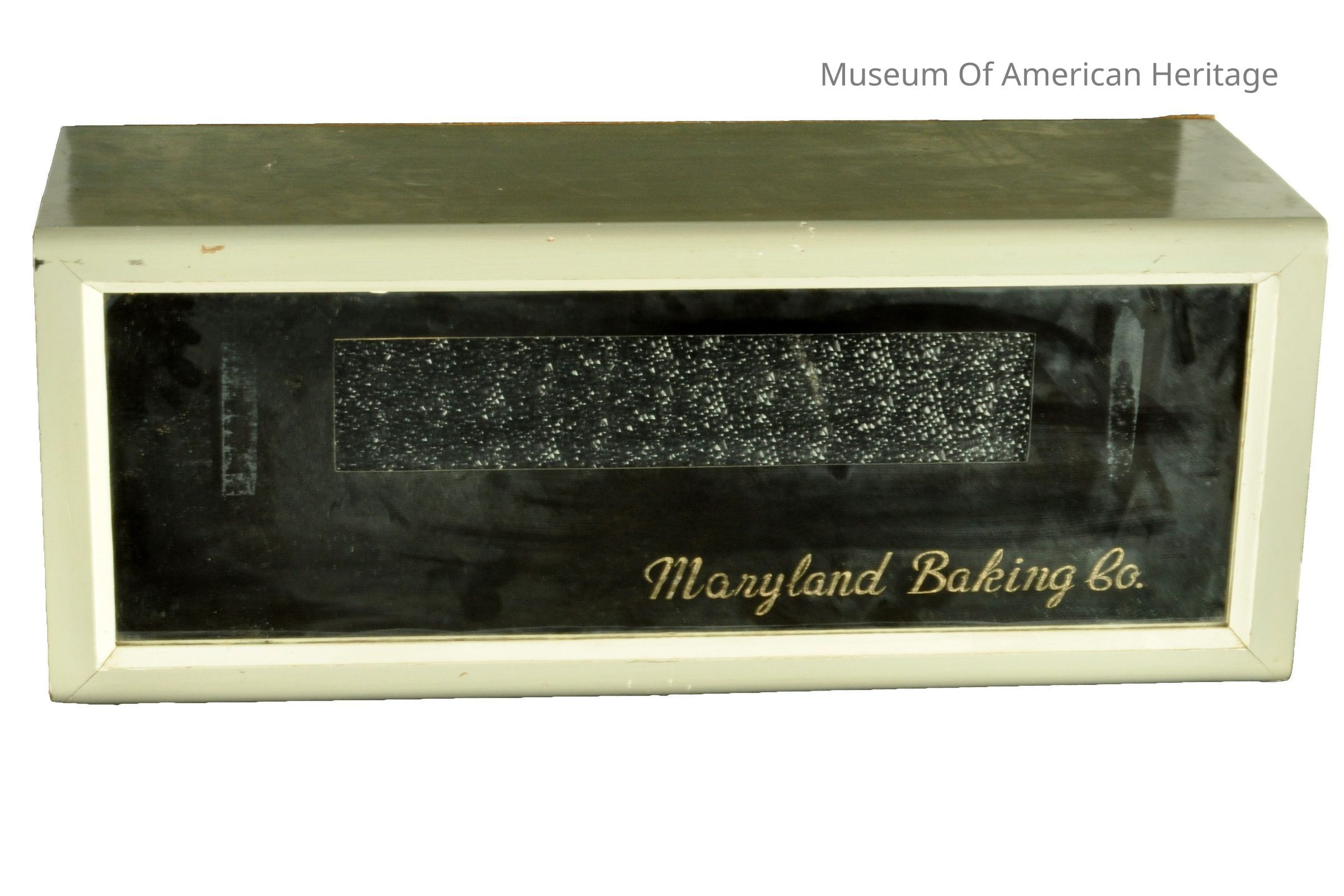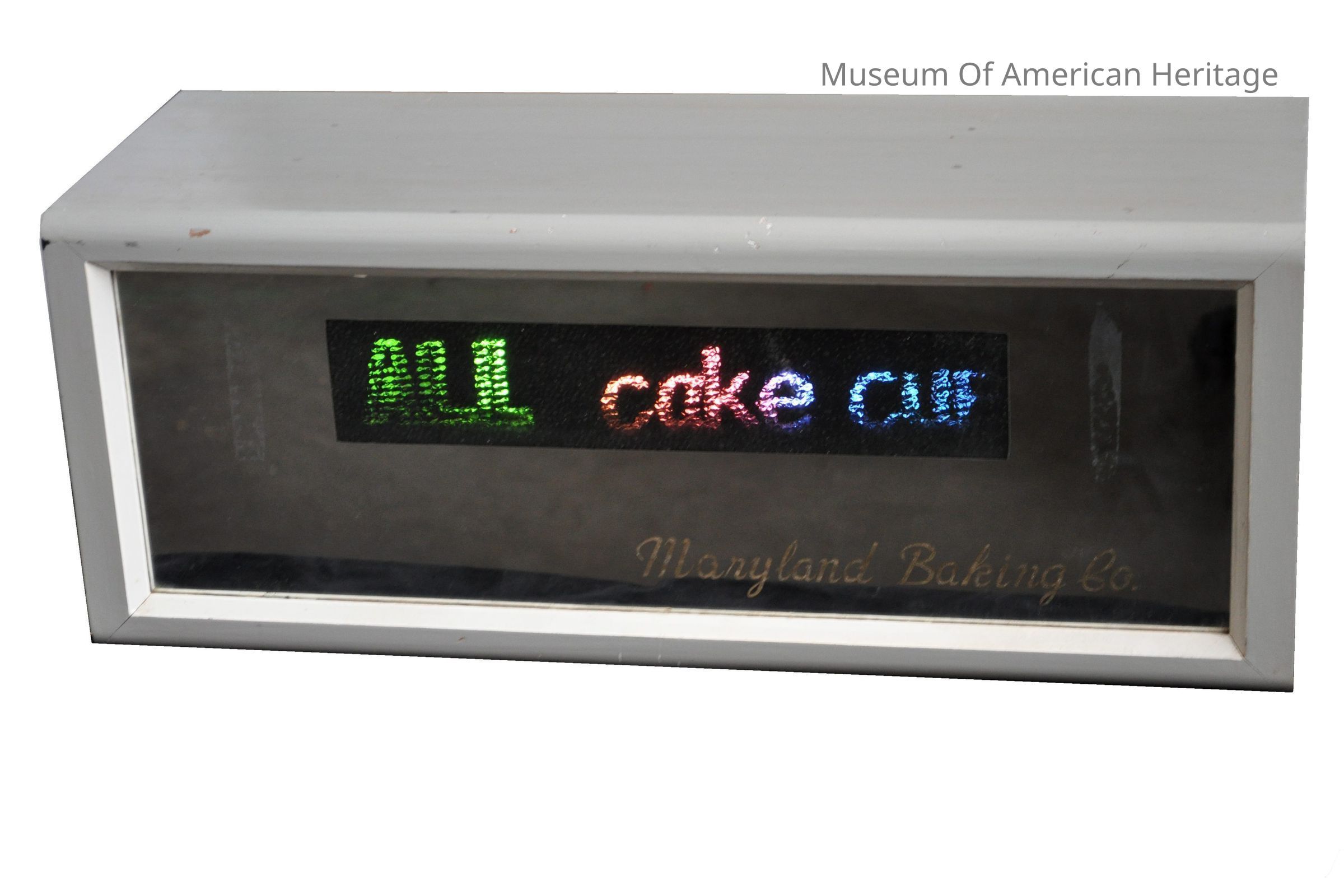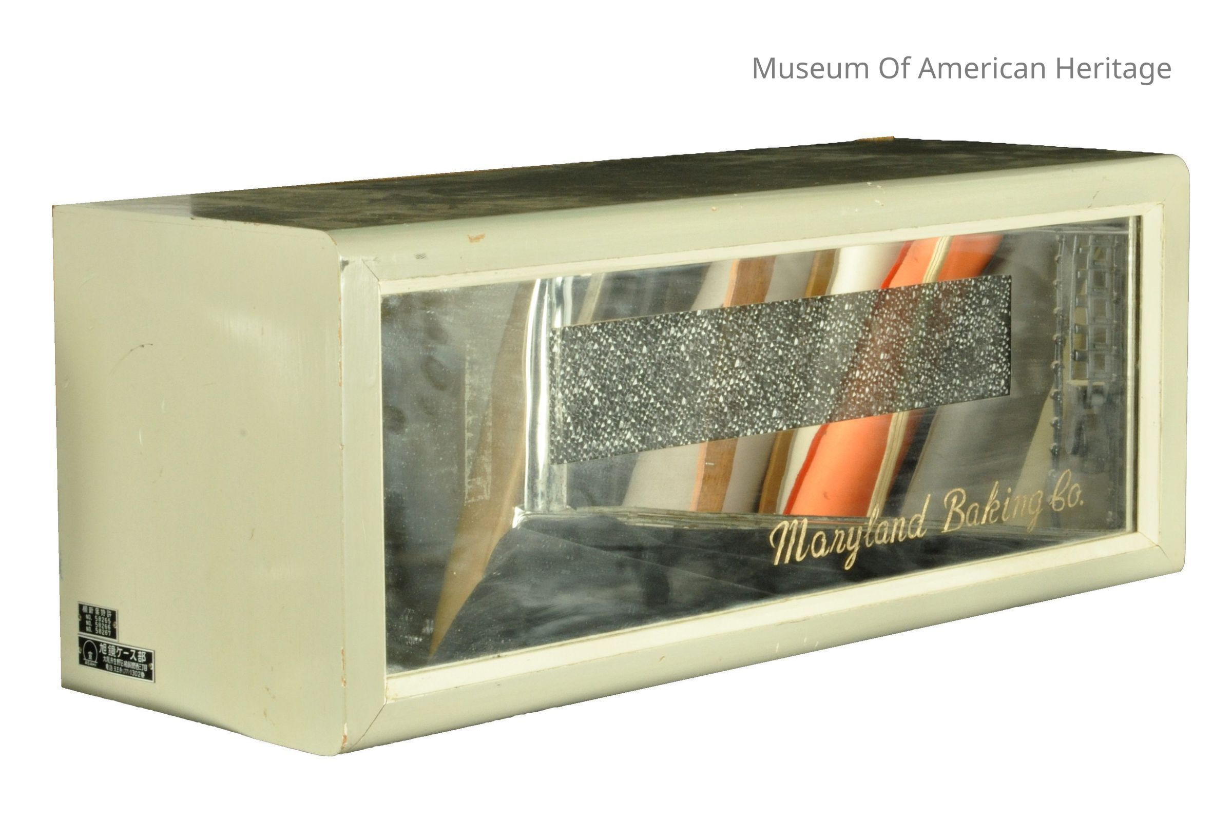 Maryland Baking Co. on front case, case made of plywood, plywood back, advertises Ice Cream Cone Week, mirrored front, power cord w/inline on/off switch.