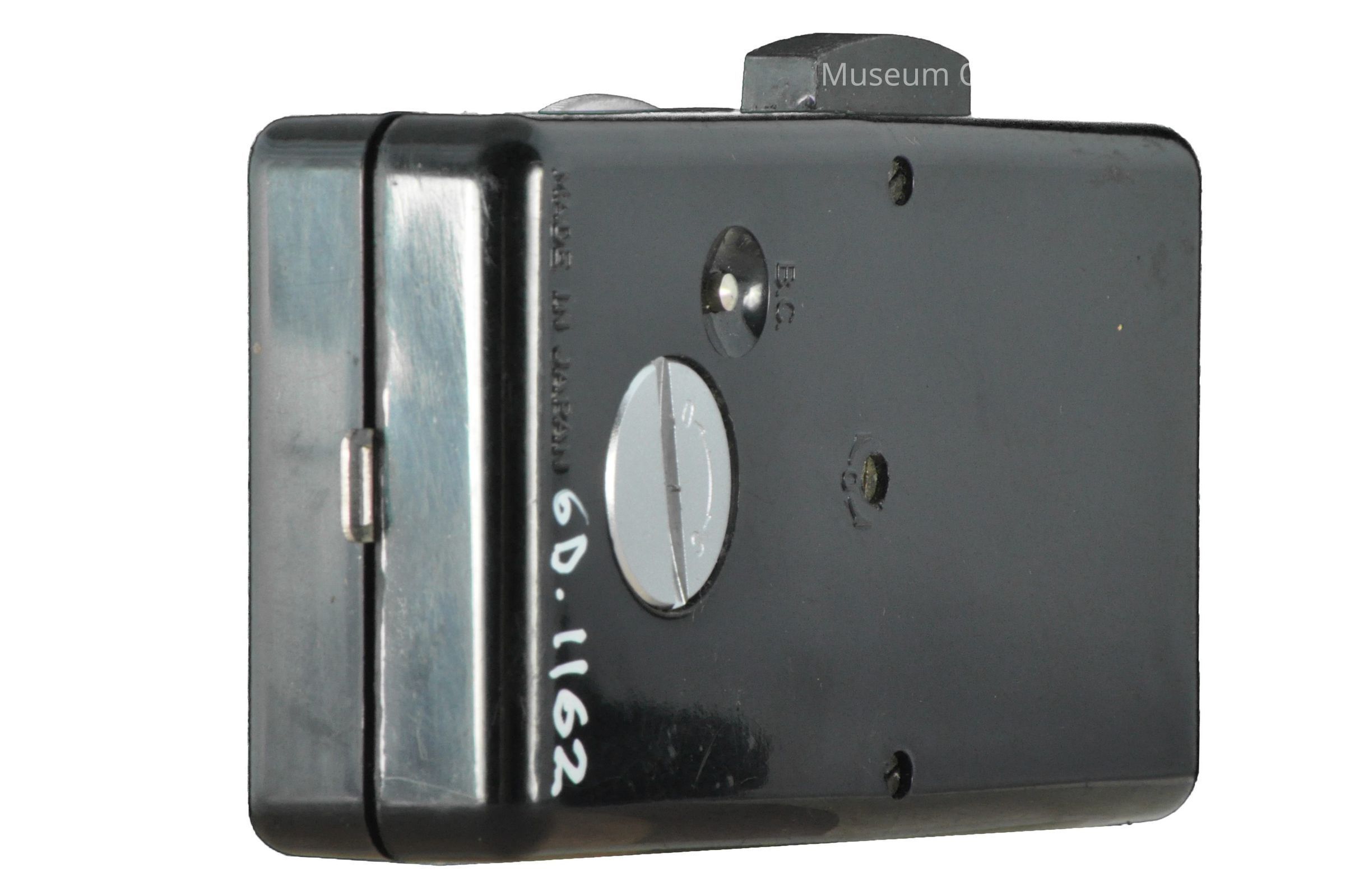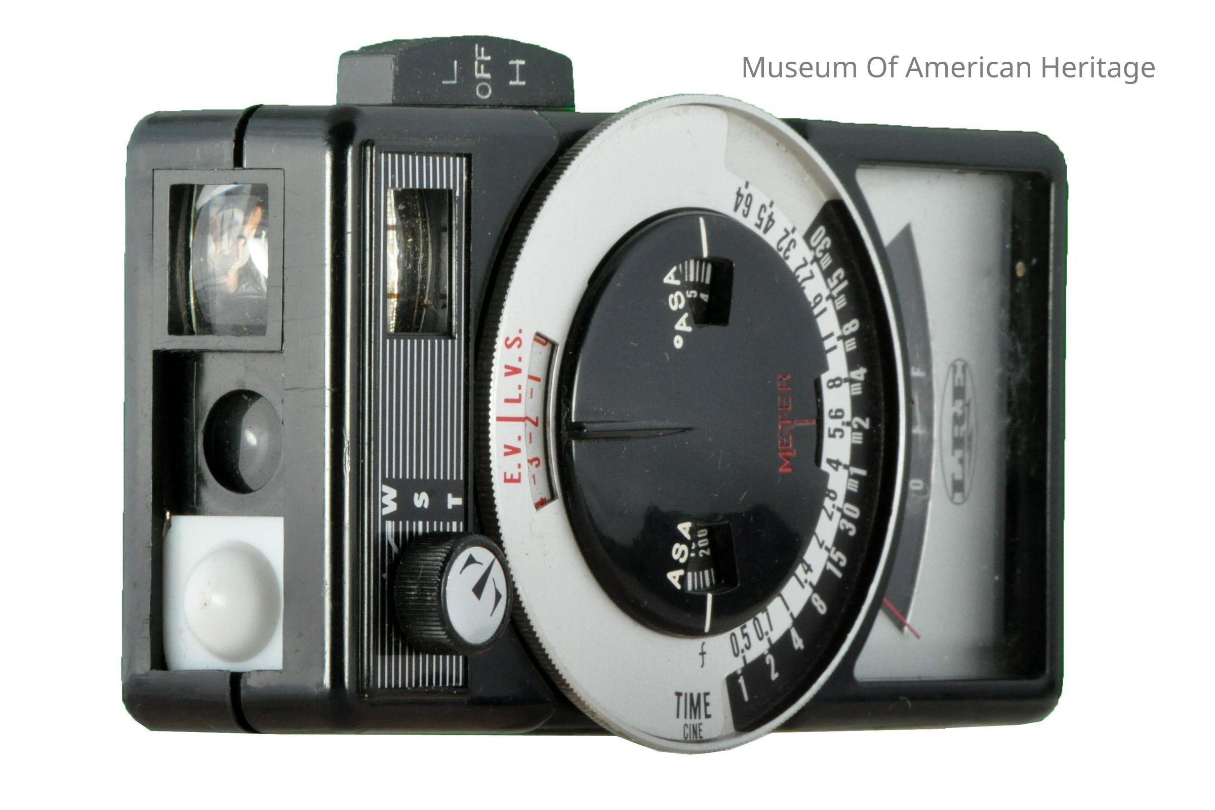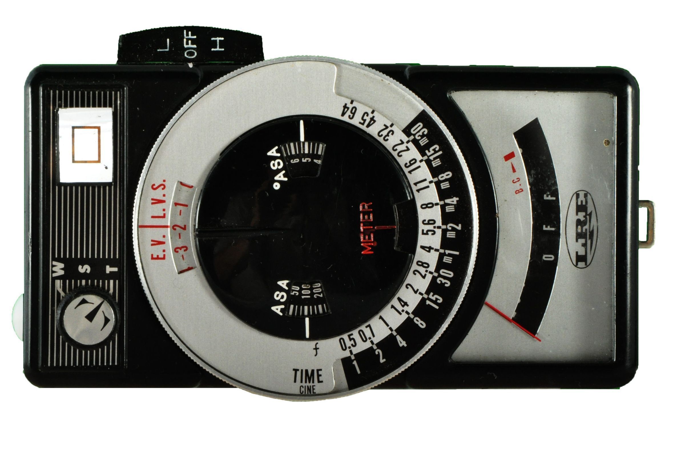 LRE logo in oblong, on/off control on side, scale on top, cloth cord strap, black leather case.