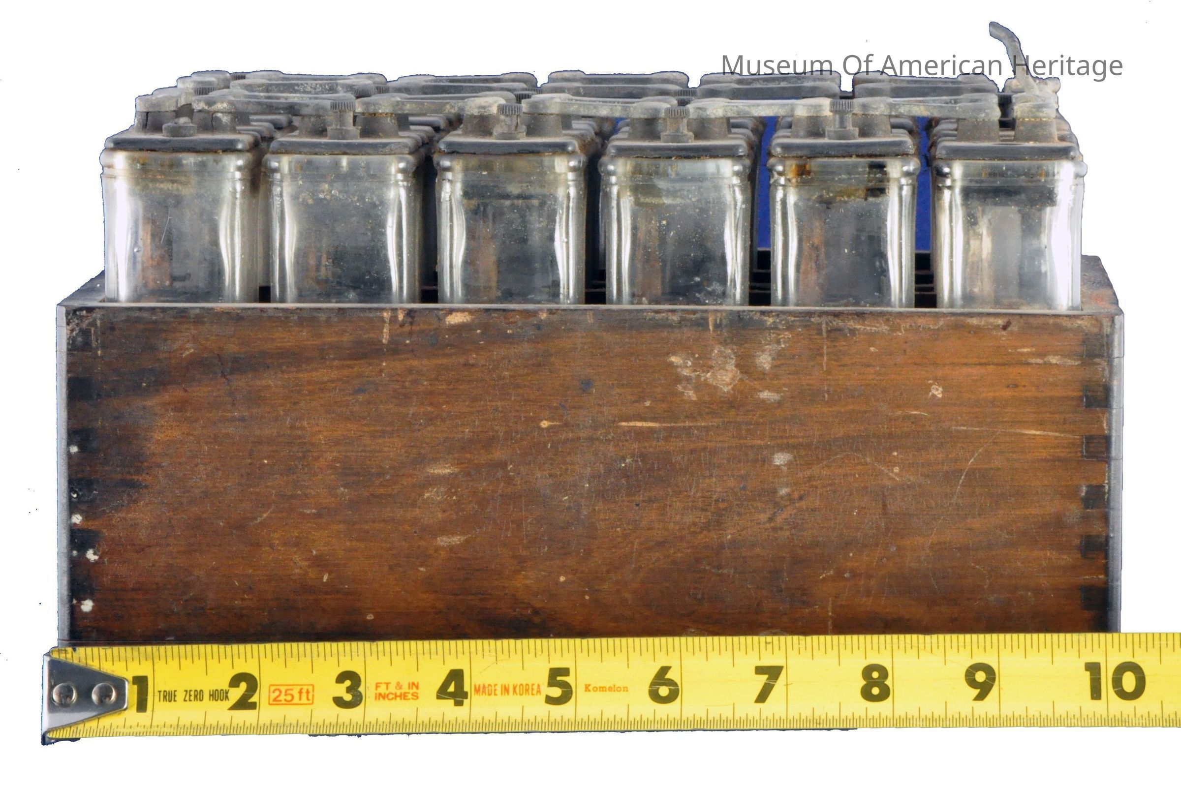 24- 1 1/2 volt wet cells interconnected, glass with lead links, used in early radios.