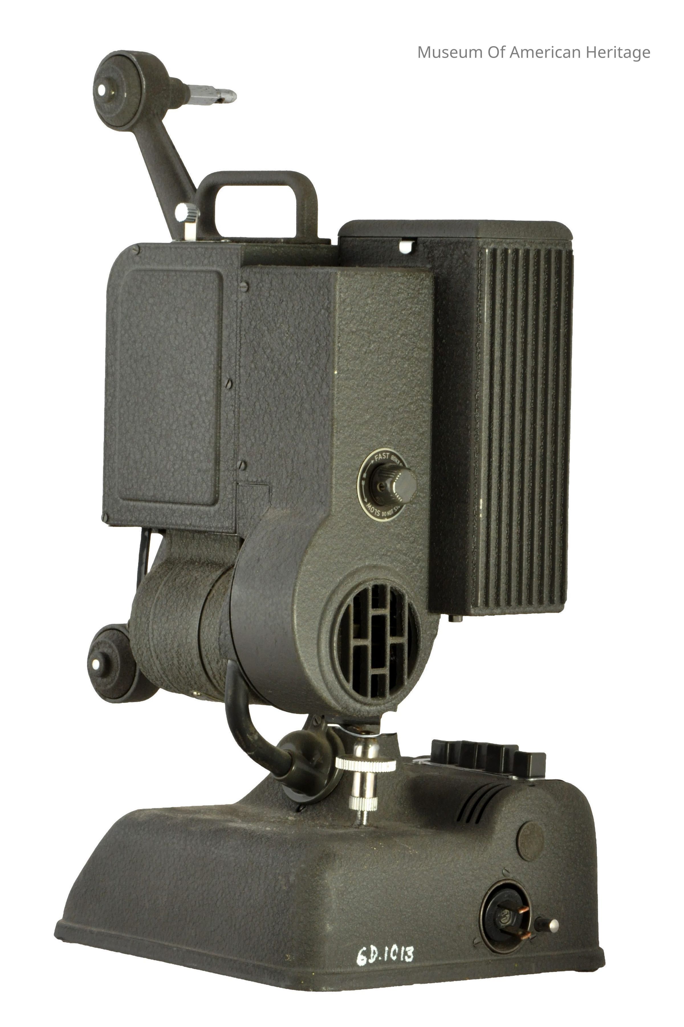 Threading knob on front, four buttons, f1.6 -2 lens, lamp adjust on side, use slow burning film only, black cloth covered case.