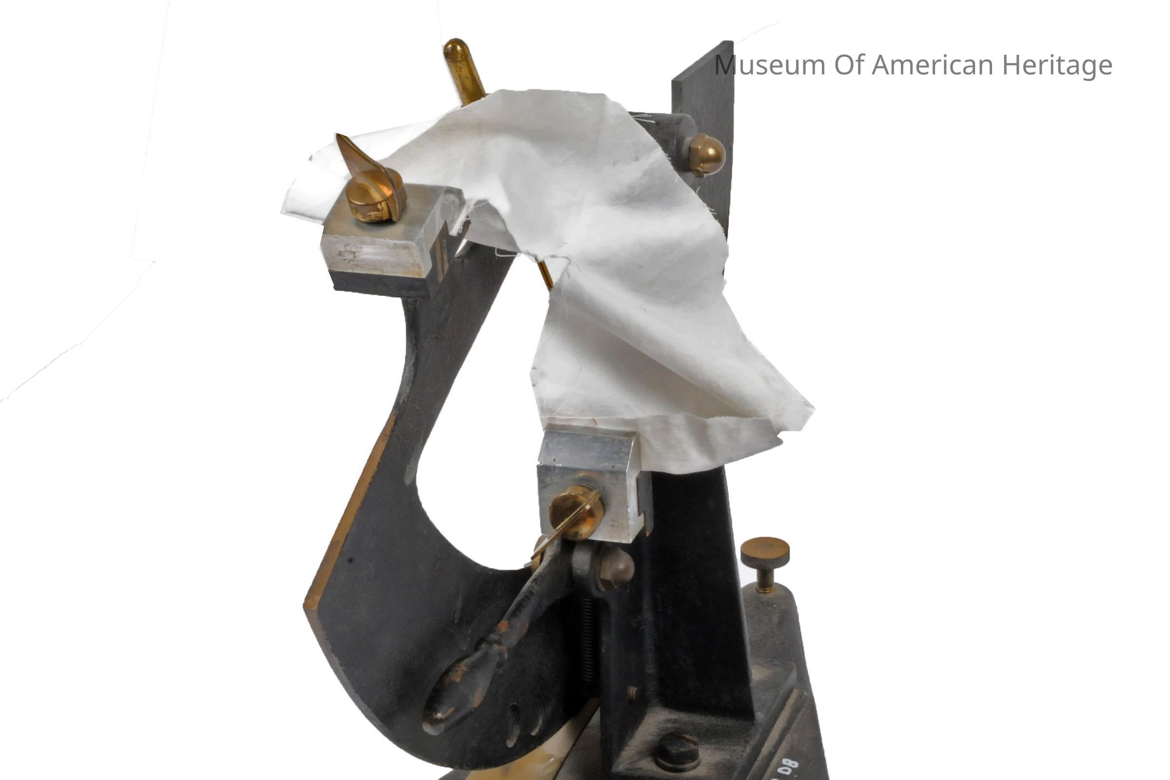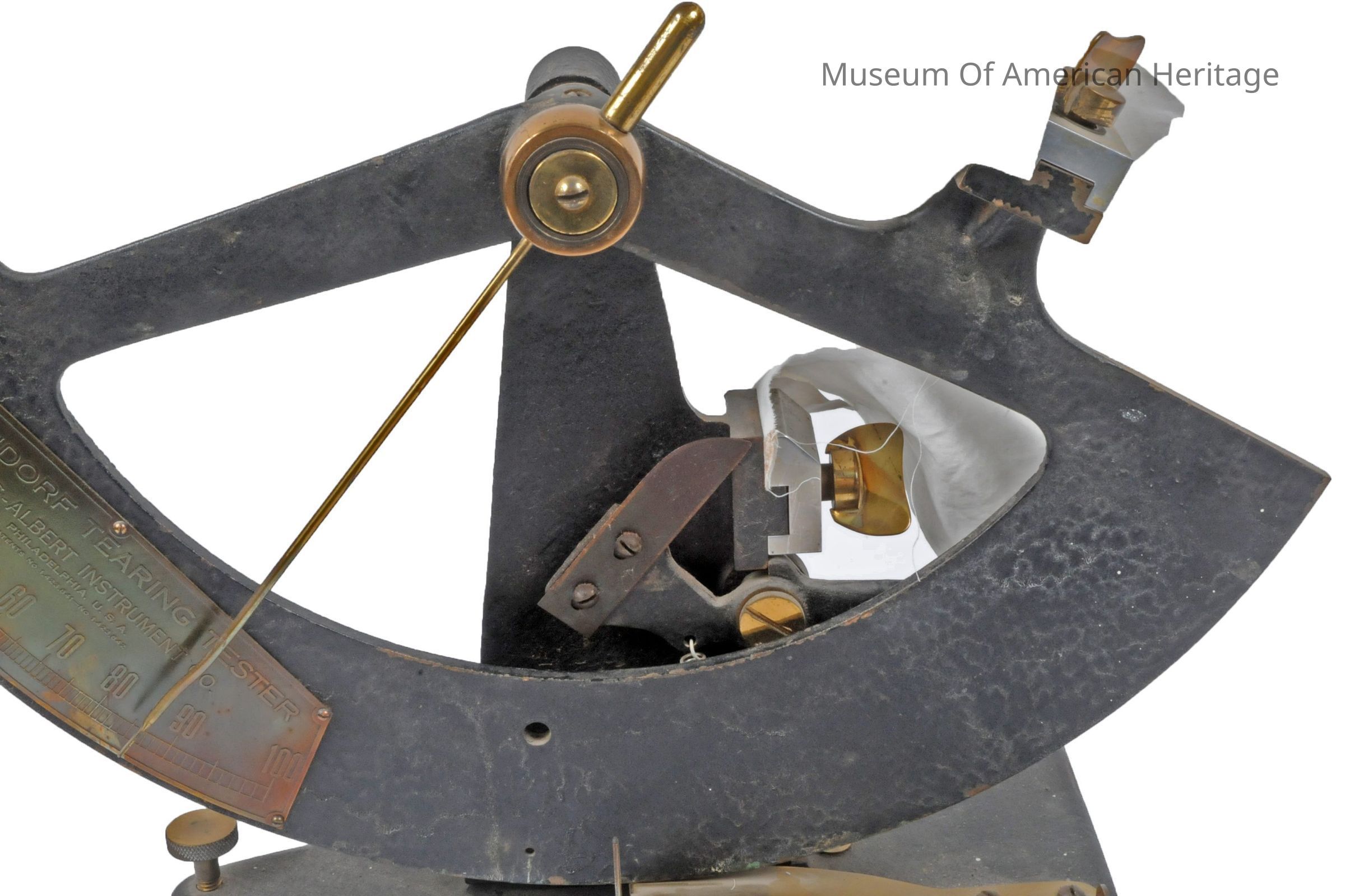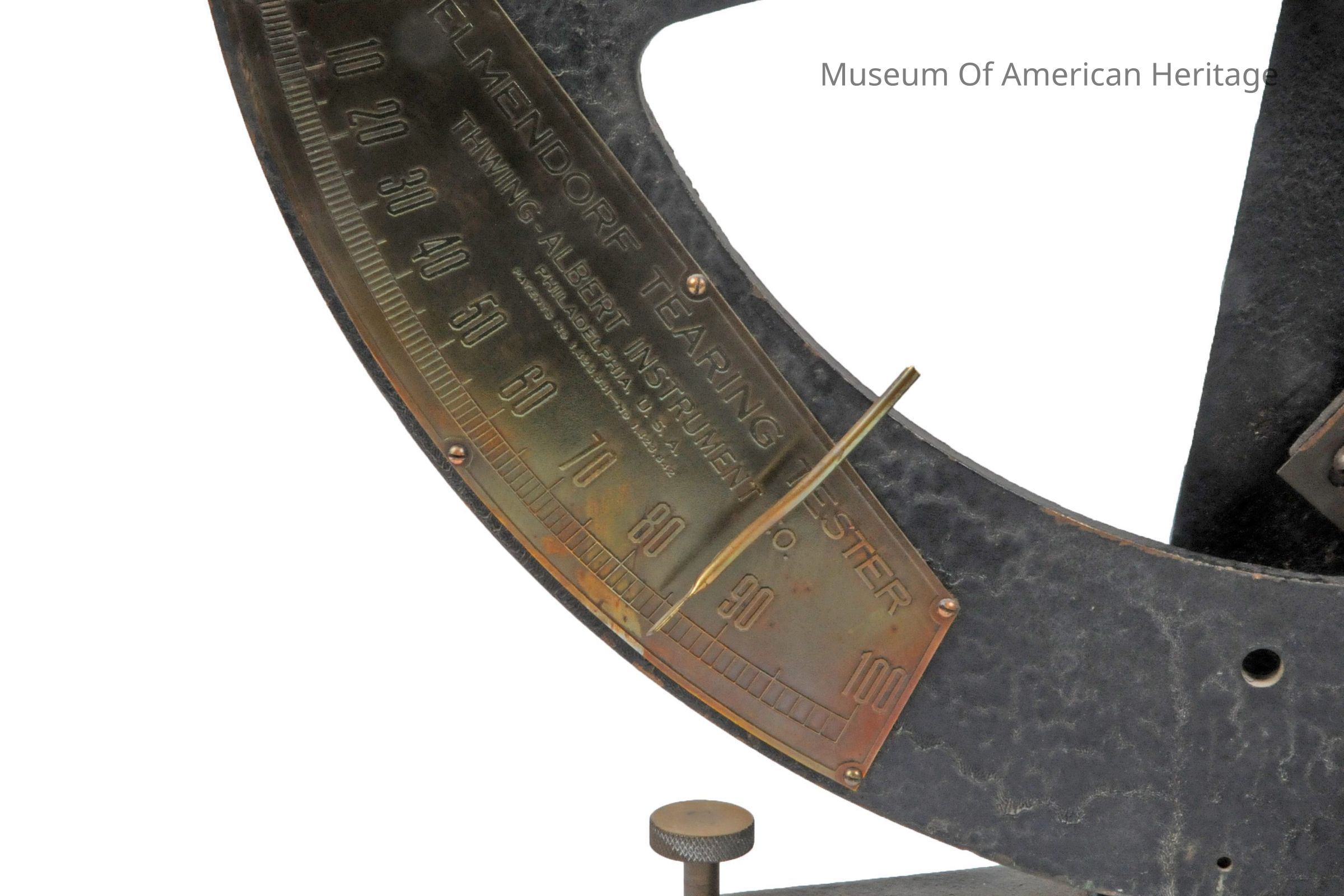 Compares relative resistance to tearing of various fabrics, predetermined size sample of fabric is stretched across knife gap and held in place by 2 clamps, knife cuts the fabric to a uniformed depth, trigger is depressed allowing quadrant to rotate and tear the material.