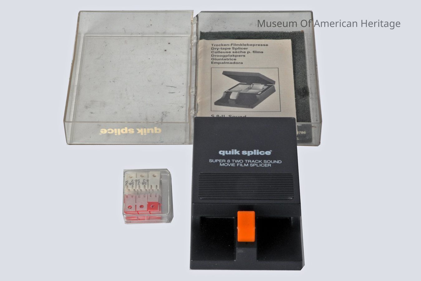 Super 8 Two Track Sound Film Splicer, Instruction manual, use w/quik splice T8S-2 Splice Tape, red & white carrier paper (tabs).
