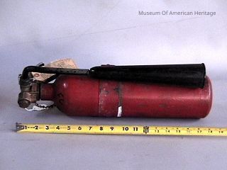 This red fire extinguisher measures approximately 17.7 inches in length. It is defined by its use of carbon dioxide as a fire retardant, an innovation first utilized by Walter Kidde in 1924. Features such as its cylindrical shape, brass construction, and black hose and horn indicate that it was likely manufactured in the mid 20th century.
