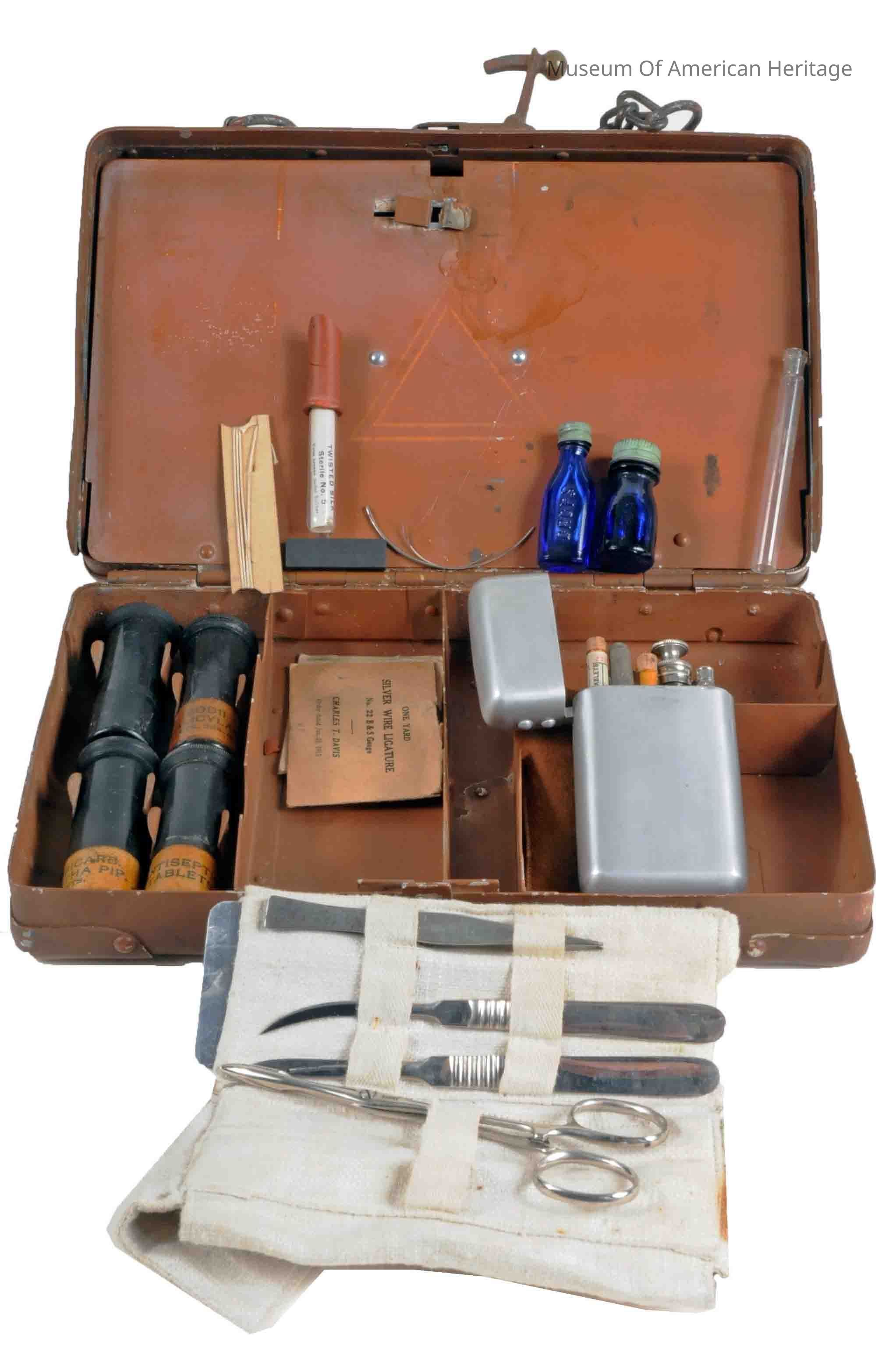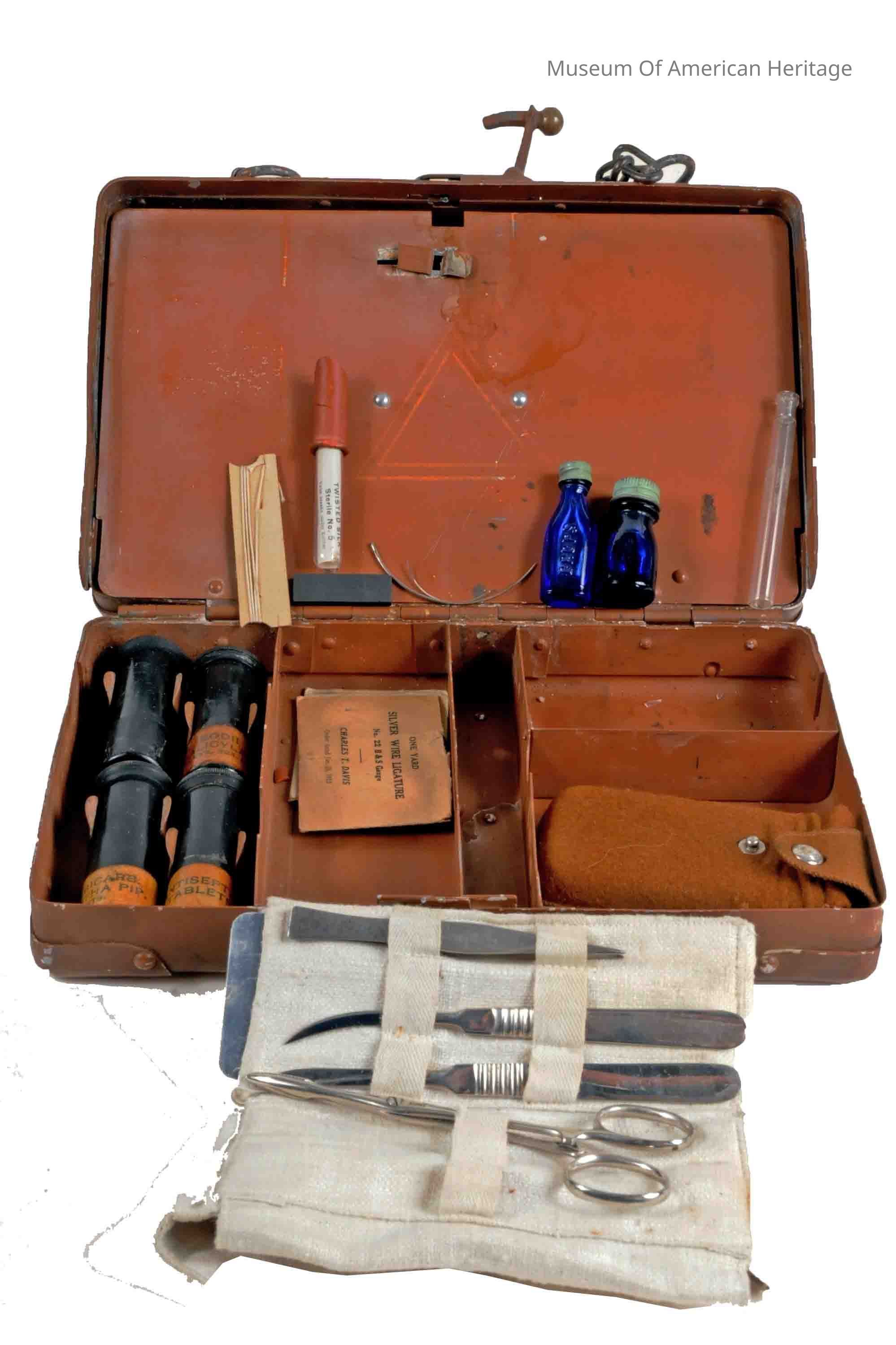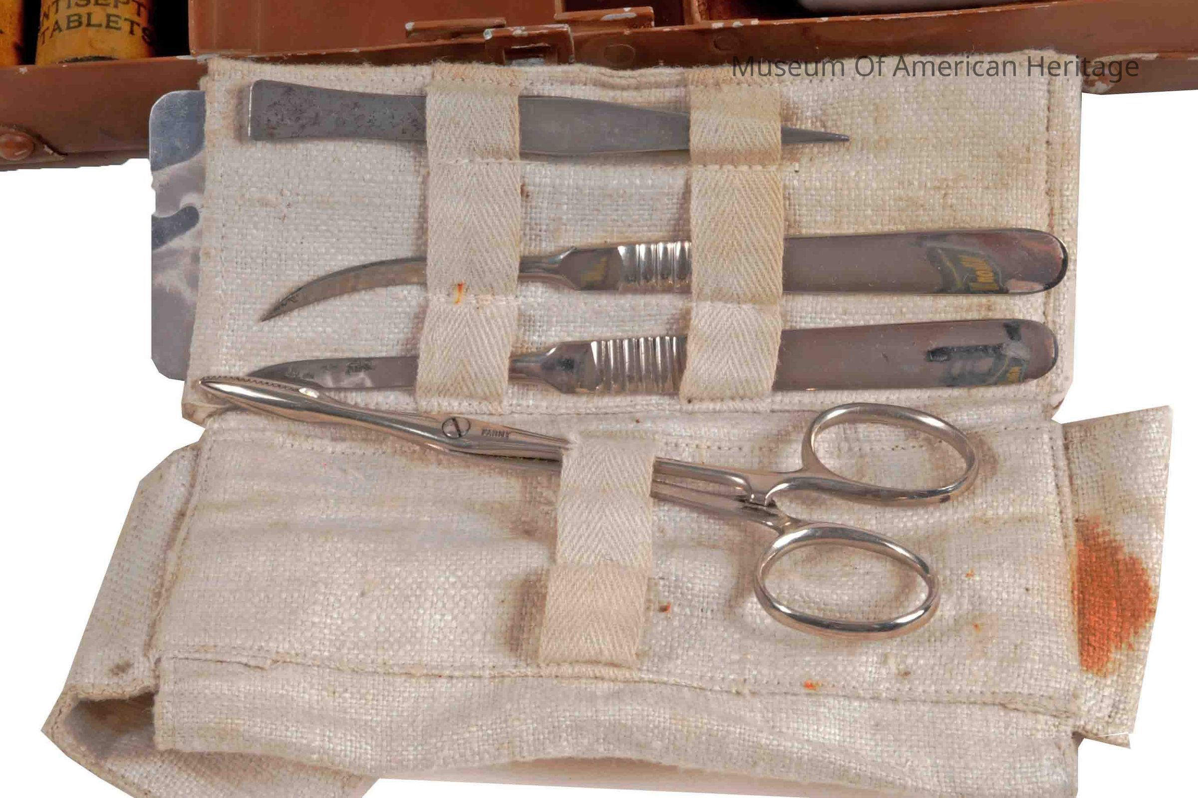 World War I, Medical Dept., U.S. Army, includes sutures, surgical instruments, pills.