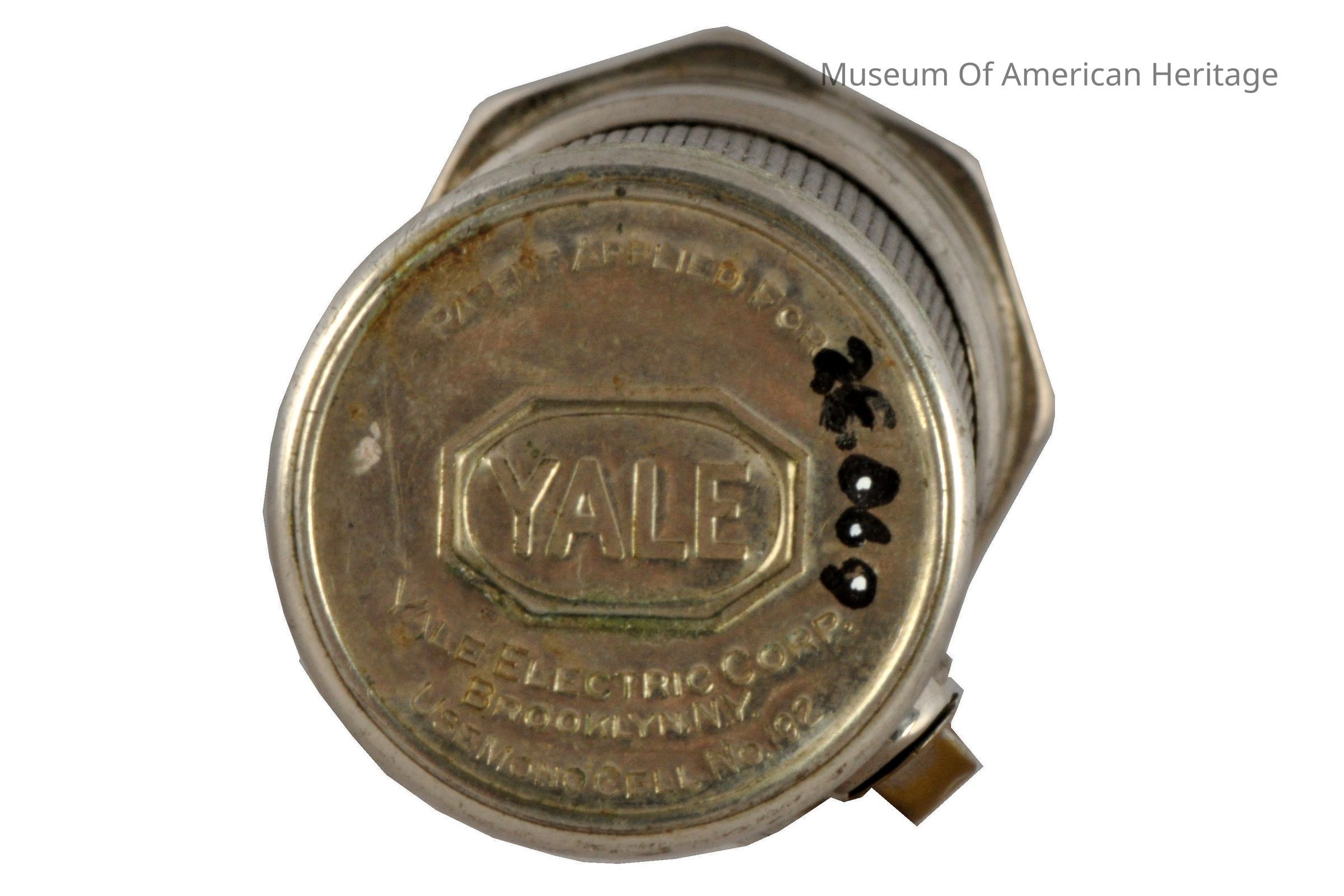Yale logo on bottom, button/slide switch, octagon lens frame, convex magnifier lens.