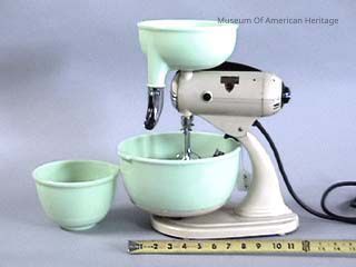Electric with cord, 2 mixing bows, 1 juicer bowl, juicer, beaters, strainer. Precursor to Sunbeam.