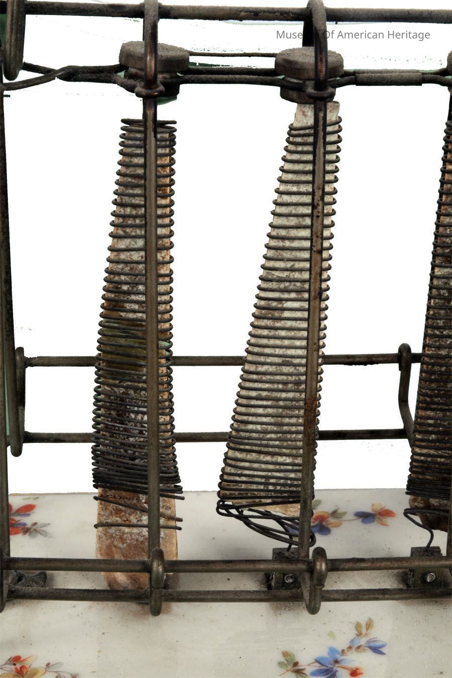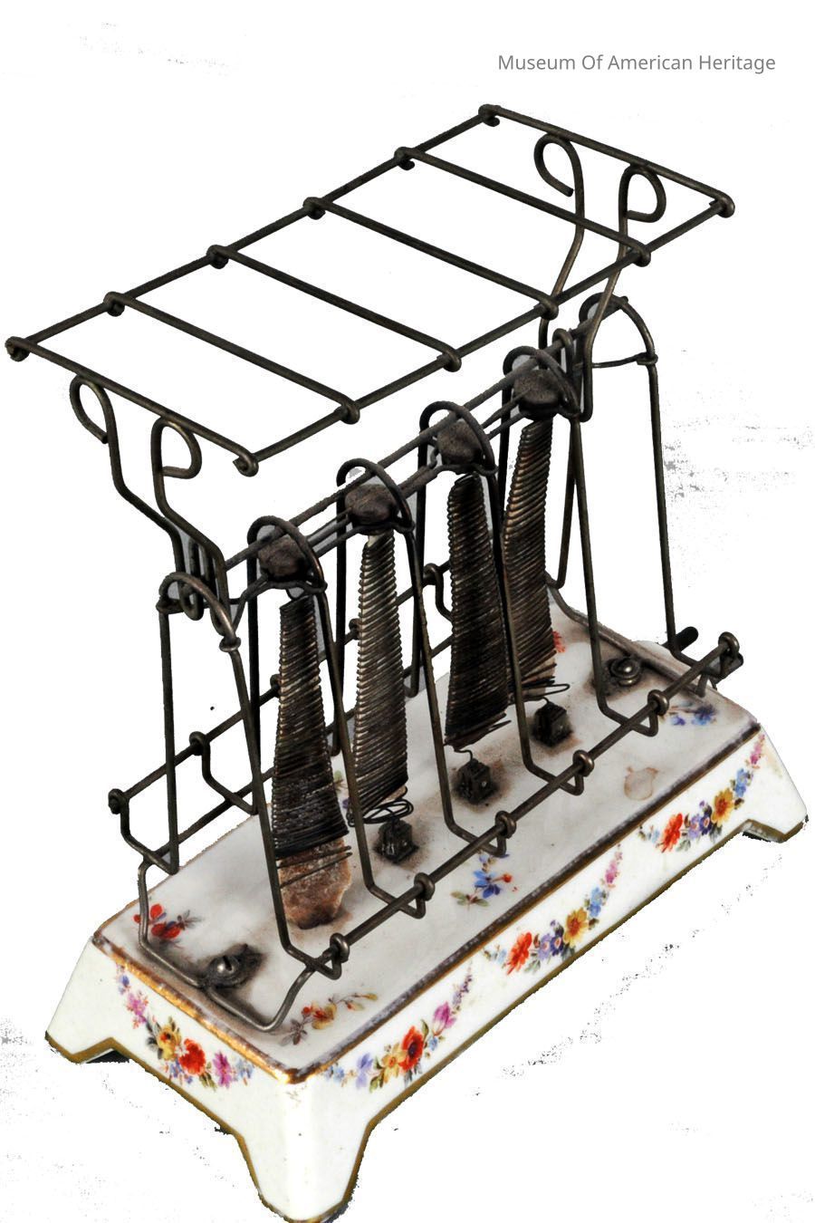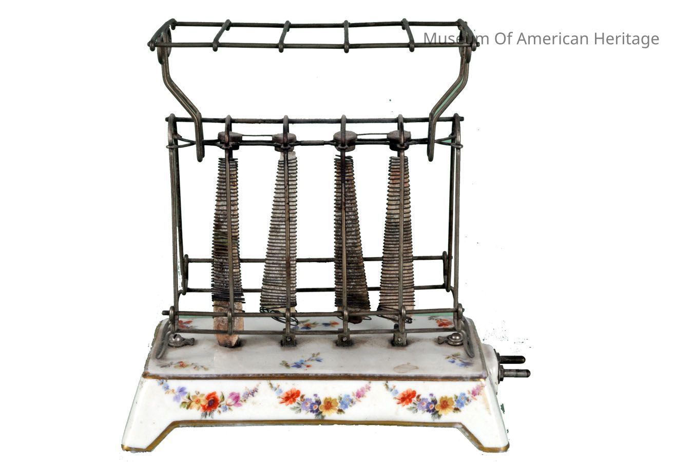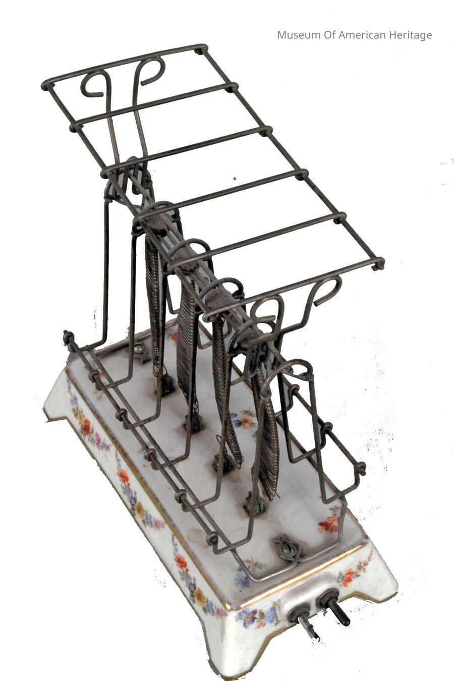 Flowers painted on ceramic base, warming rack on top. GE's first electric toaster, $4 (plus $1.50 for the cord) Artifact label in filing cabinet.