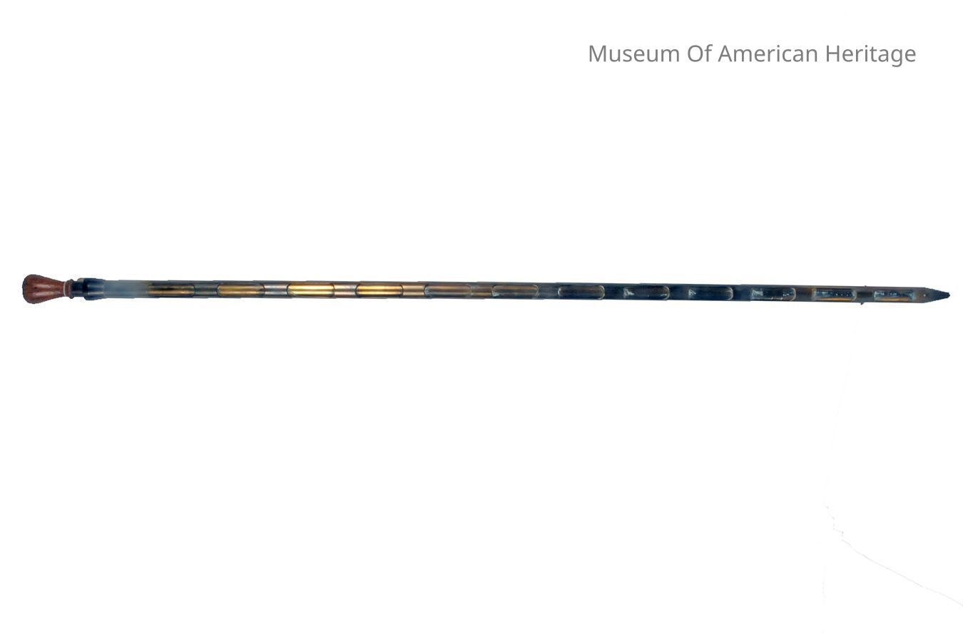long cylindrical probe with 12 individual compartments. twist top knob to open and close compartments to trap grain. used to sample grain at various depths in a container. 32 stamped inside top most container.