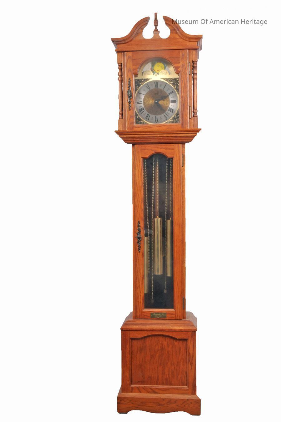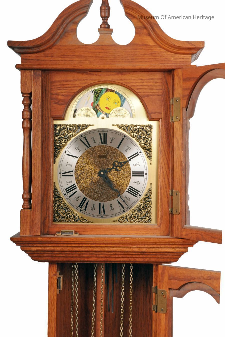 Moving moon dial w/lunar calendar shape. Weights strikes famous Westminster. Chimes four times an hour. Cost $129.50 in 1972. Solid brass dial.