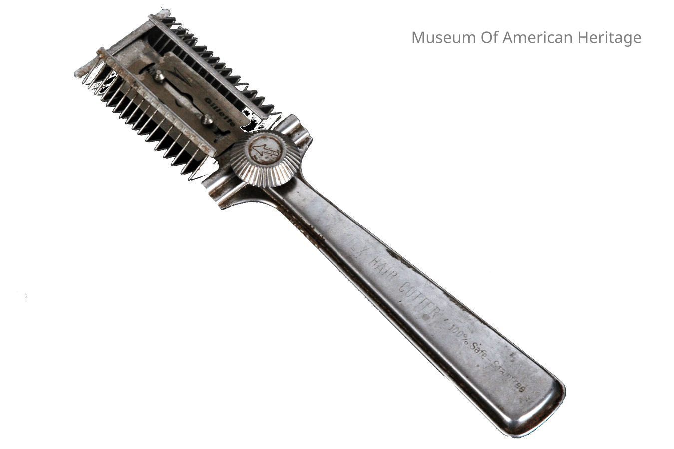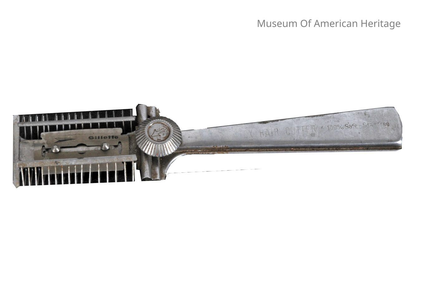 Uses double edge razor blade to trim hair, original cost $2.95.