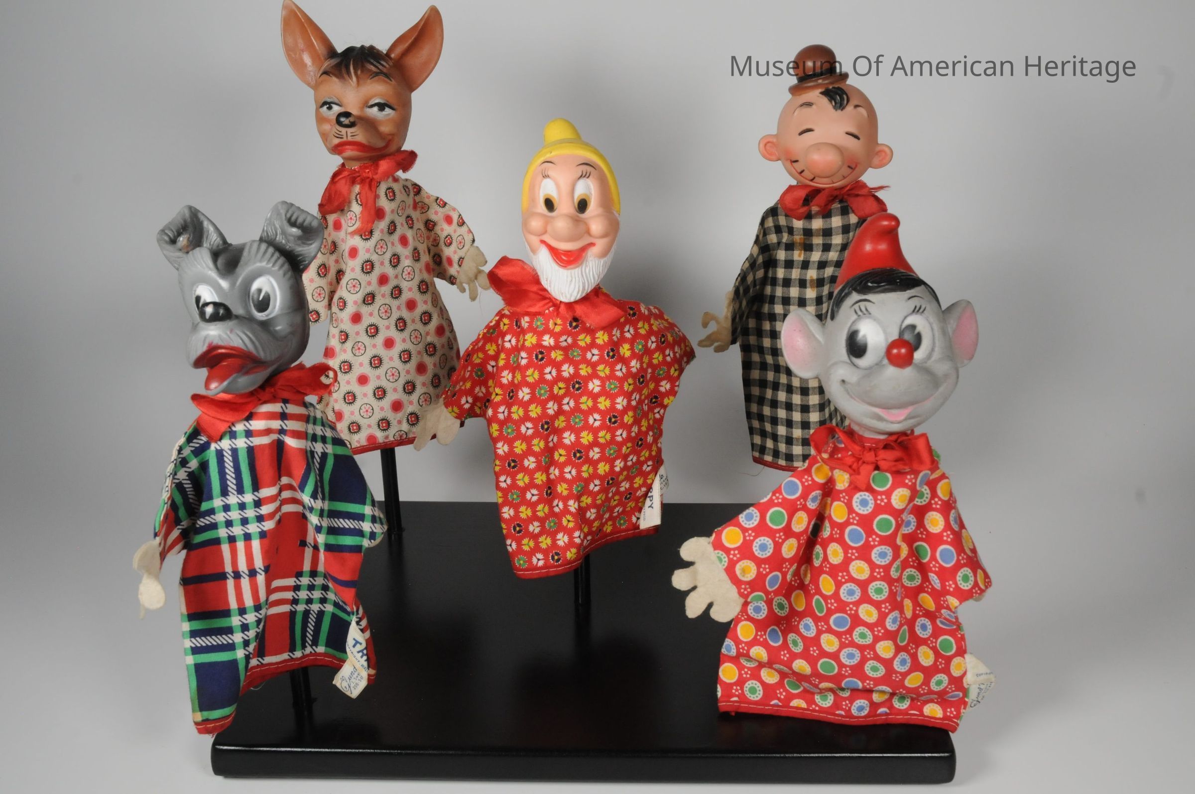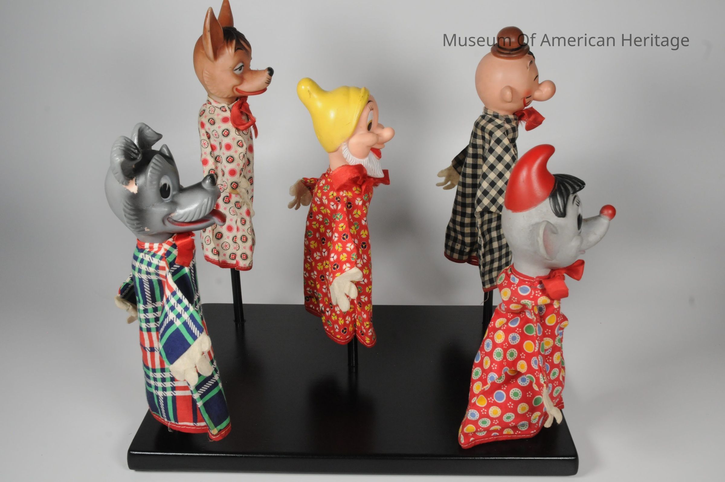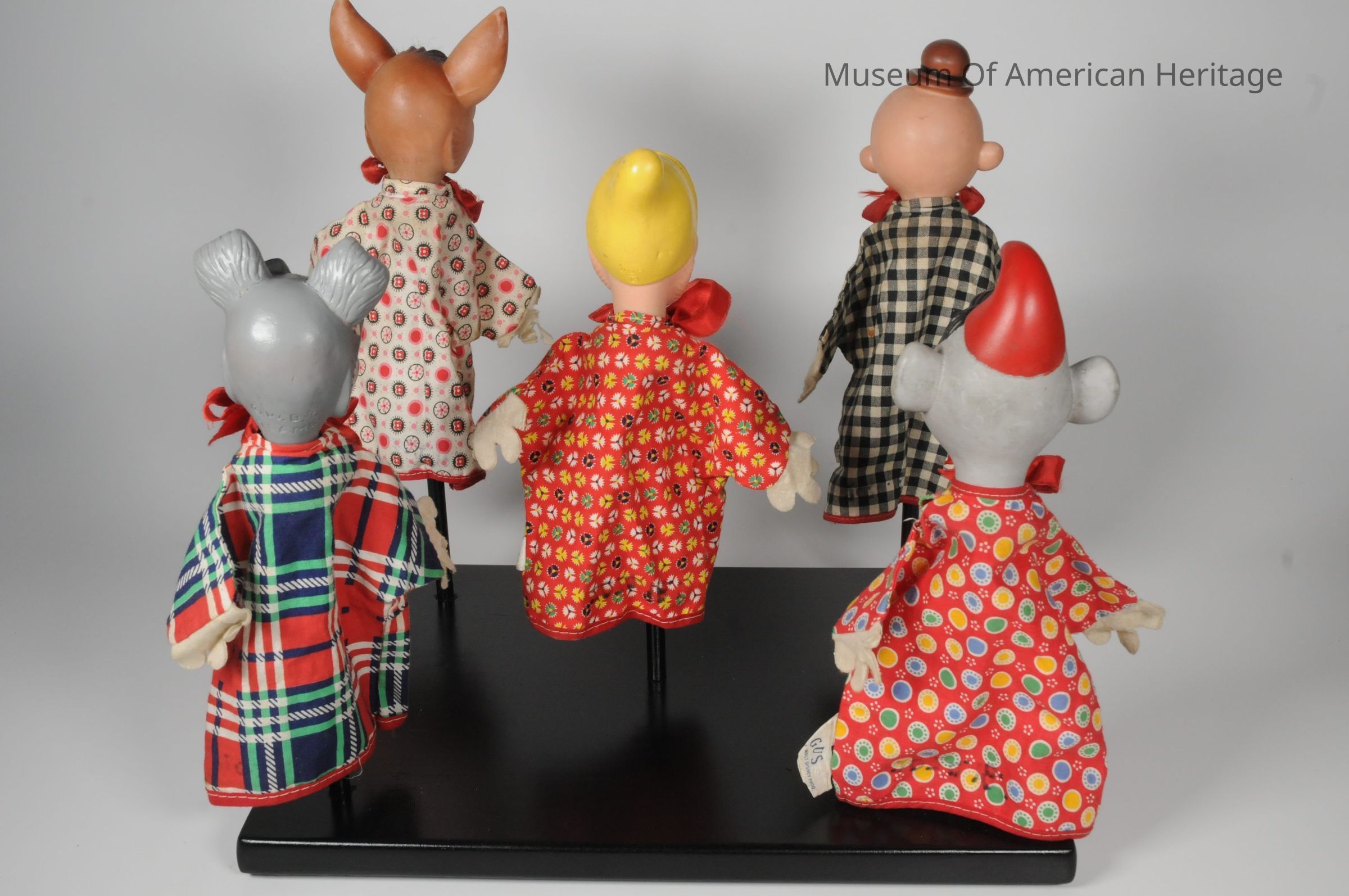 Four puppets are Walt Disney characters: Gus, Happy, Pedro and Tramp.One is a King Feature Syndicate character; Wimpy Display base is not original