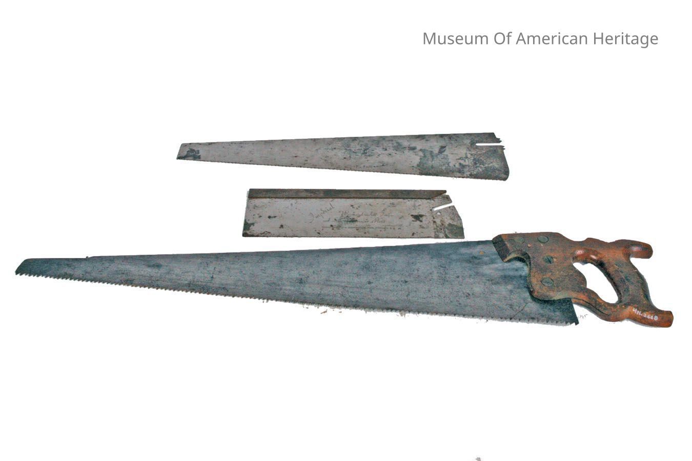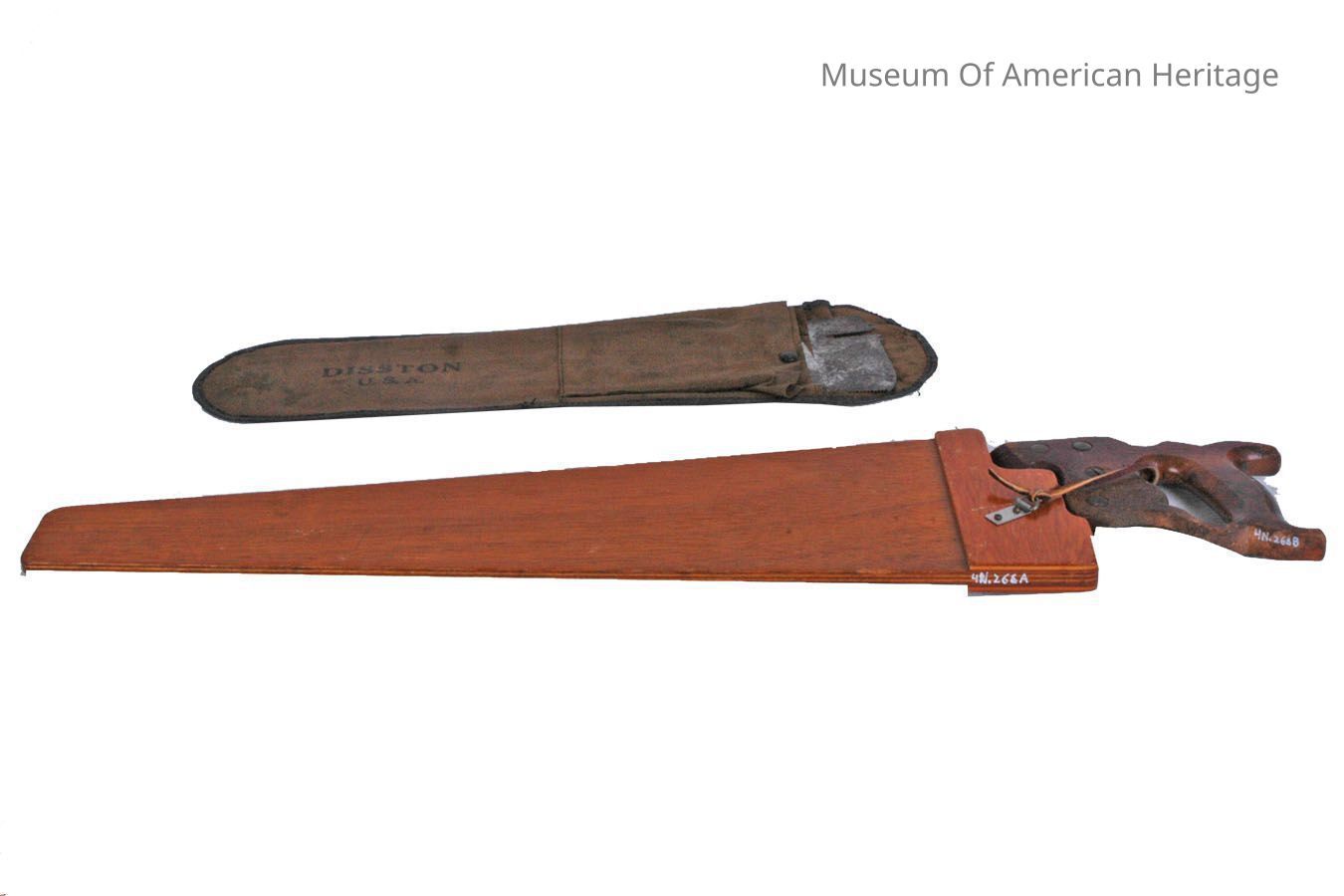 A,B: Hand Saw in wood case with Paul Kajola written on it. C,D: Spare blades (C is not a Diston Saw blade). E: Olive colored cloth sheath for the spare blades.