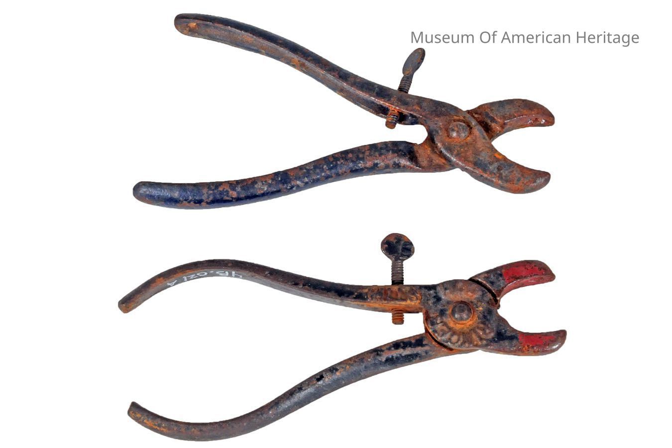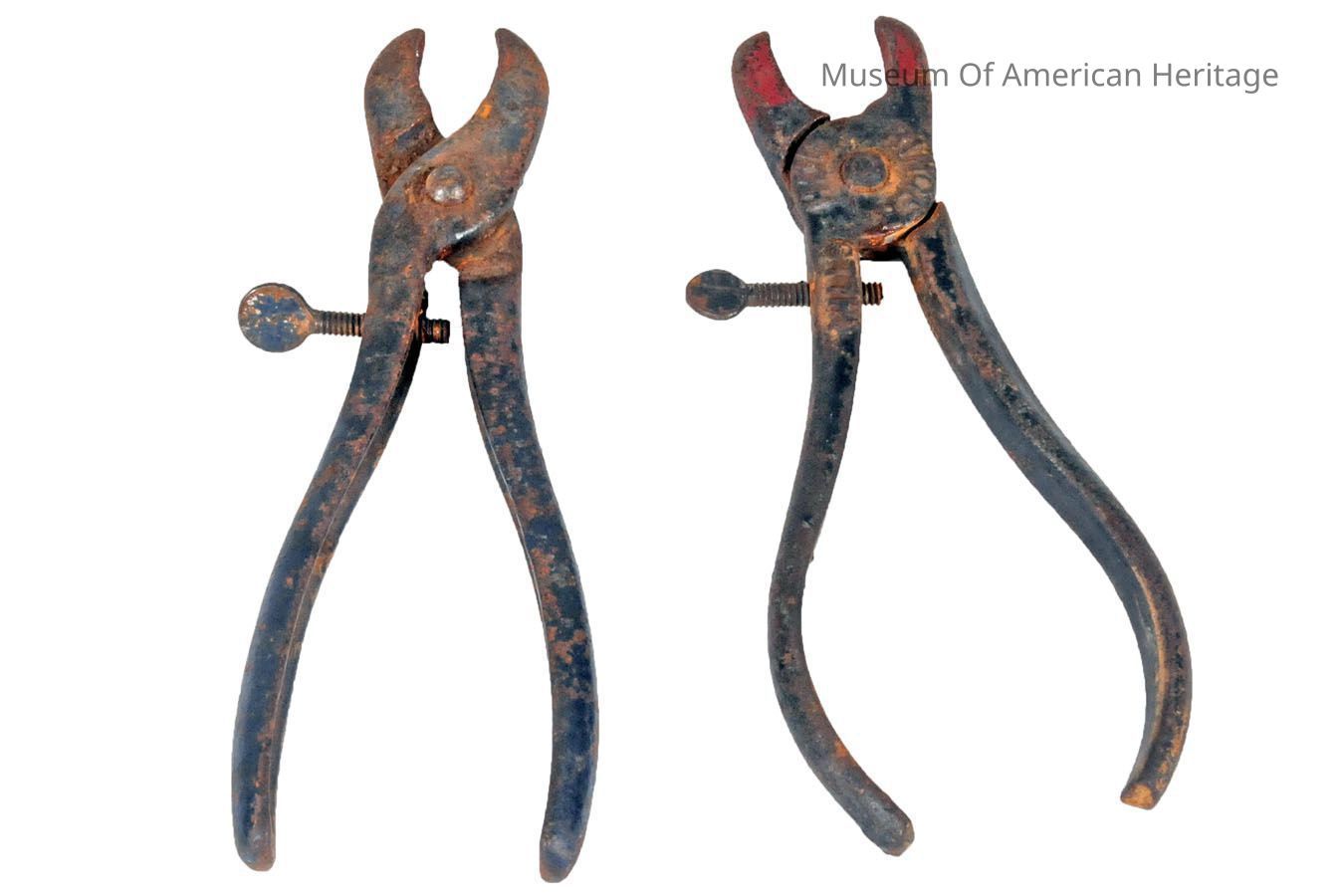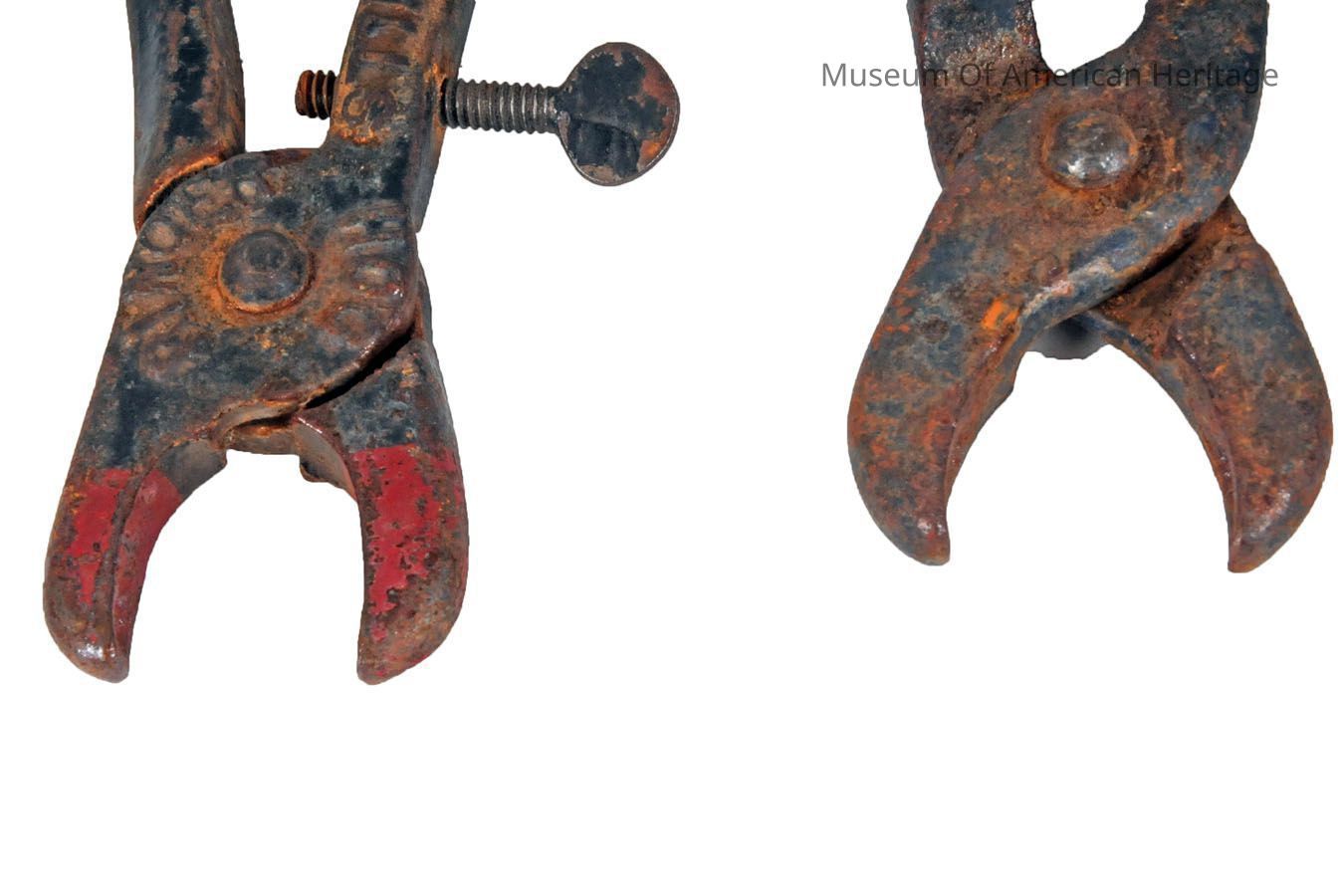 A, Hills Hog Ringer, Pat. Aug. 1872. B, Unlabeled hog ringer. Originally used to fasten a ring through a hog s nose. Used now for anything that requires a metal section to be squeezed close.