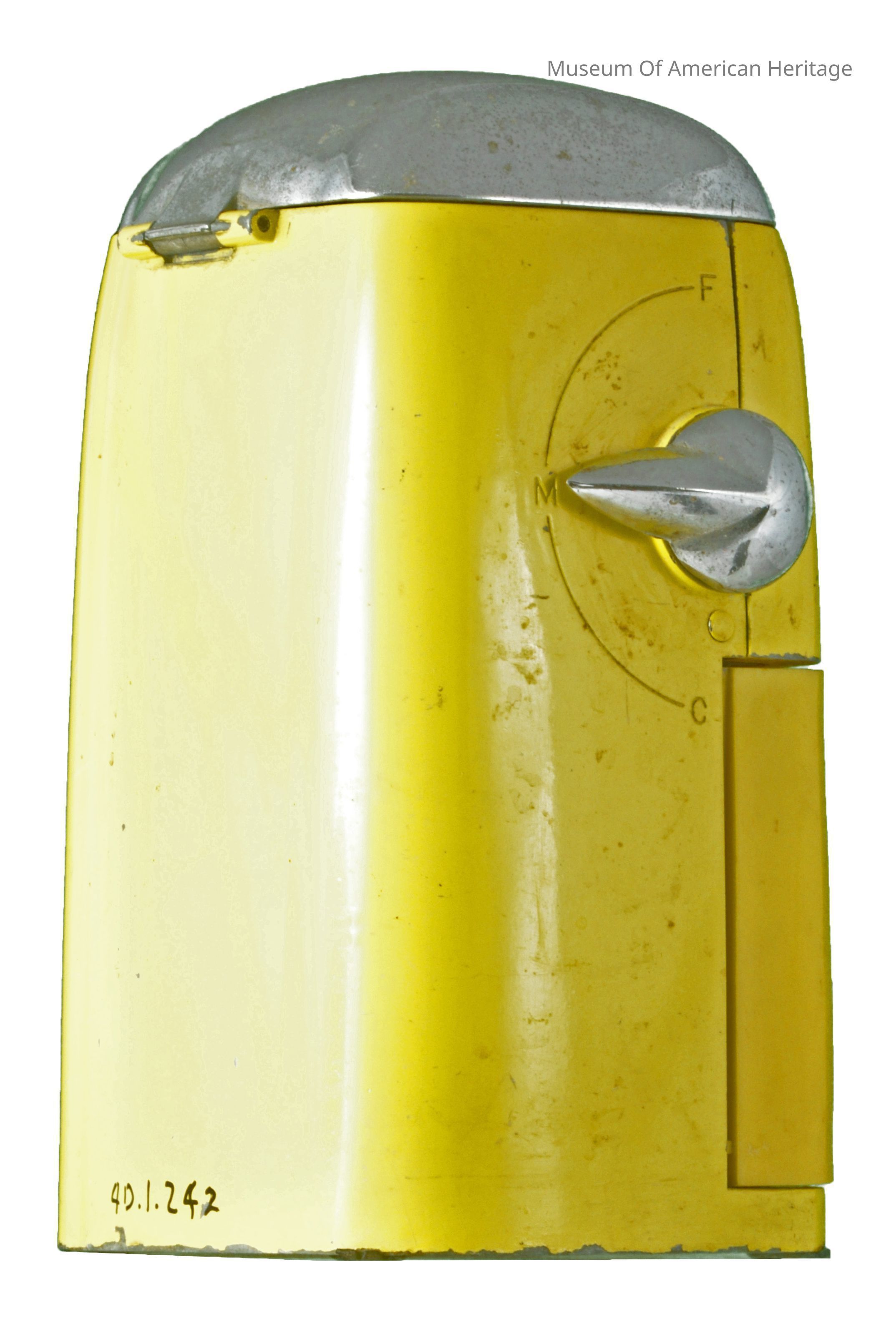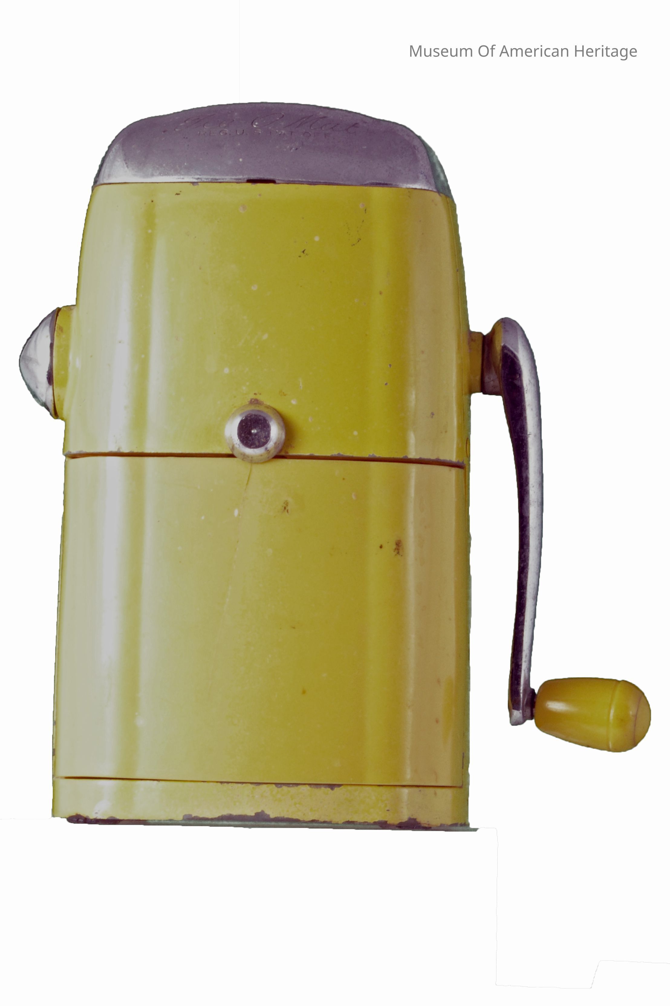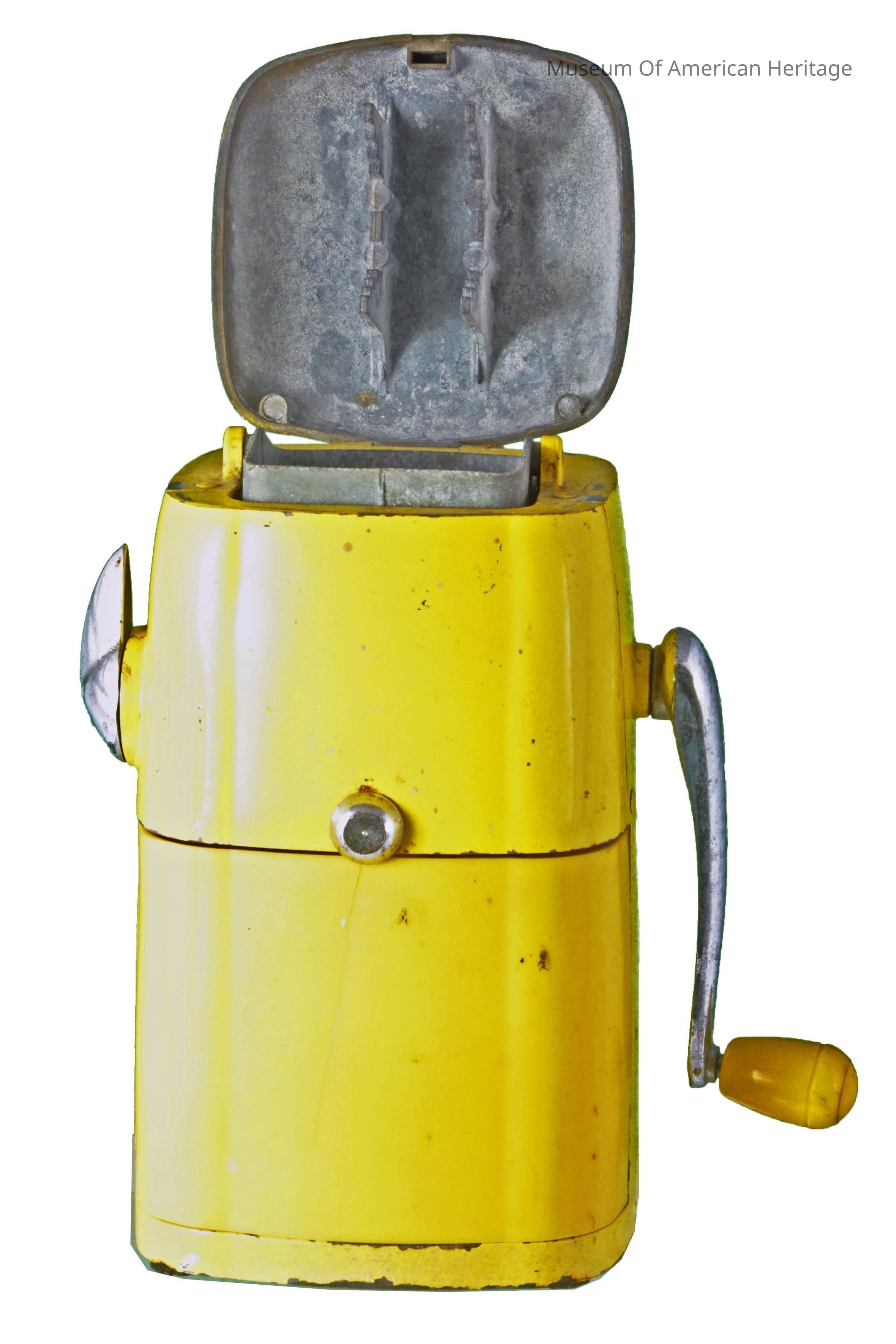 Hand crank, fine or coarse ice adjustment, plastic (cracked) to hold crushed ice.