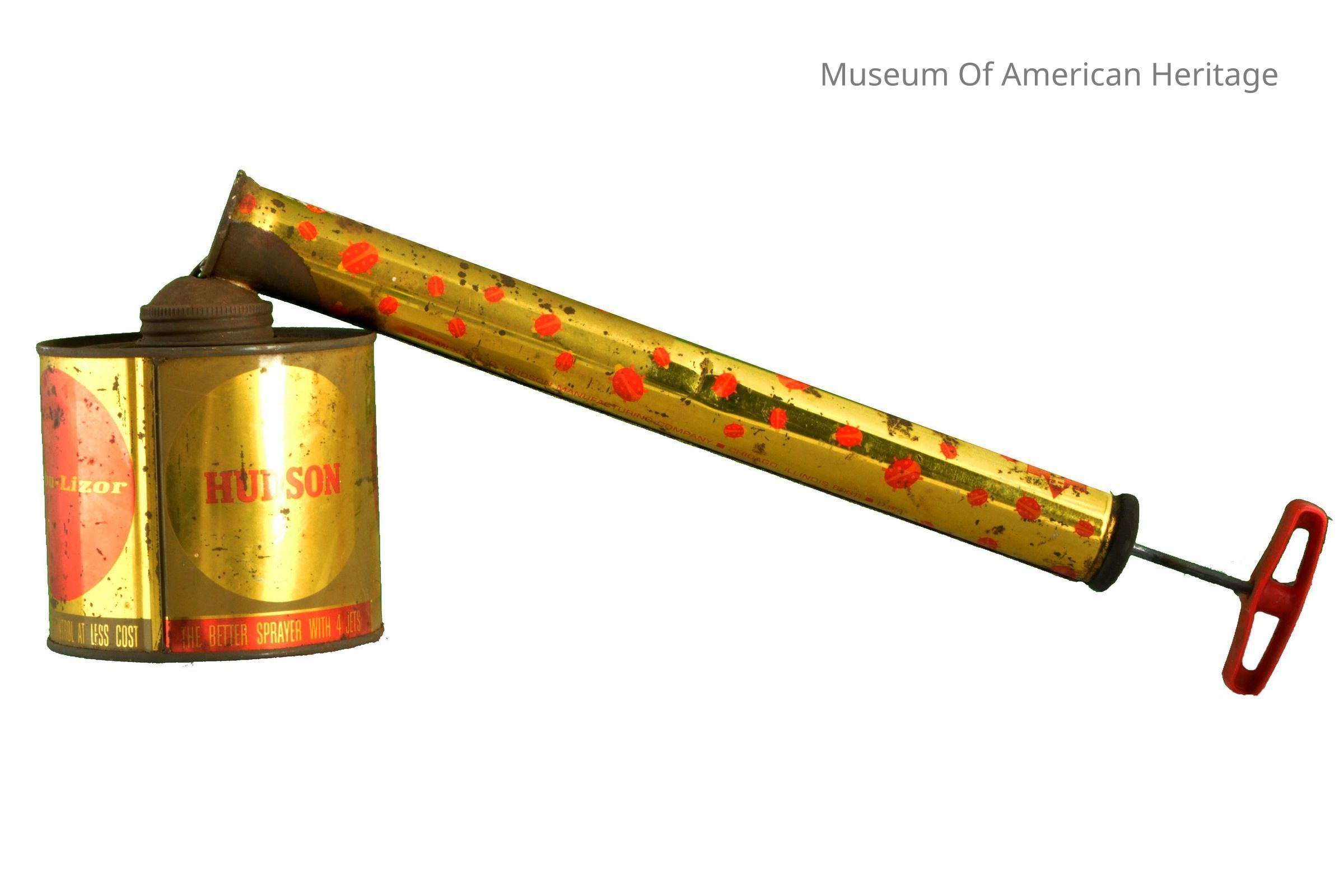 Red plastic pump handle, Good Housekeeping recommended, hand pump operation, sold by Hubbard & Johnson Lumber Co., Palo Alto, known as a Flit .