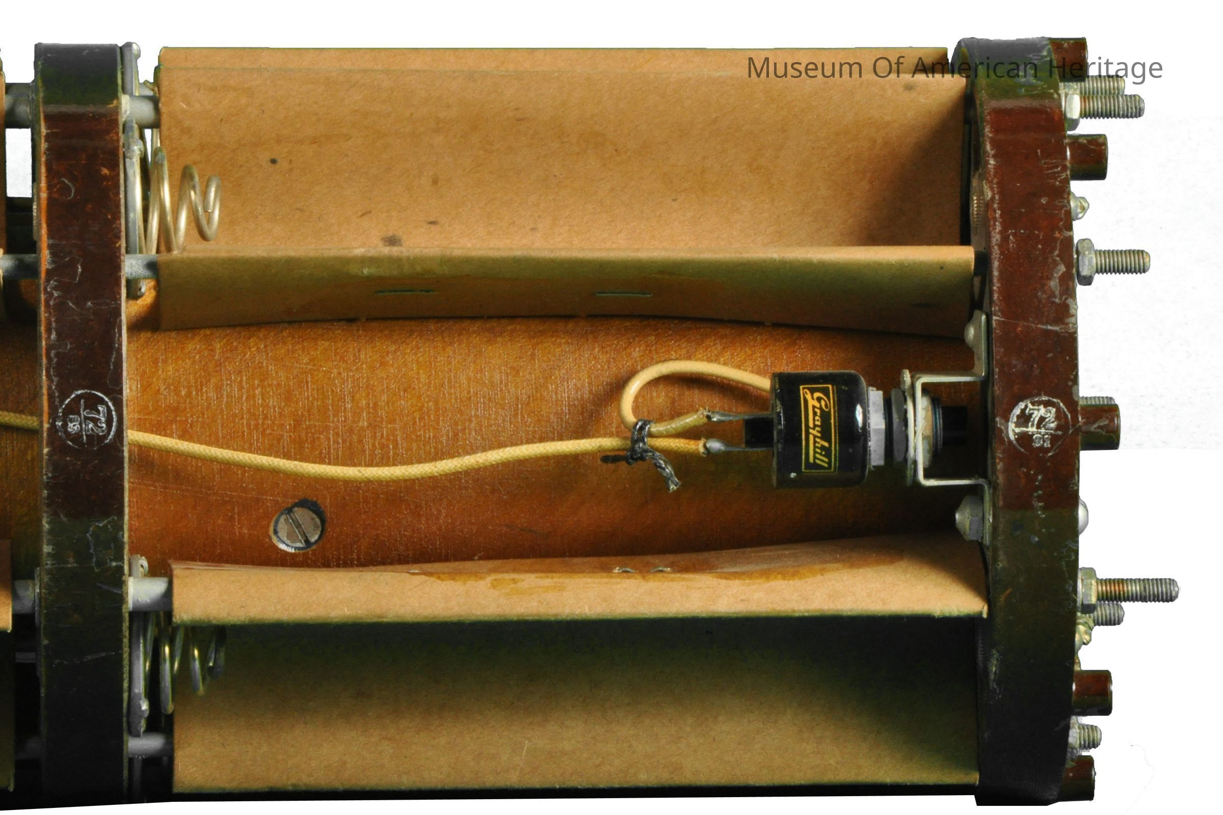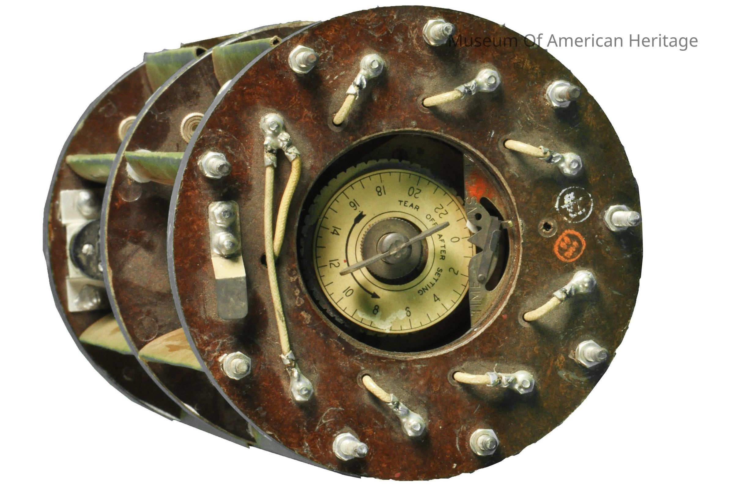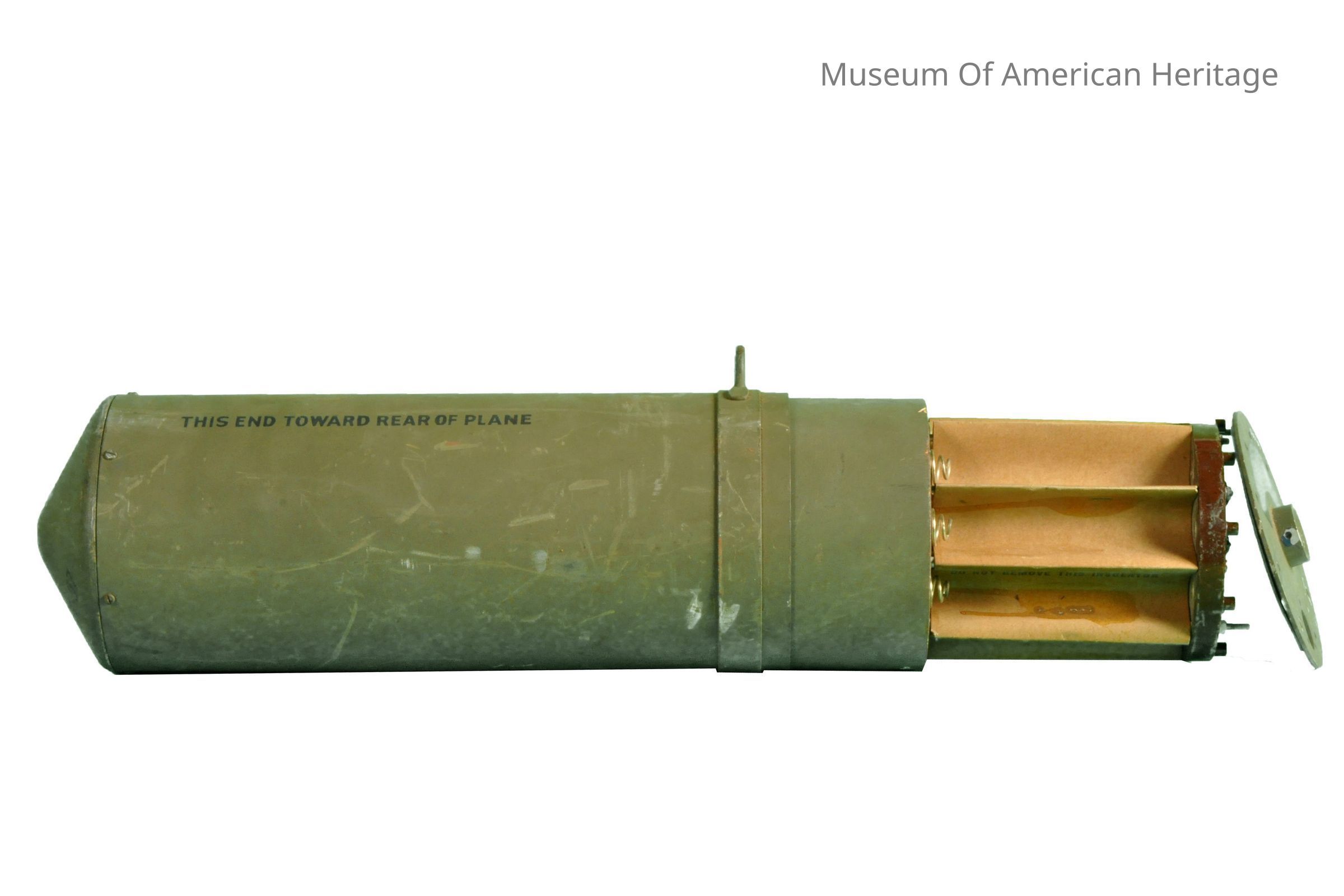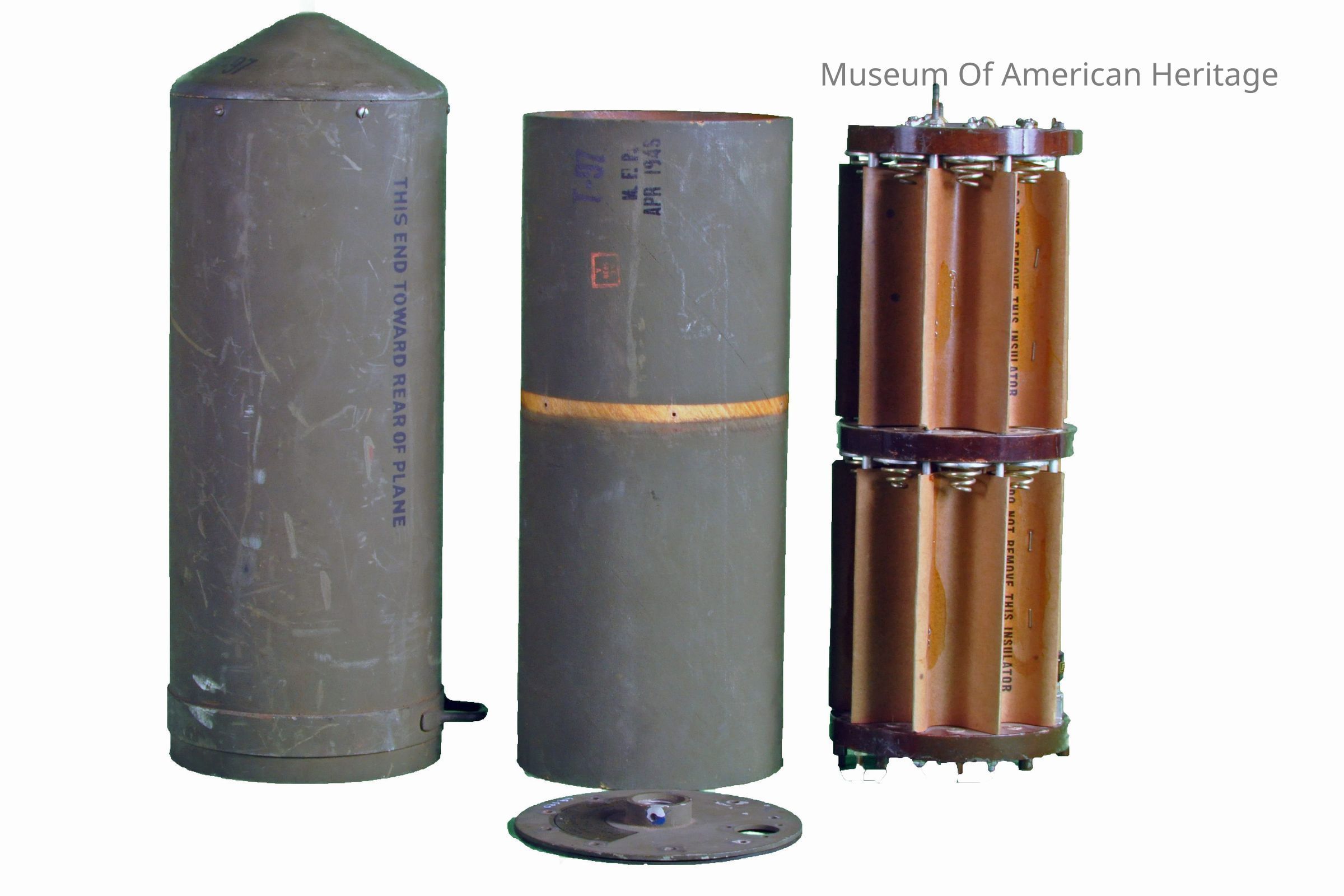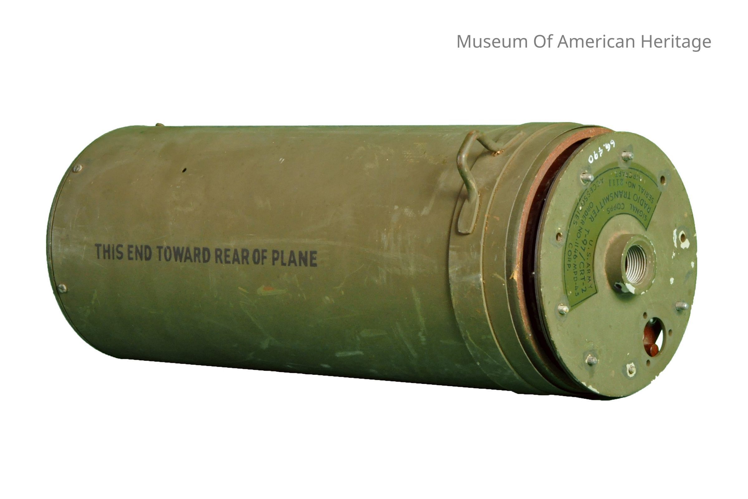 Uses 14 approx. 1 dia x 6 long batteries, timer with thumb key, scale 0 to 24 (minutes?), D ring for attaching parachute, dropped from air plane to jam enemy radios.