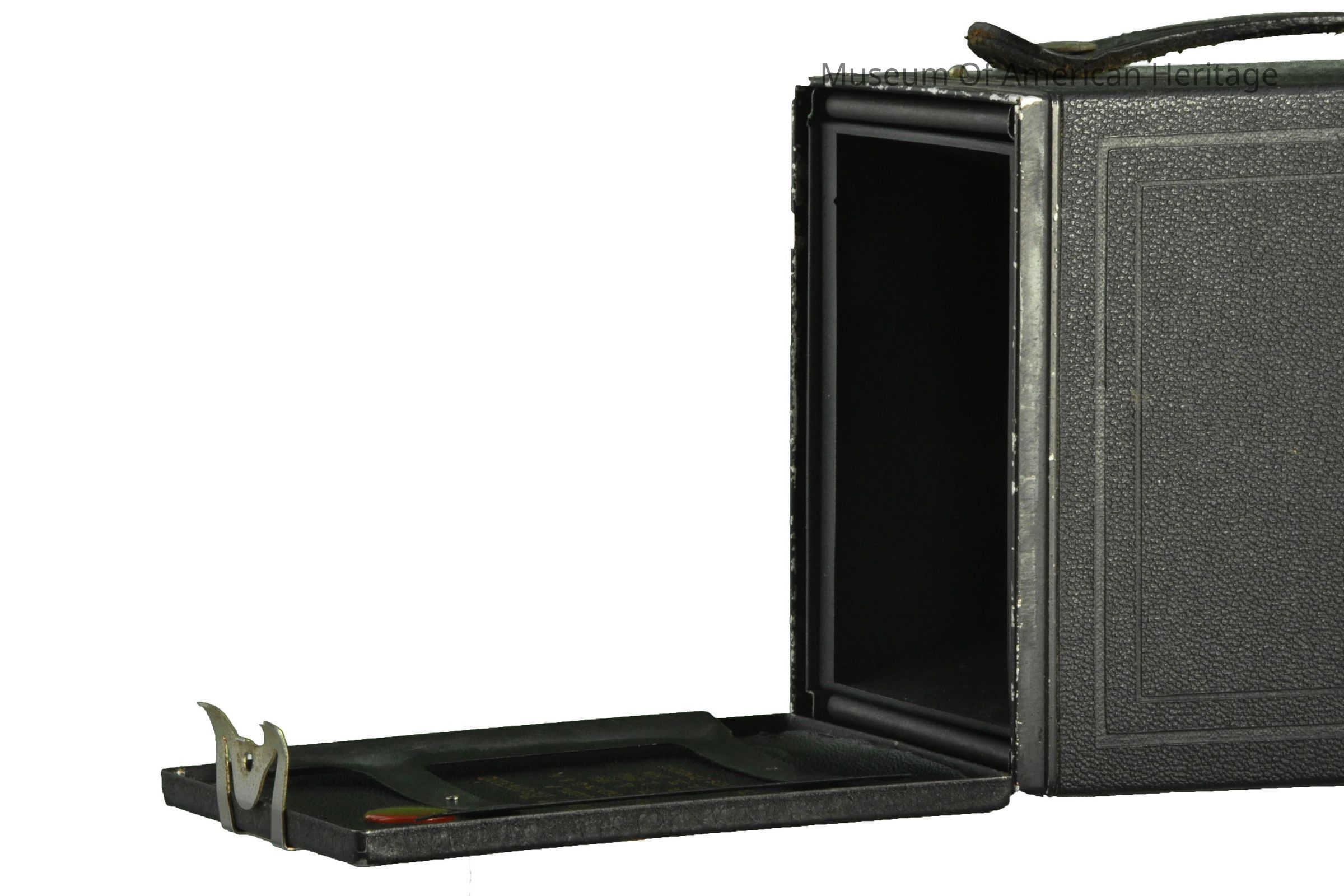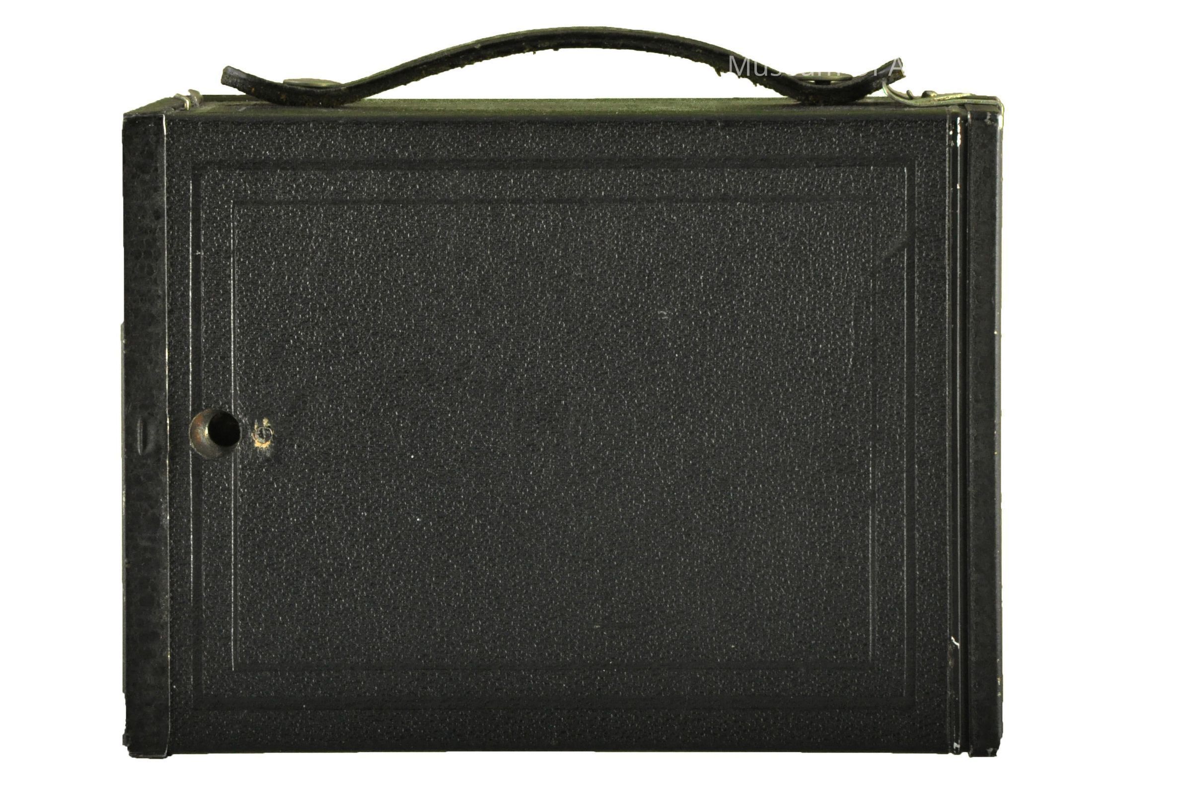 Back open to load film, winder on right side, top & side viewers, leather strap on top marked Brownie.