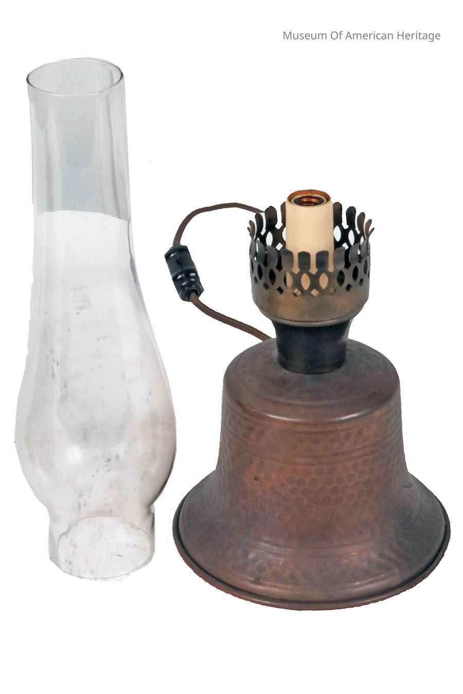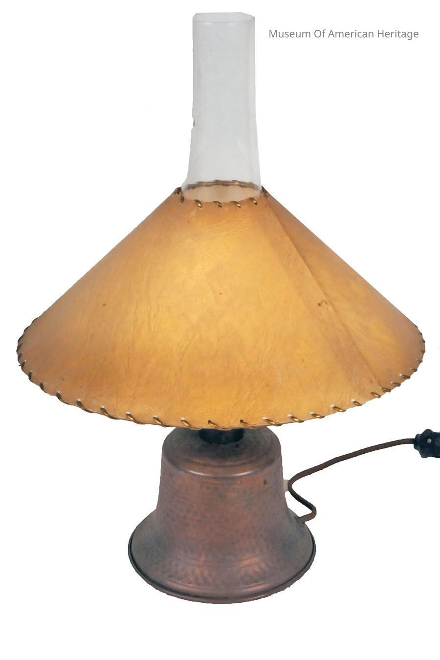 hammered copper base, glass chimney. paper shade with edge stitching.