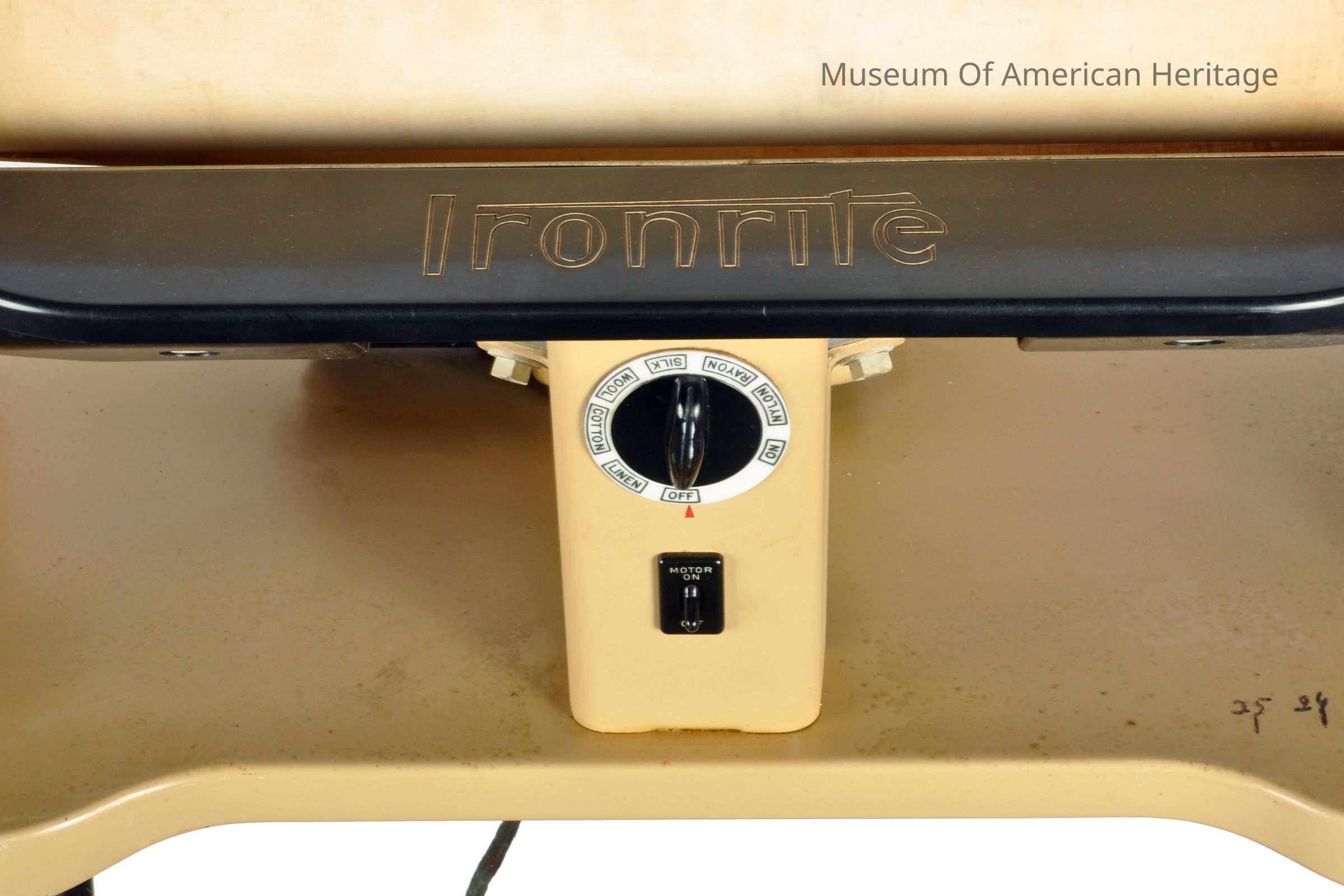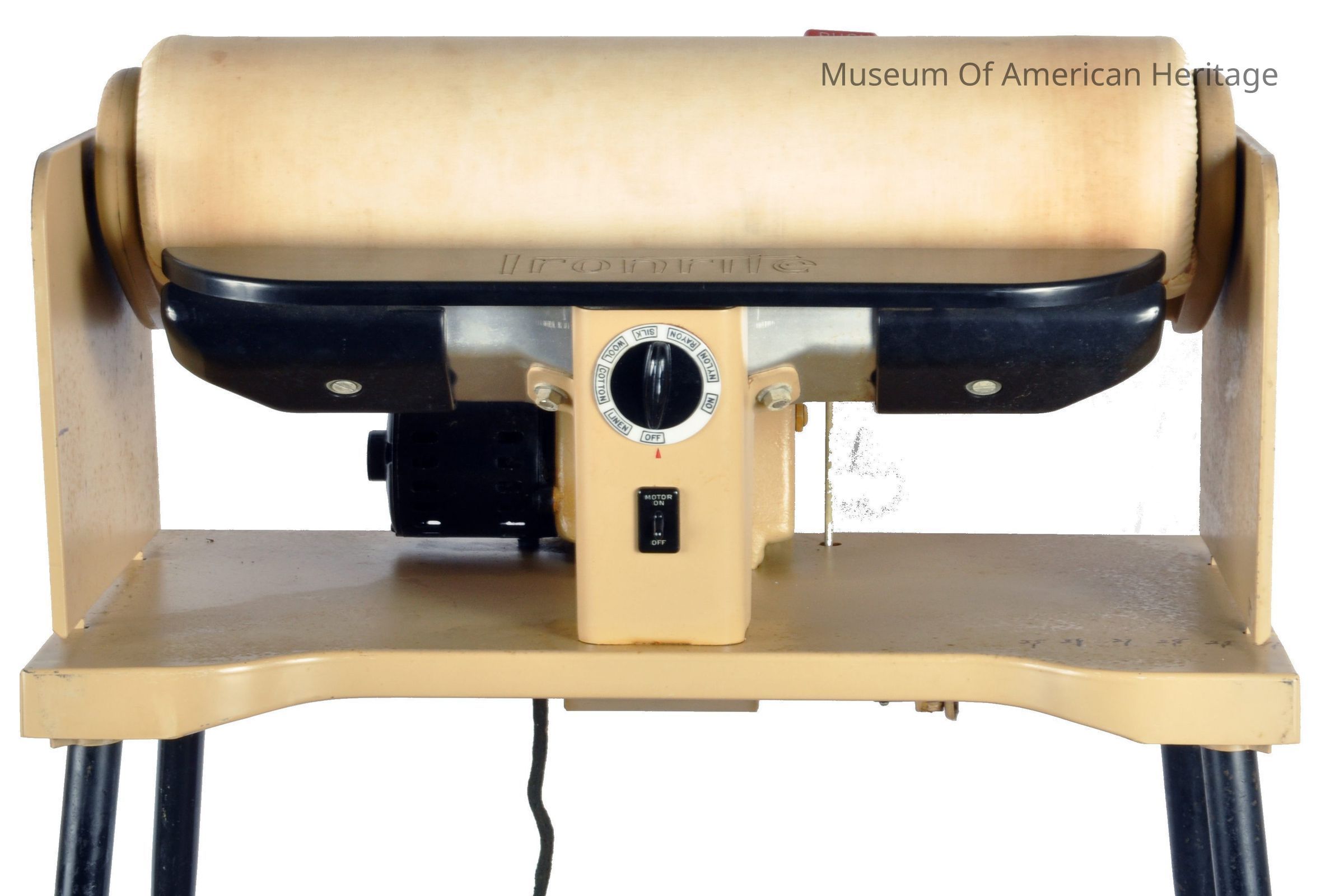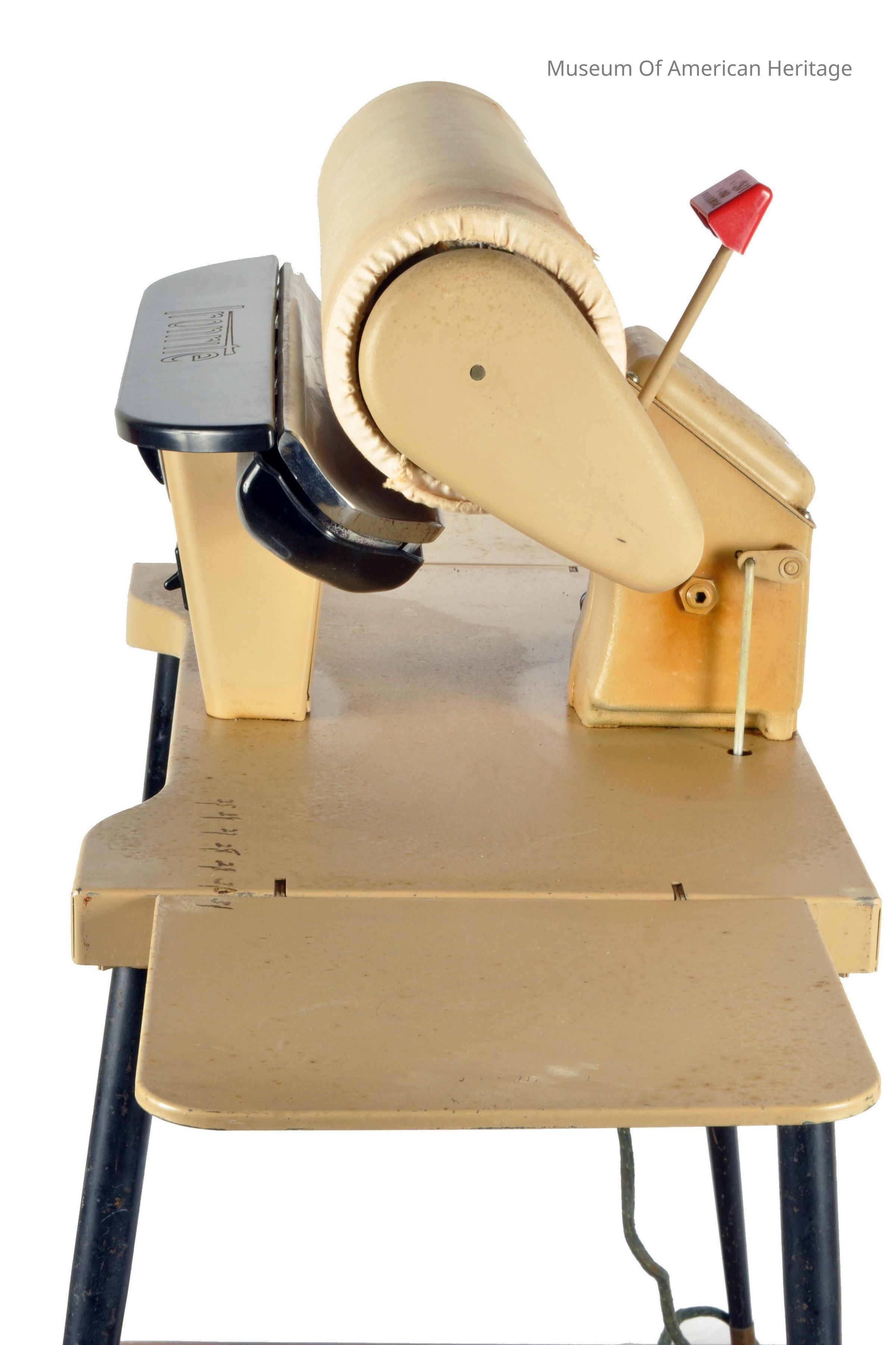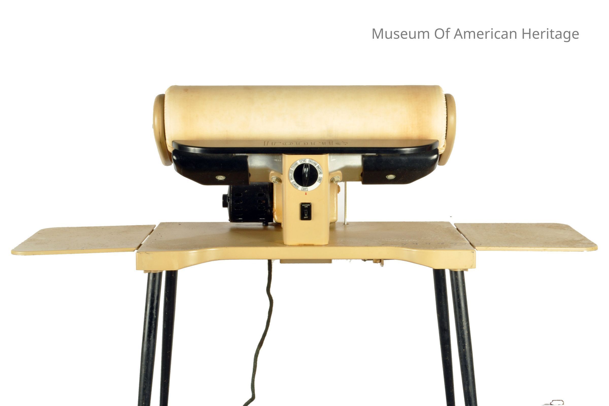 Apartment size, rotary temp control, toggle switch, motor by GE, folding side wings, cast iron heated shoe, with manual, wood removable cover.