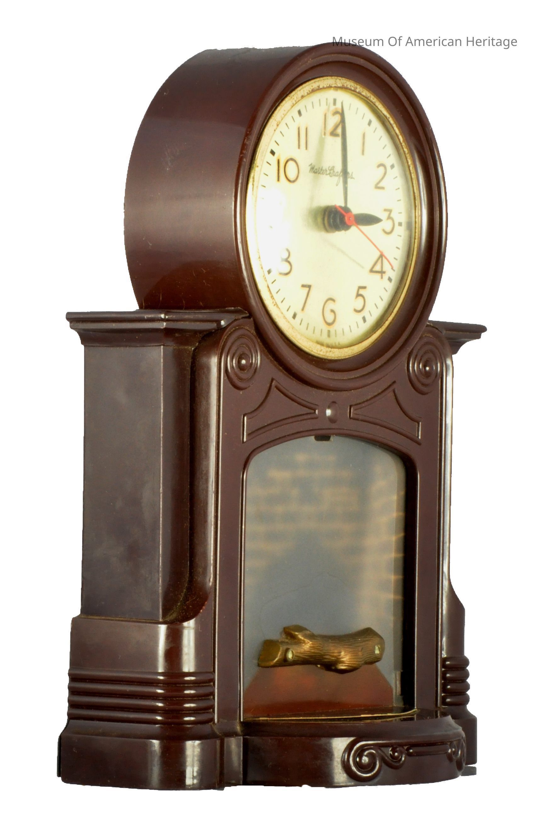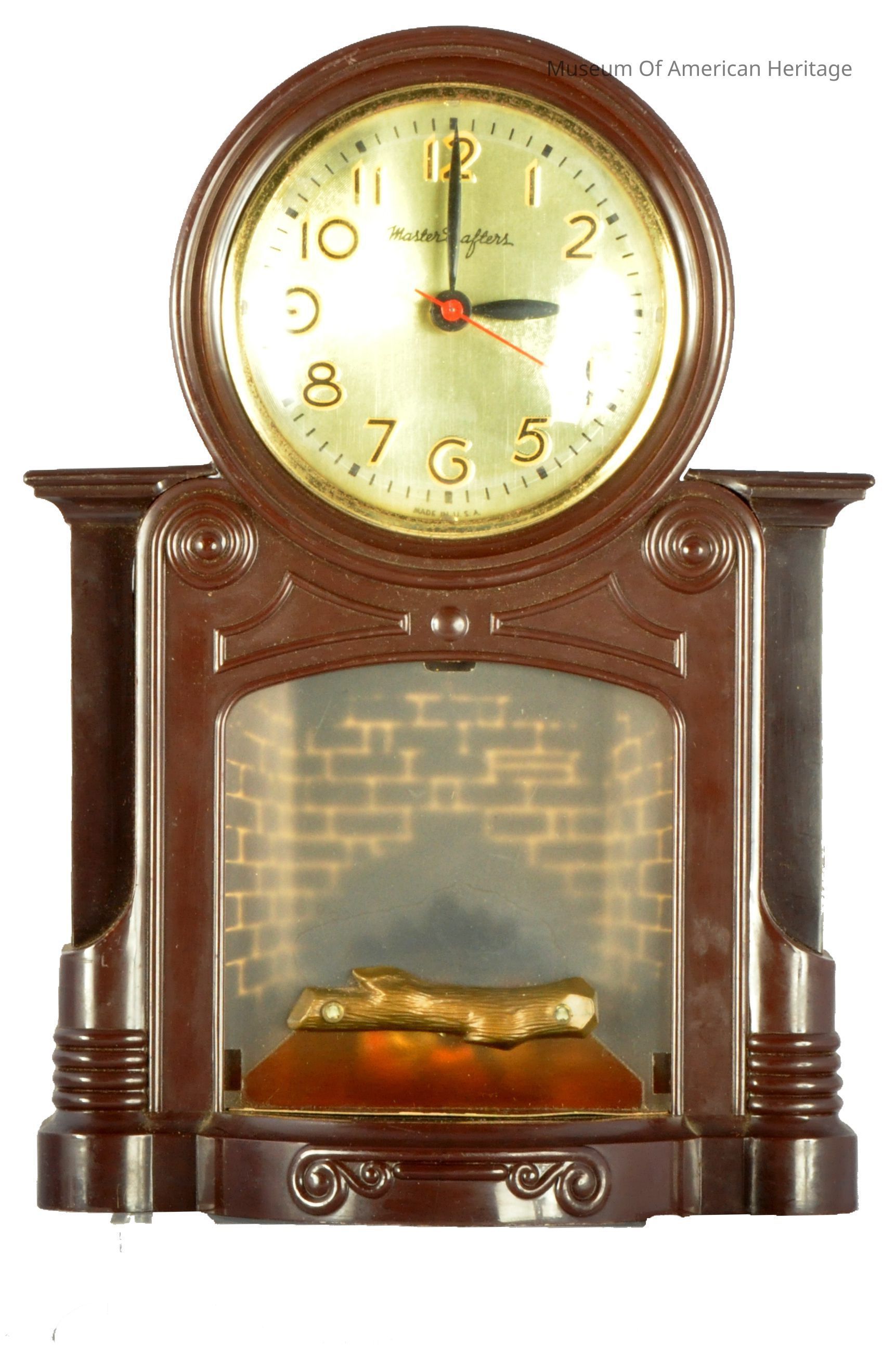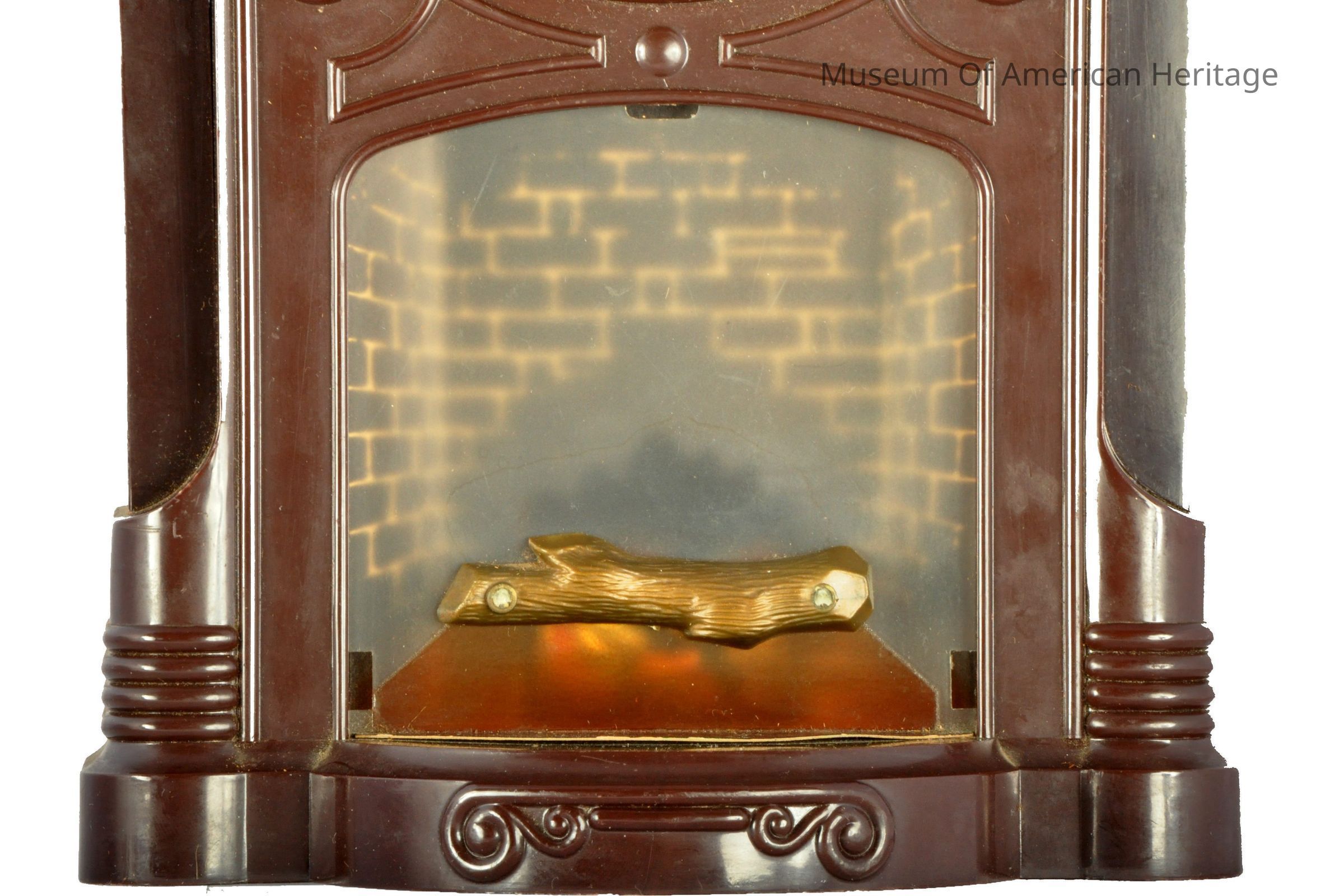 Fireplace scene with logs, behind glass front, round clock on Mantel body, round gilt face.