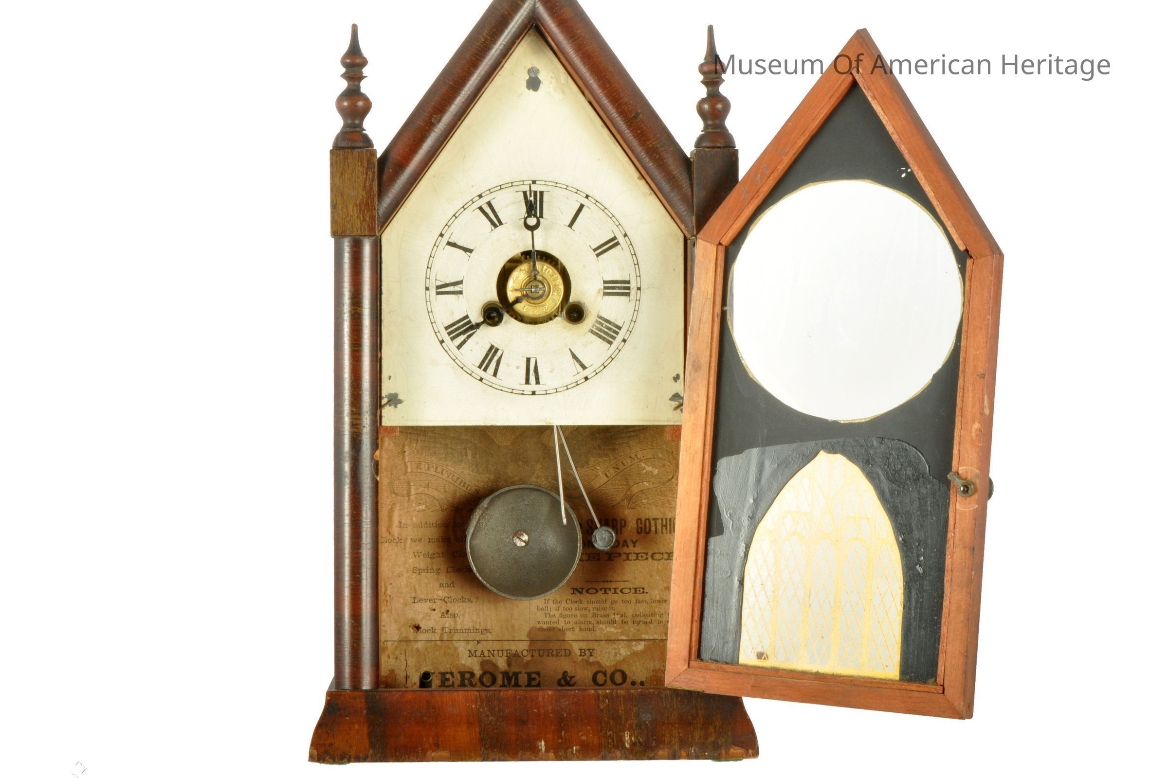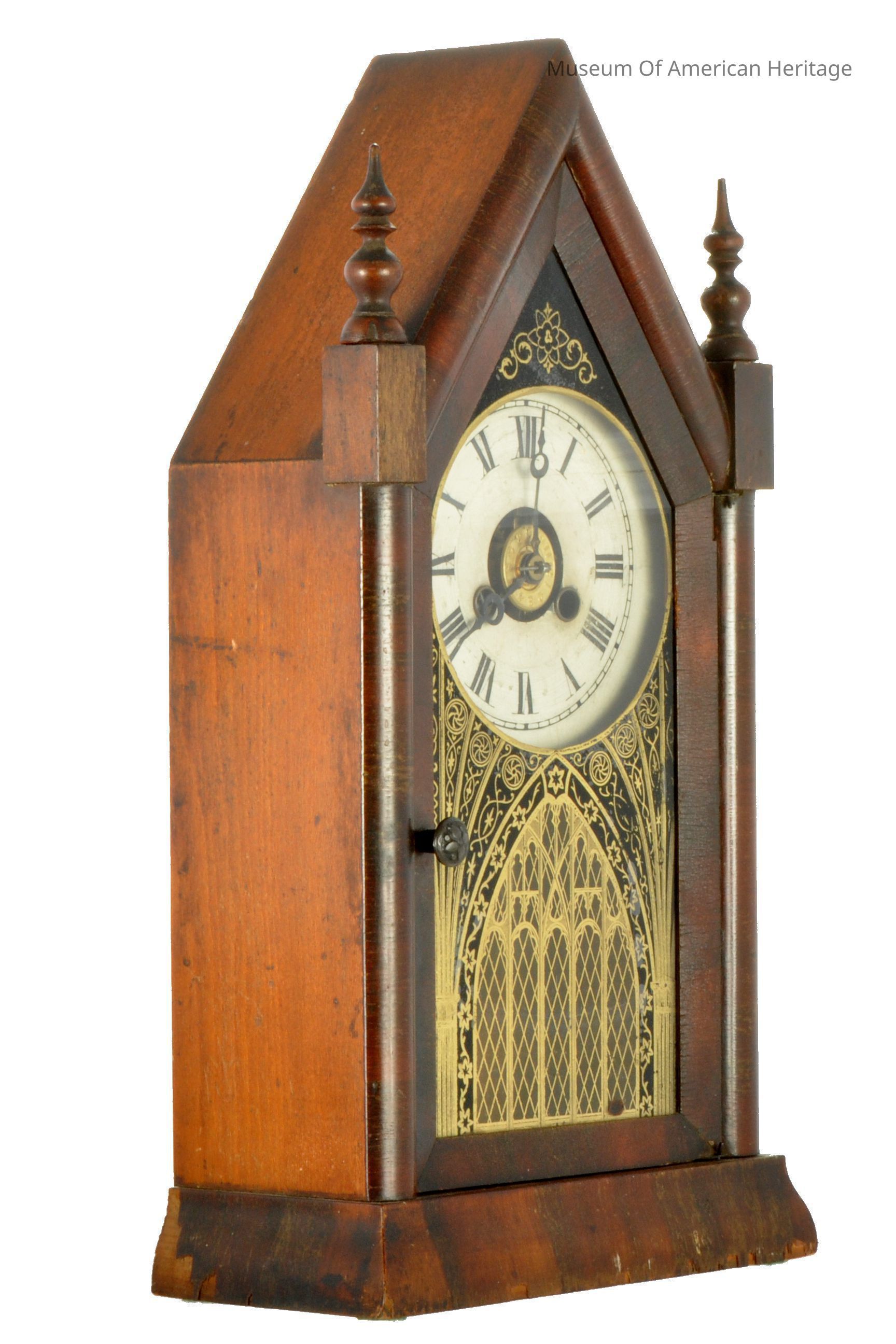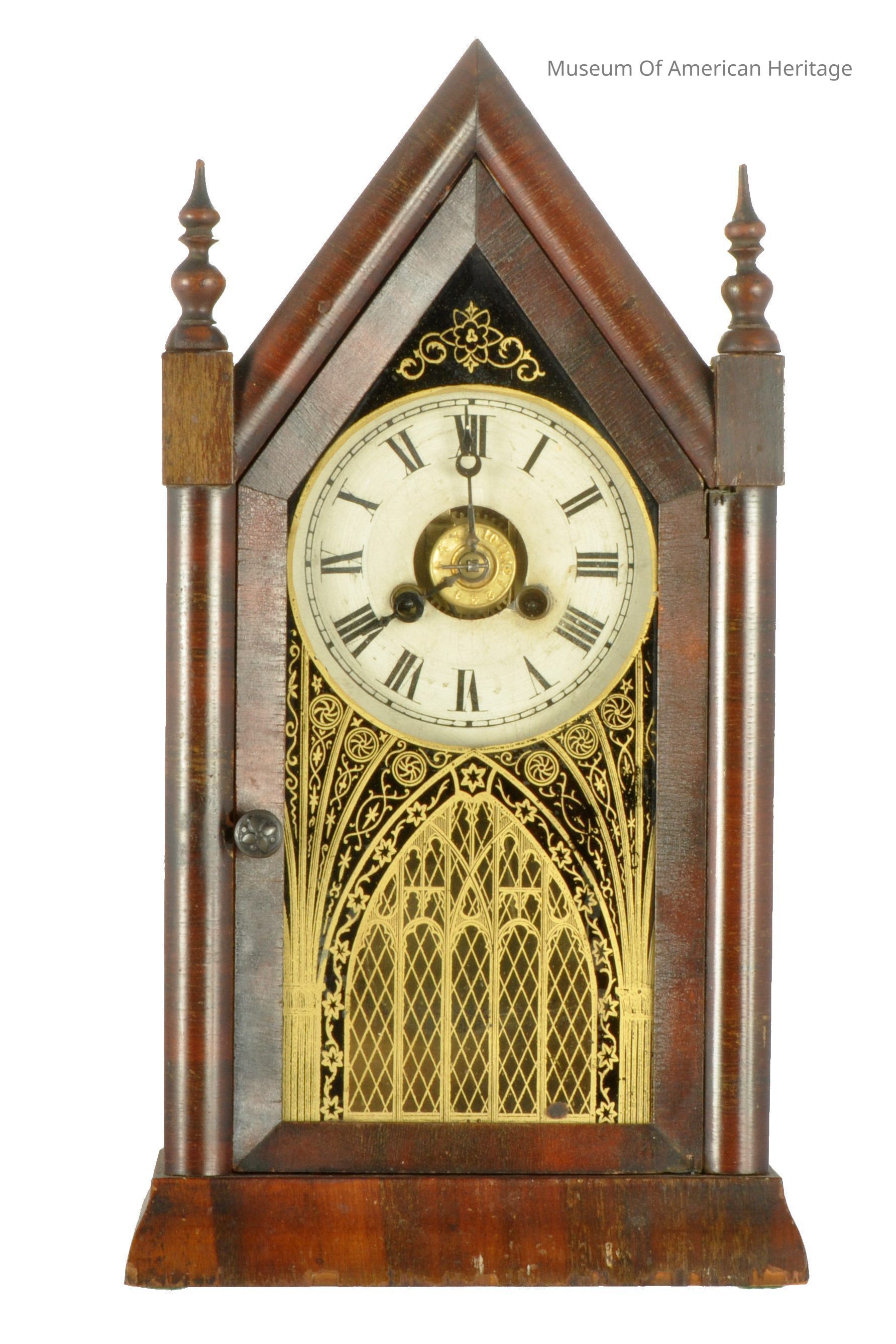 One day timepiece, key wound, pendulum, wood framed glass door, gold cathedral decor, two wood finials.