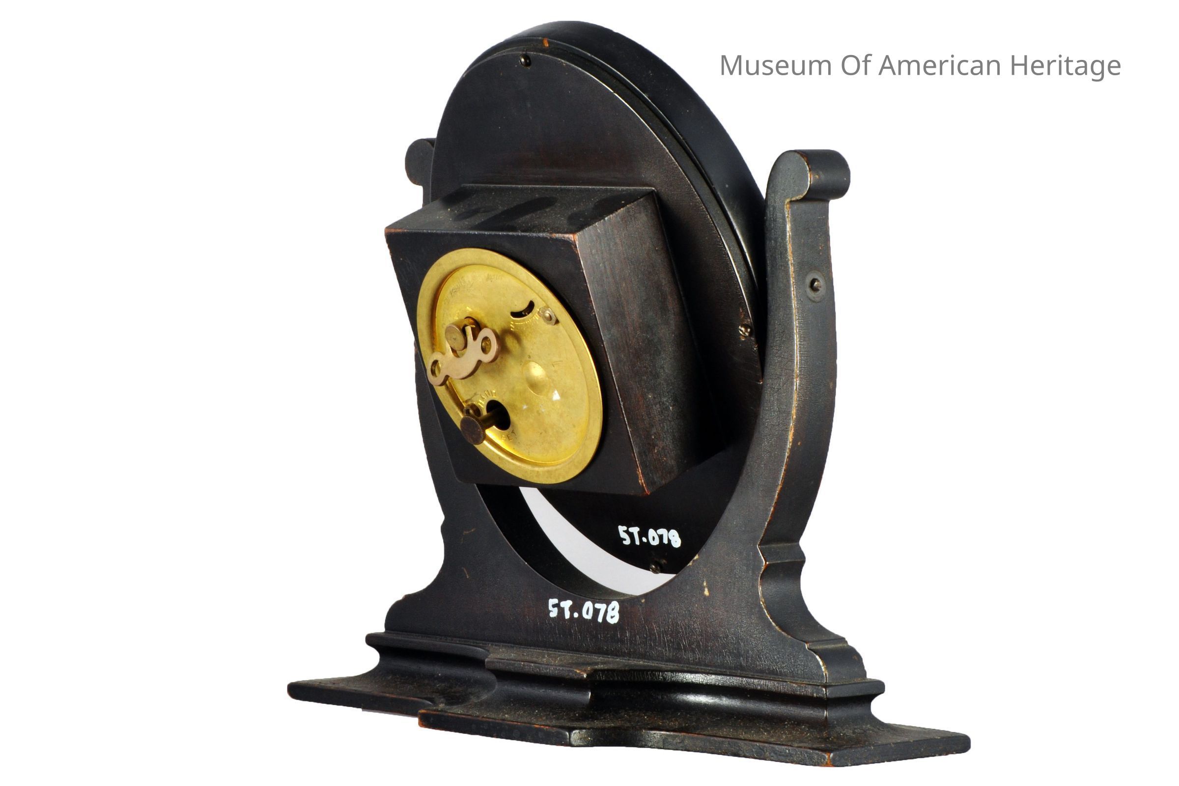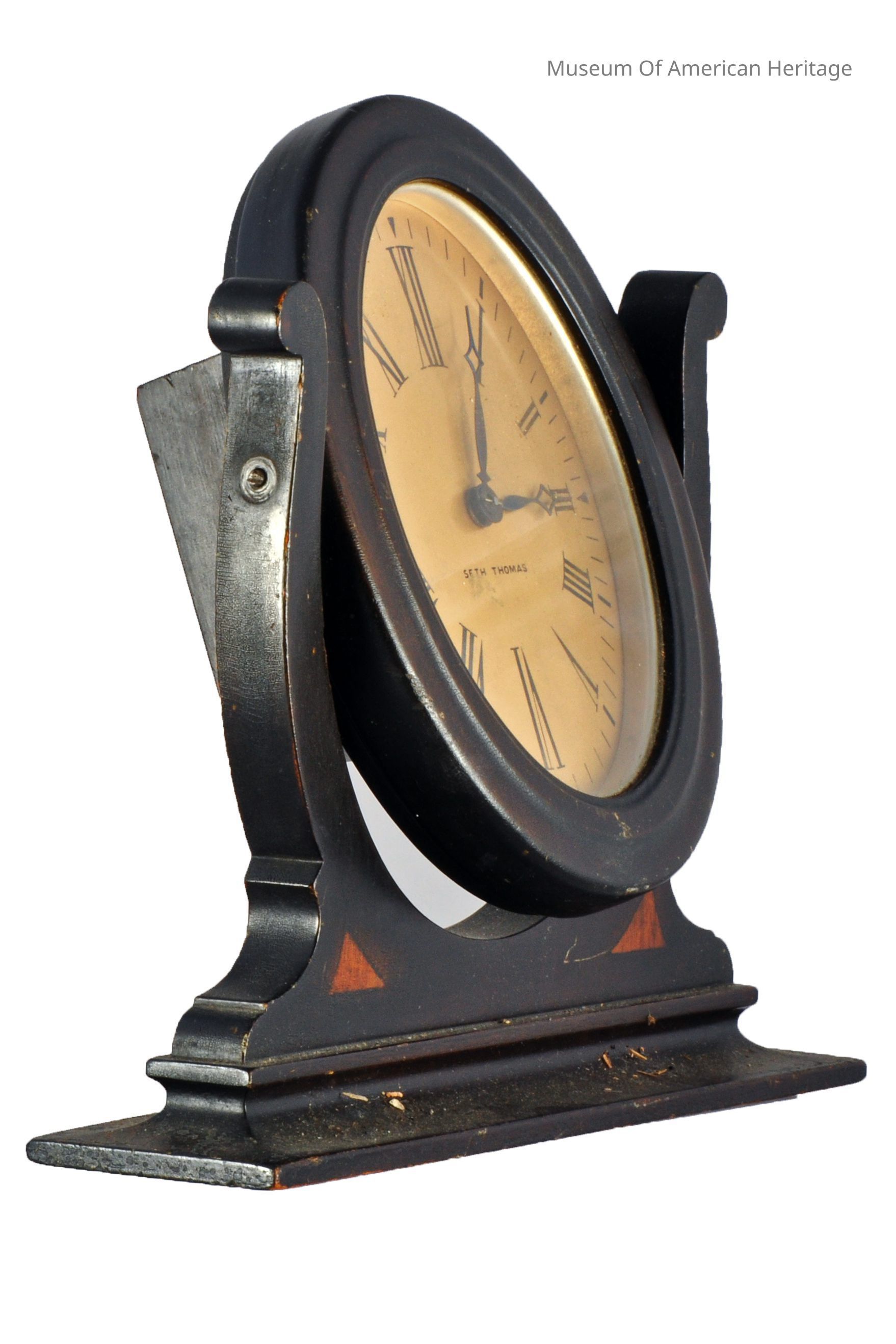 Oval clock, swivels in horseshoe shaped frame on base, black numerals on gold face.