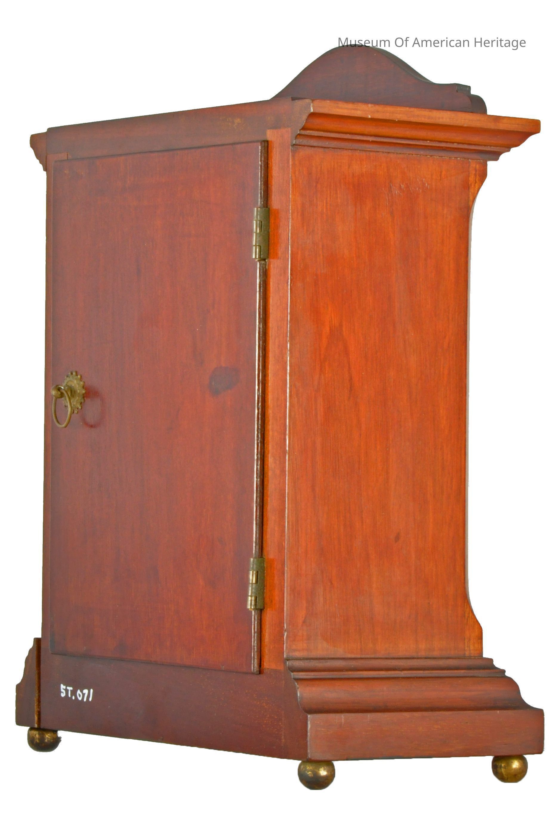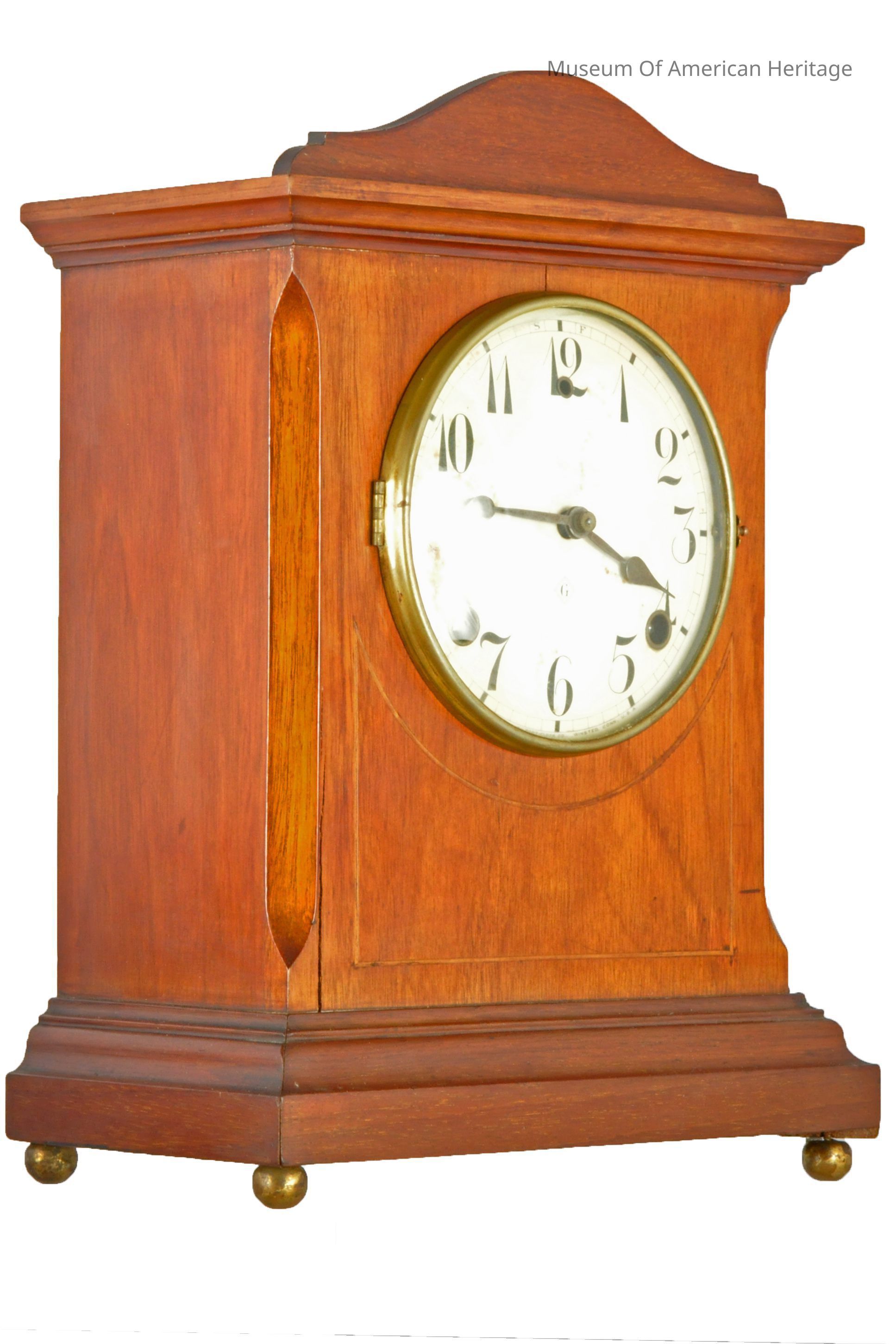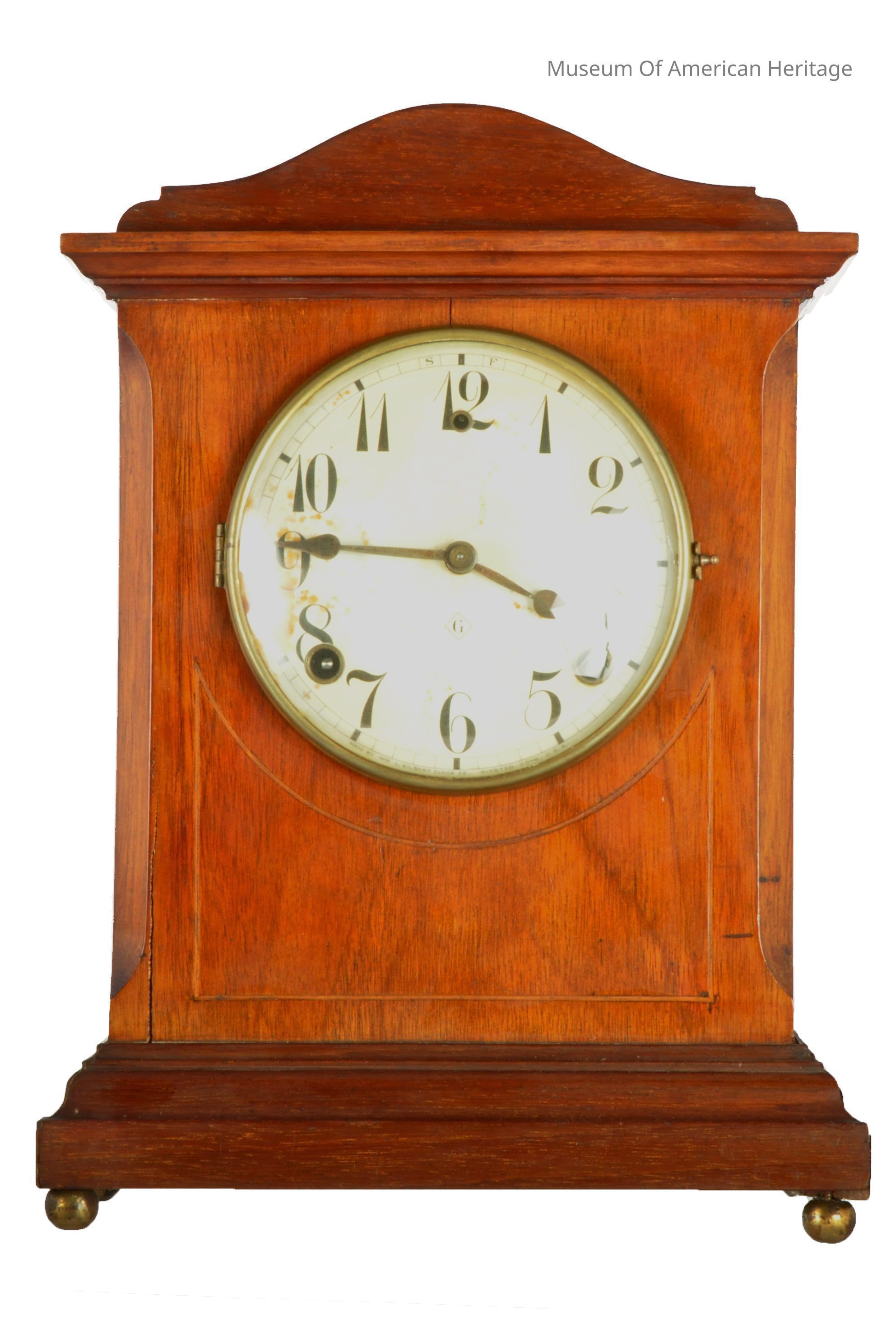 Letter G in square on face, face white w/black numerals, light color wood inlay on front, 4 small brass ball feet.