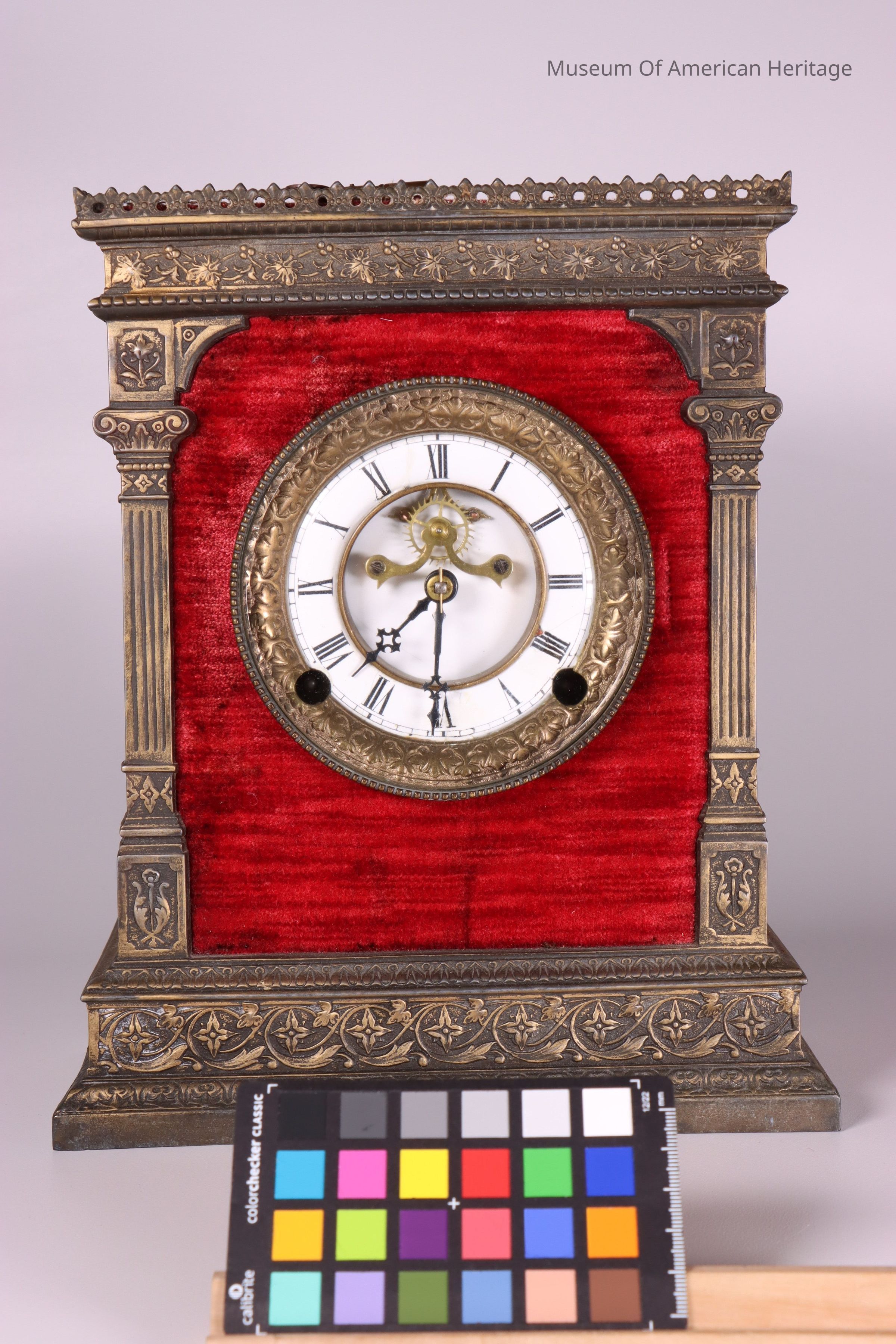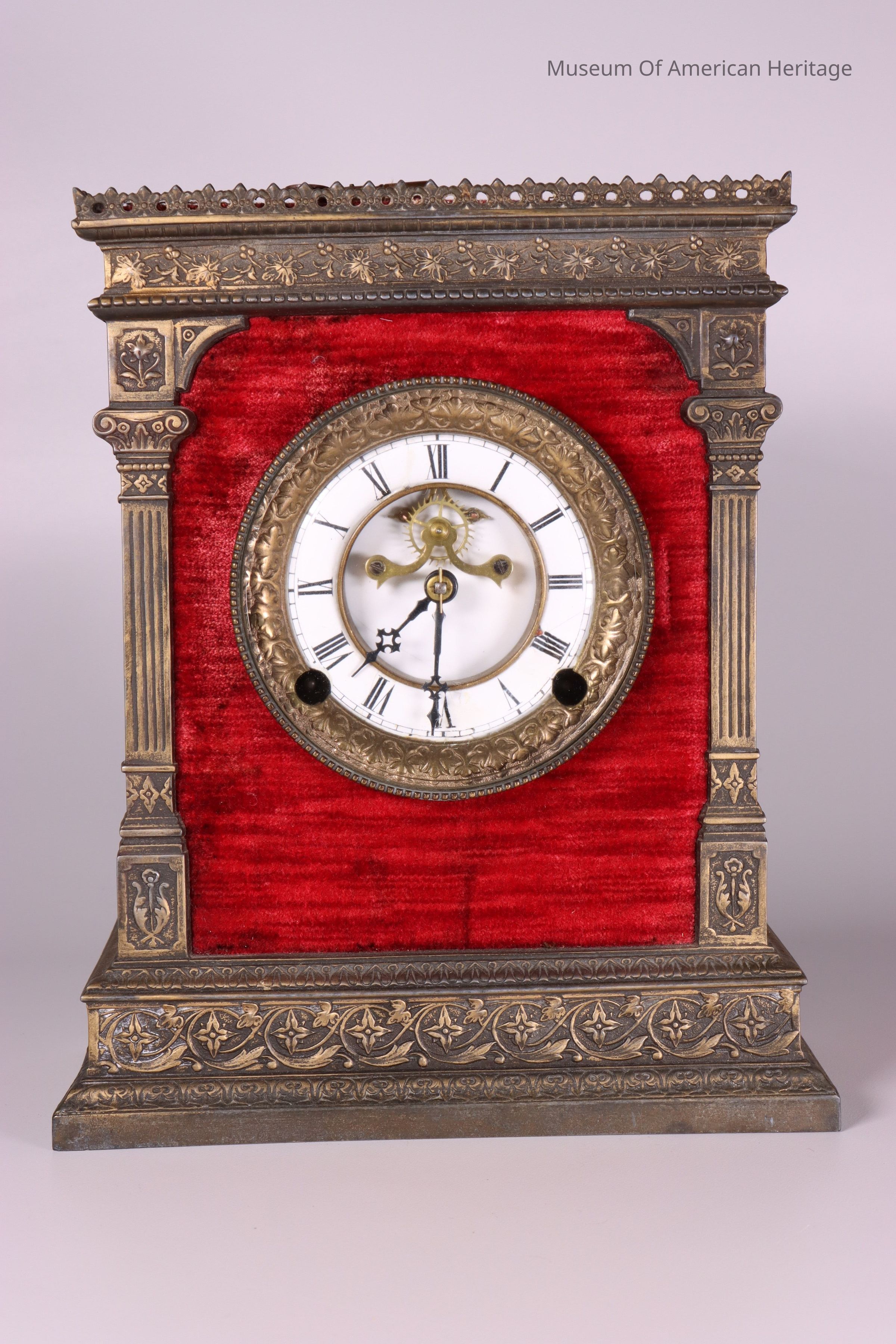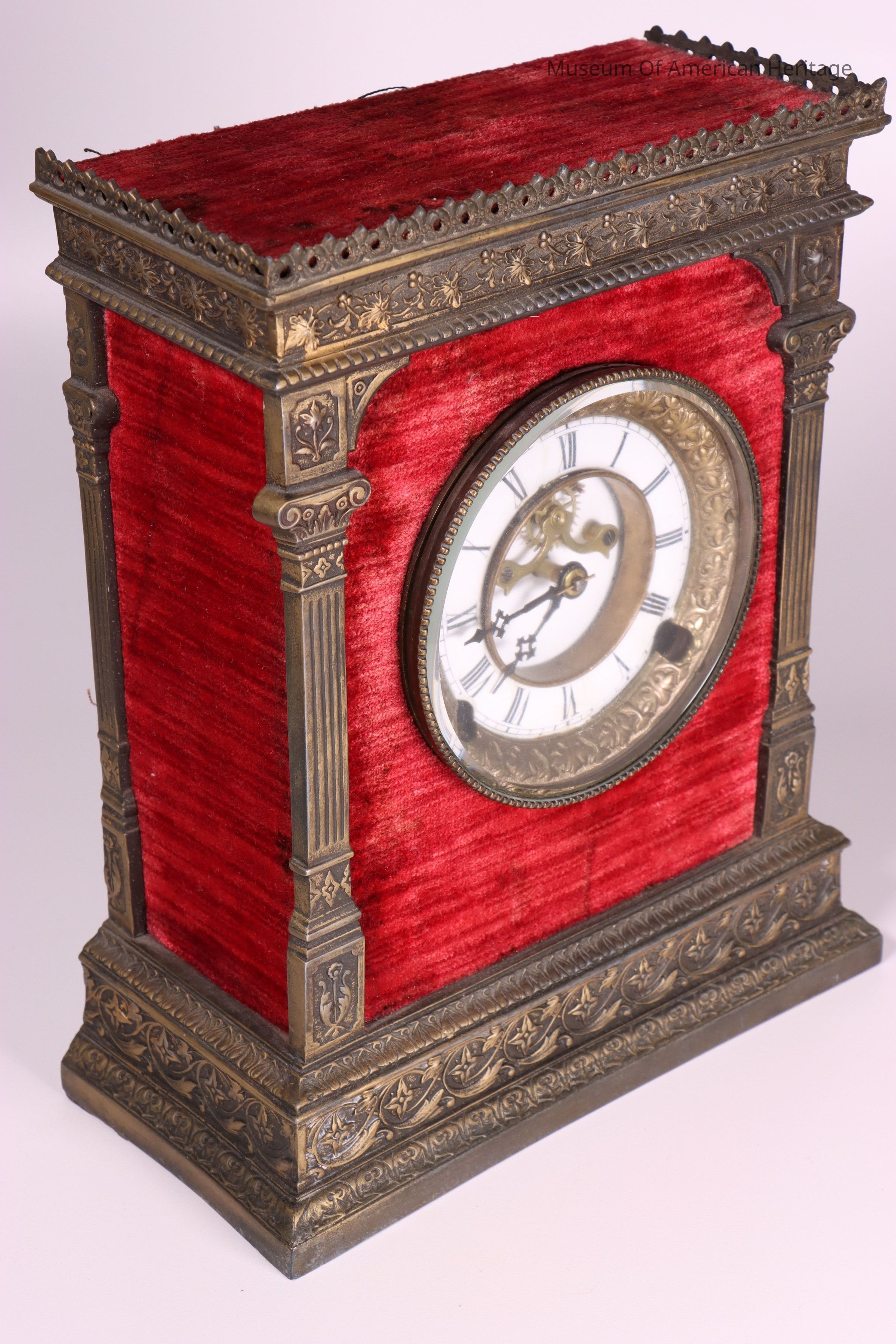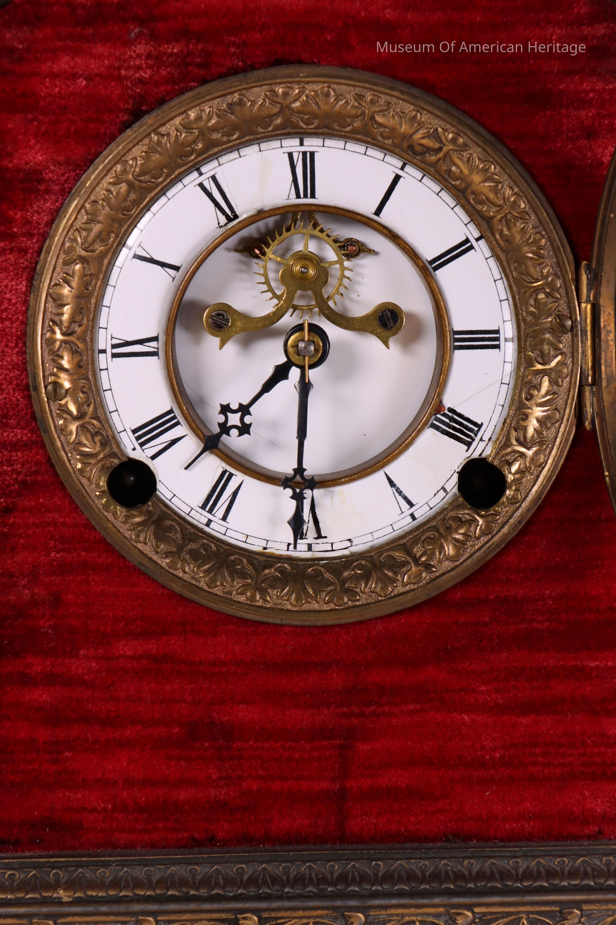 Cast iron, bronze, and velvet wind-up mantel clock with porcelain face.