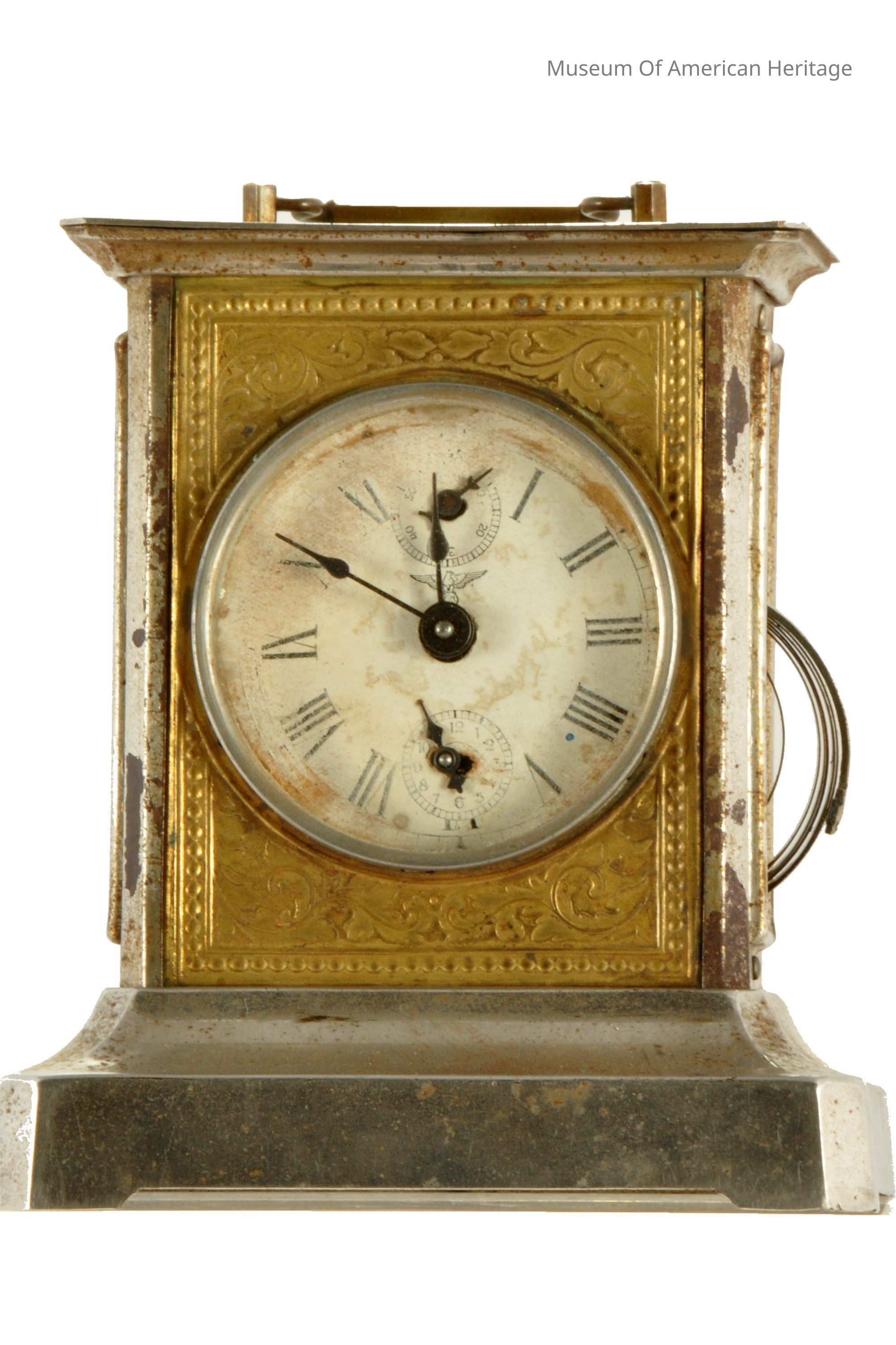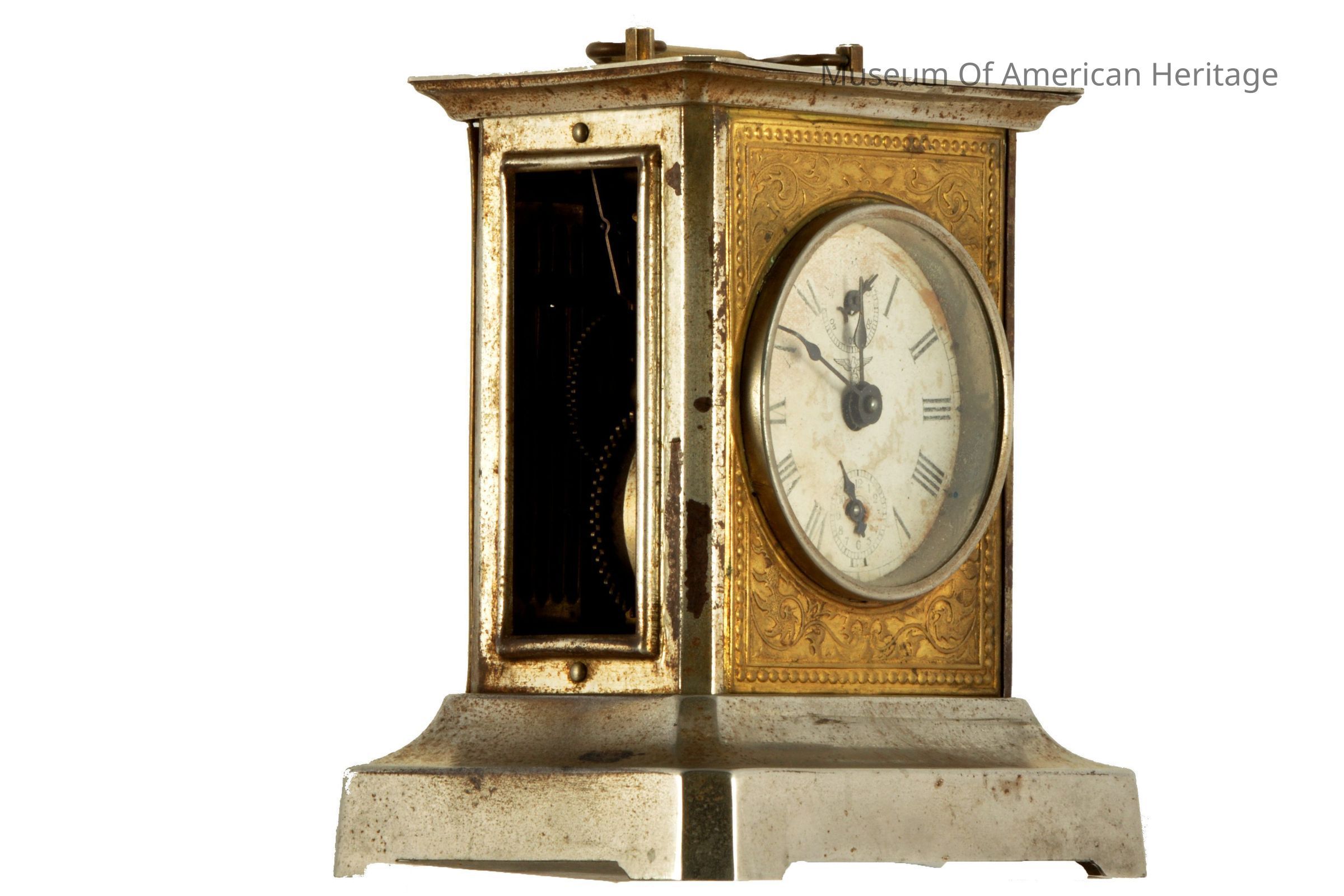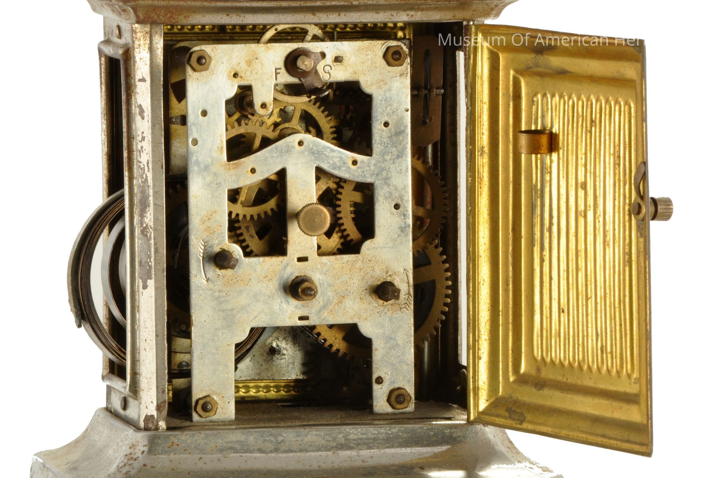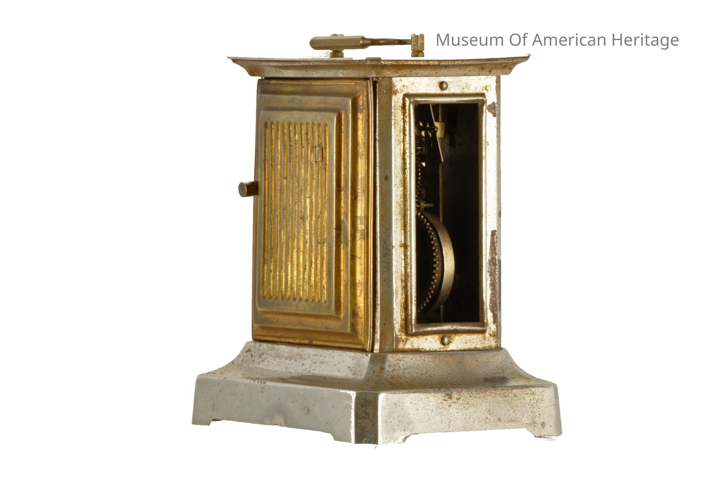 Eagle on ball logo, ball initials FMS, folding handle on top, wood panel in base, open sides (glass missing) with works visible, back door and front panel brass tone.