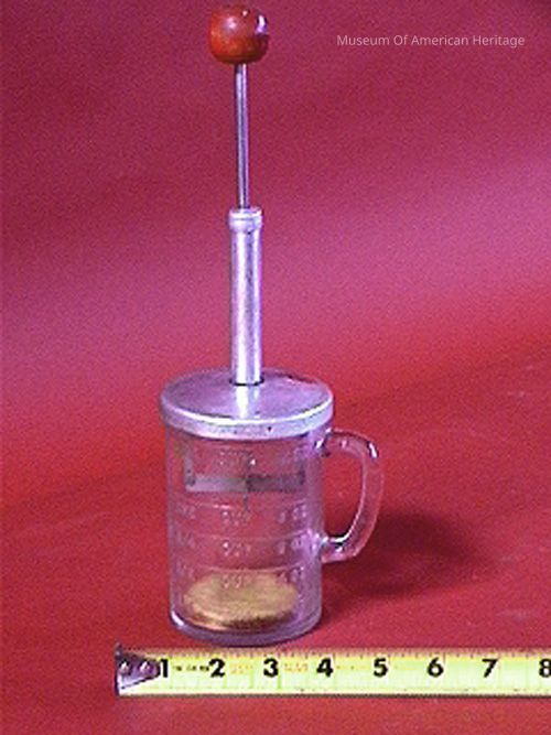 Spring loaded, red wood knob, hand operated, graduated glass jar w/handle.