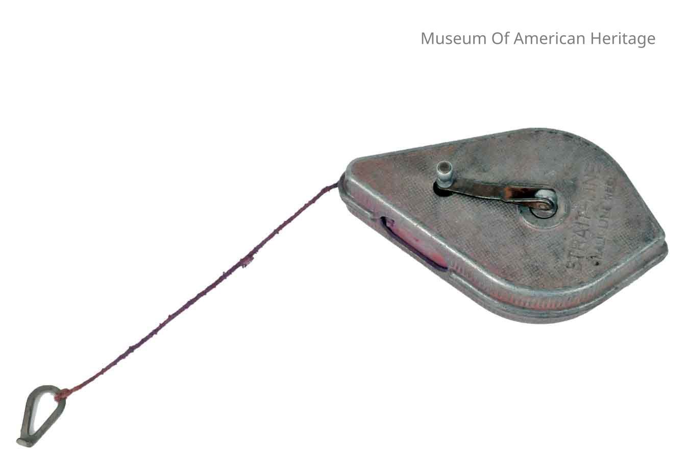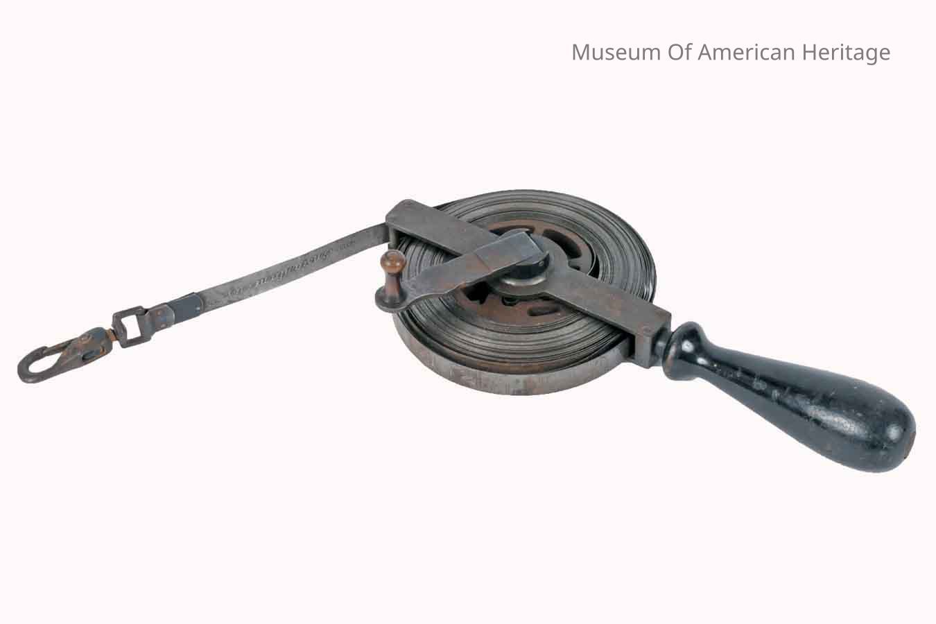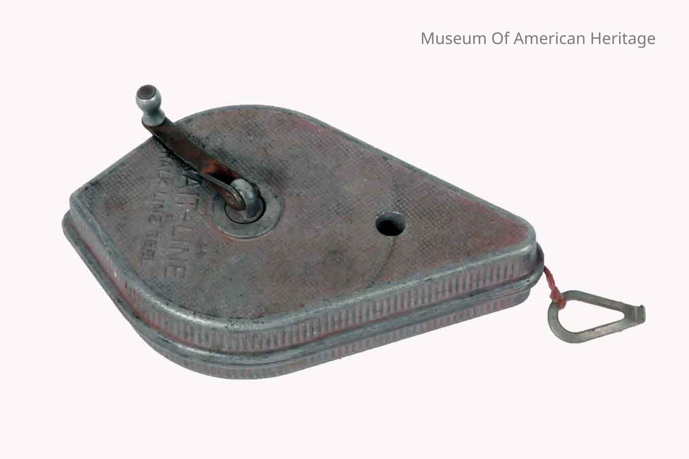 A: Lufkin Rule Co., "Atlas", .5" x 5" x 10" B: Lufkin 66' Measuring Tape wih attatched 6 spike, and Lukfin grip Model 584 C: Irwin Auger, Strait-Line Chalk Line Reel, 10" x 3 x 4.5"