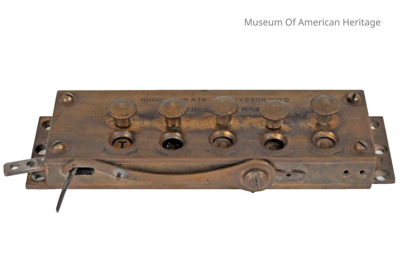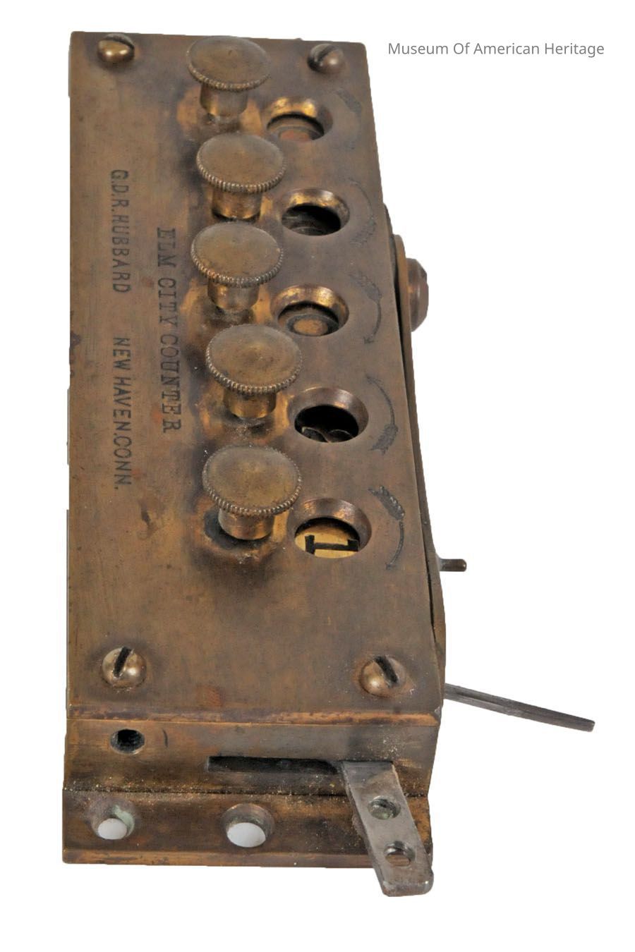 Elm City Counters were designed for industrial use in the textile or print making industries. These counters connected to a printing machine and served as a method of keeping track of completed work. As an item was completed, the lever triggered the number dial to roll over, keeping an accurate count of lots completed on a specific machine.