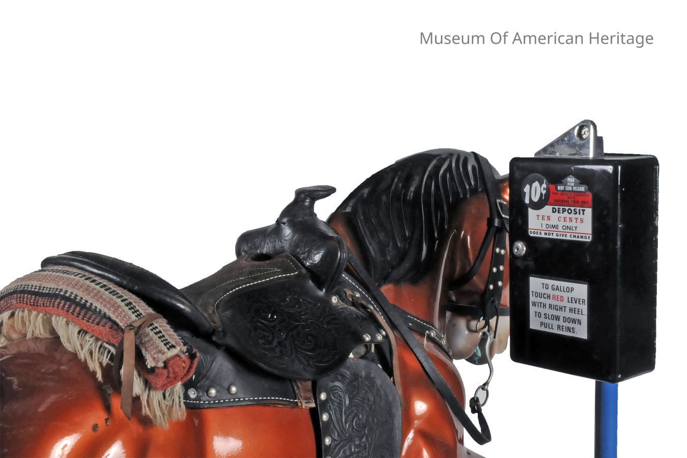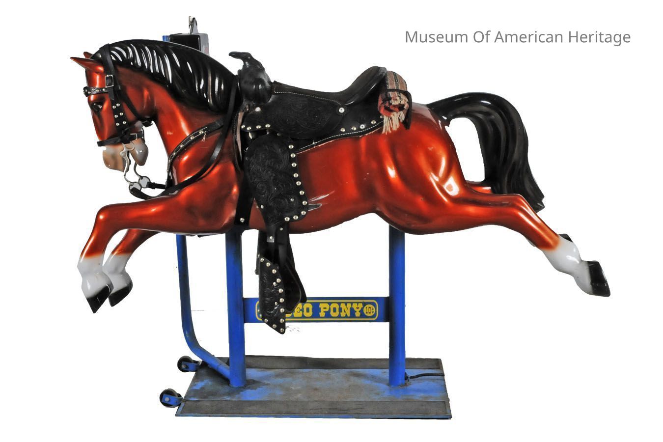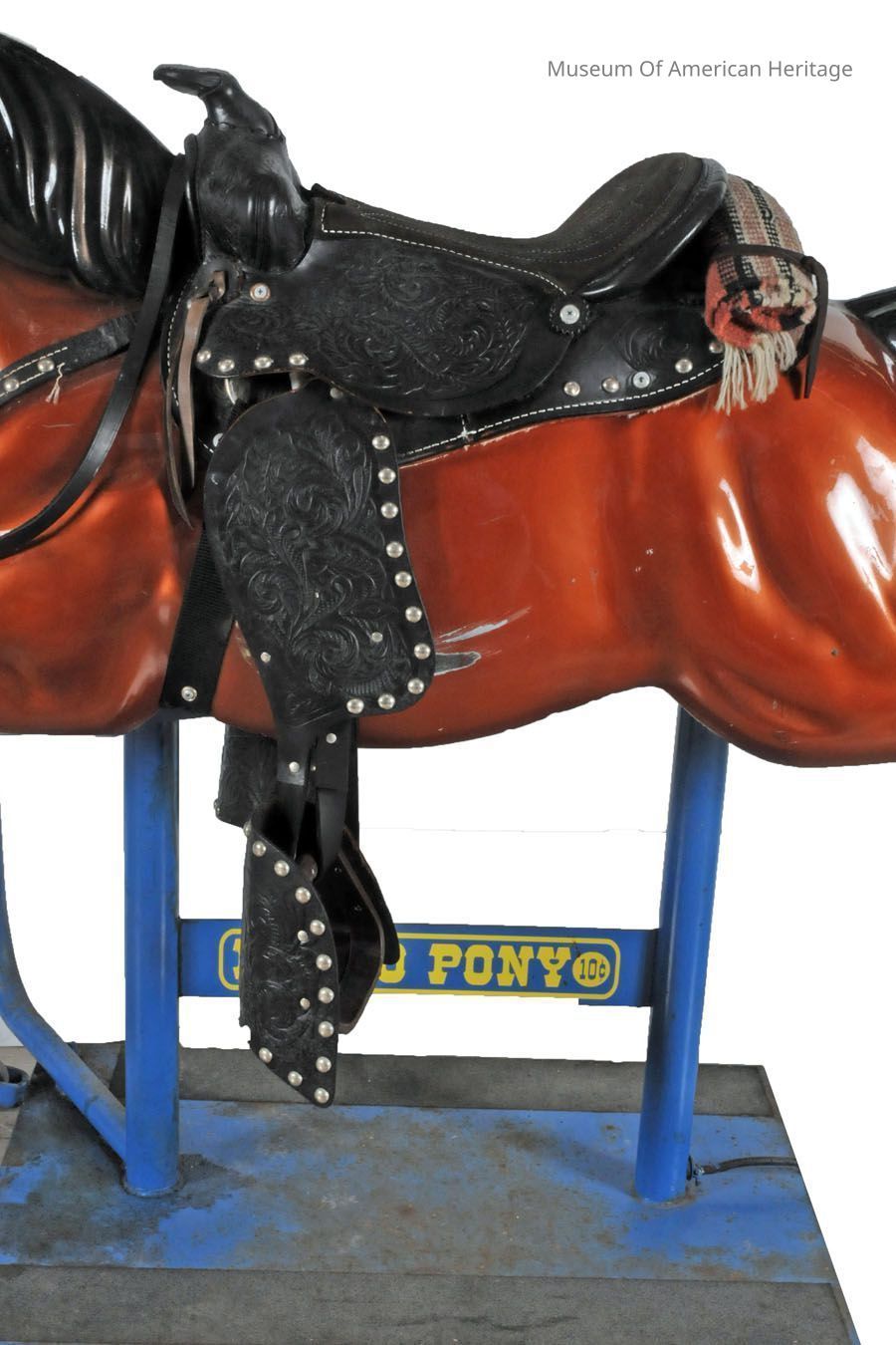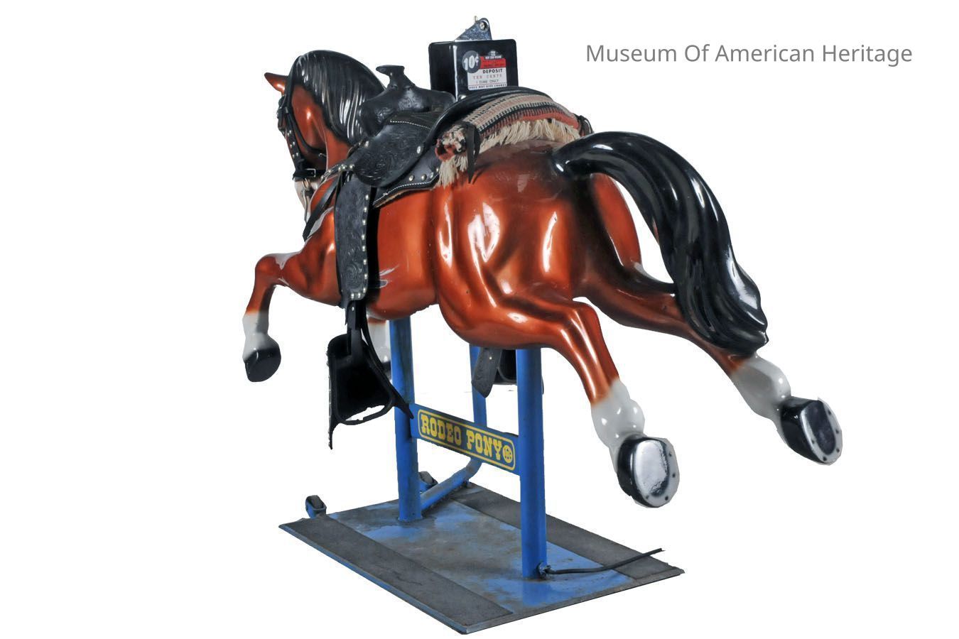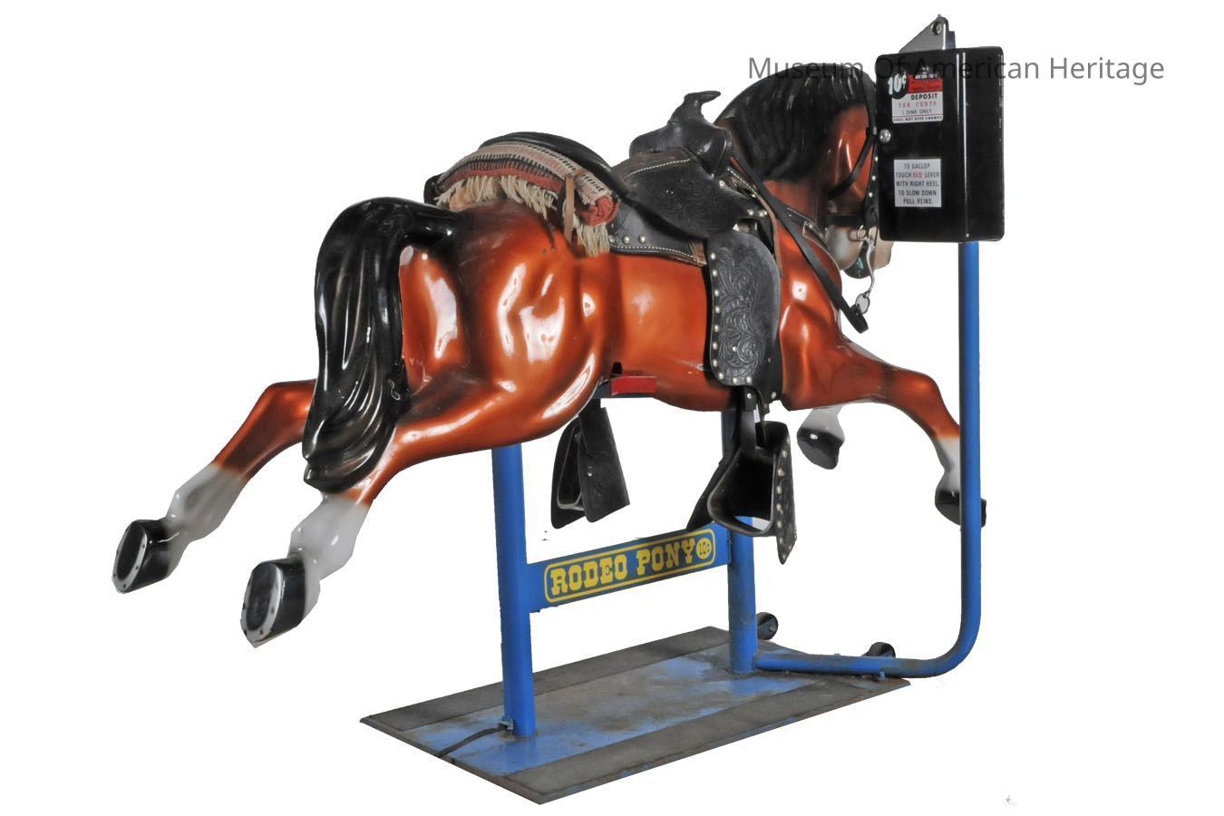 Amusement ride, real leather saddle, blanket roll, bridle w/reins, 2 speed, operates with dime, mounted on metal platform with wheels (2).