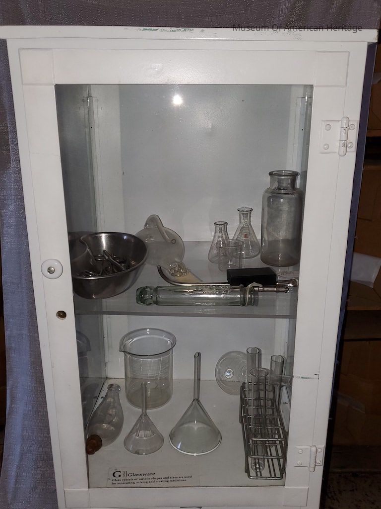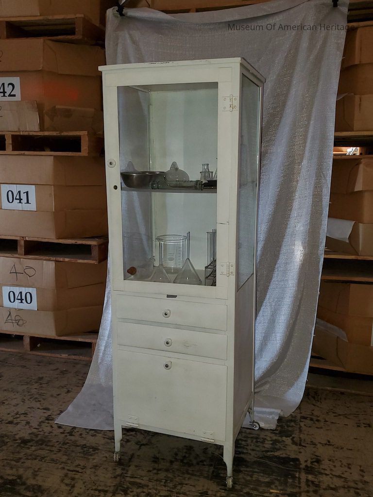 Metal cabinet, glass door and sides on upper section, wheels. Glassware and other props stored inside.