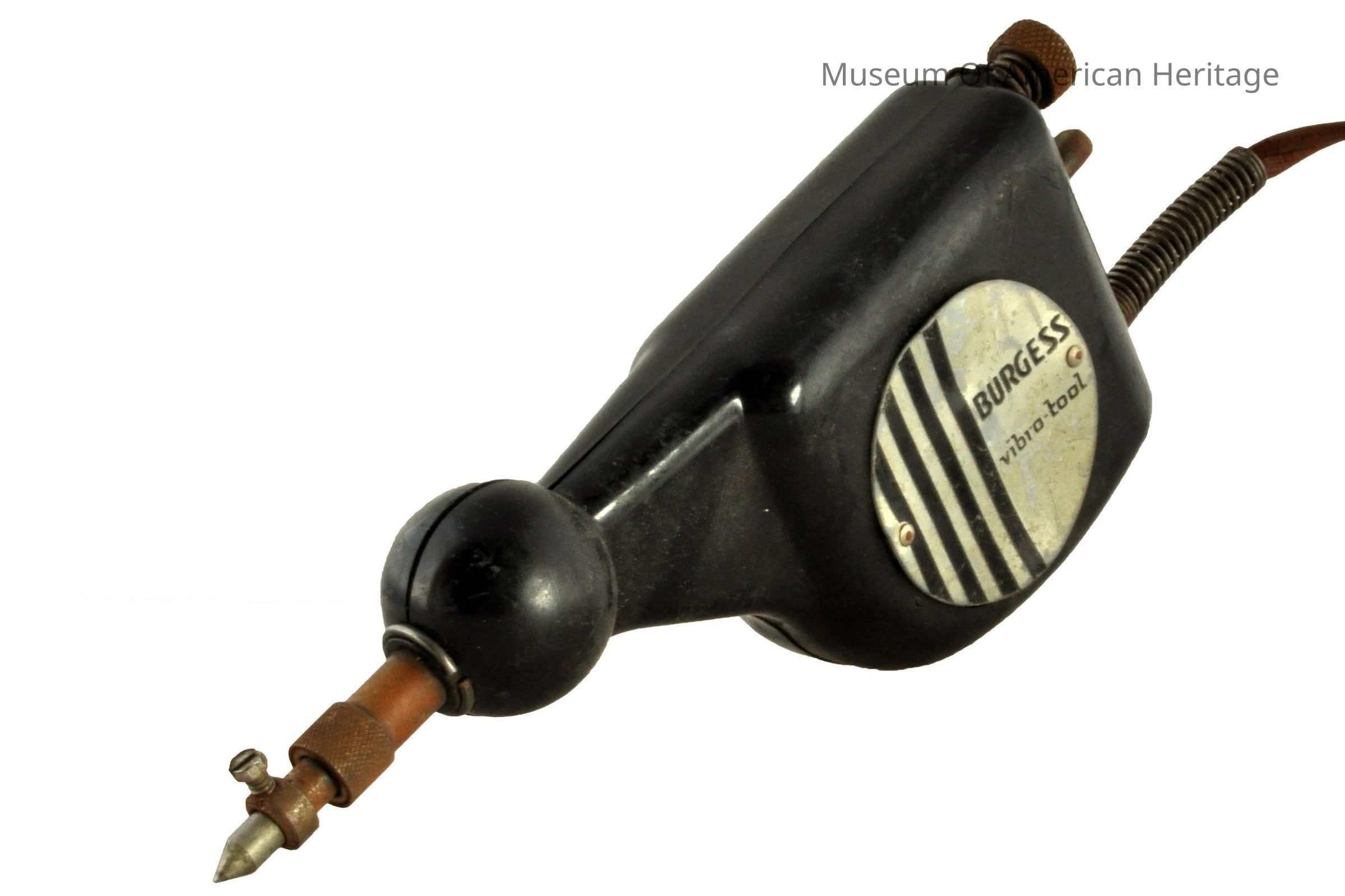 Round name plates on sides, rubber cord, Hubbell Co. plug, adjustable collett.