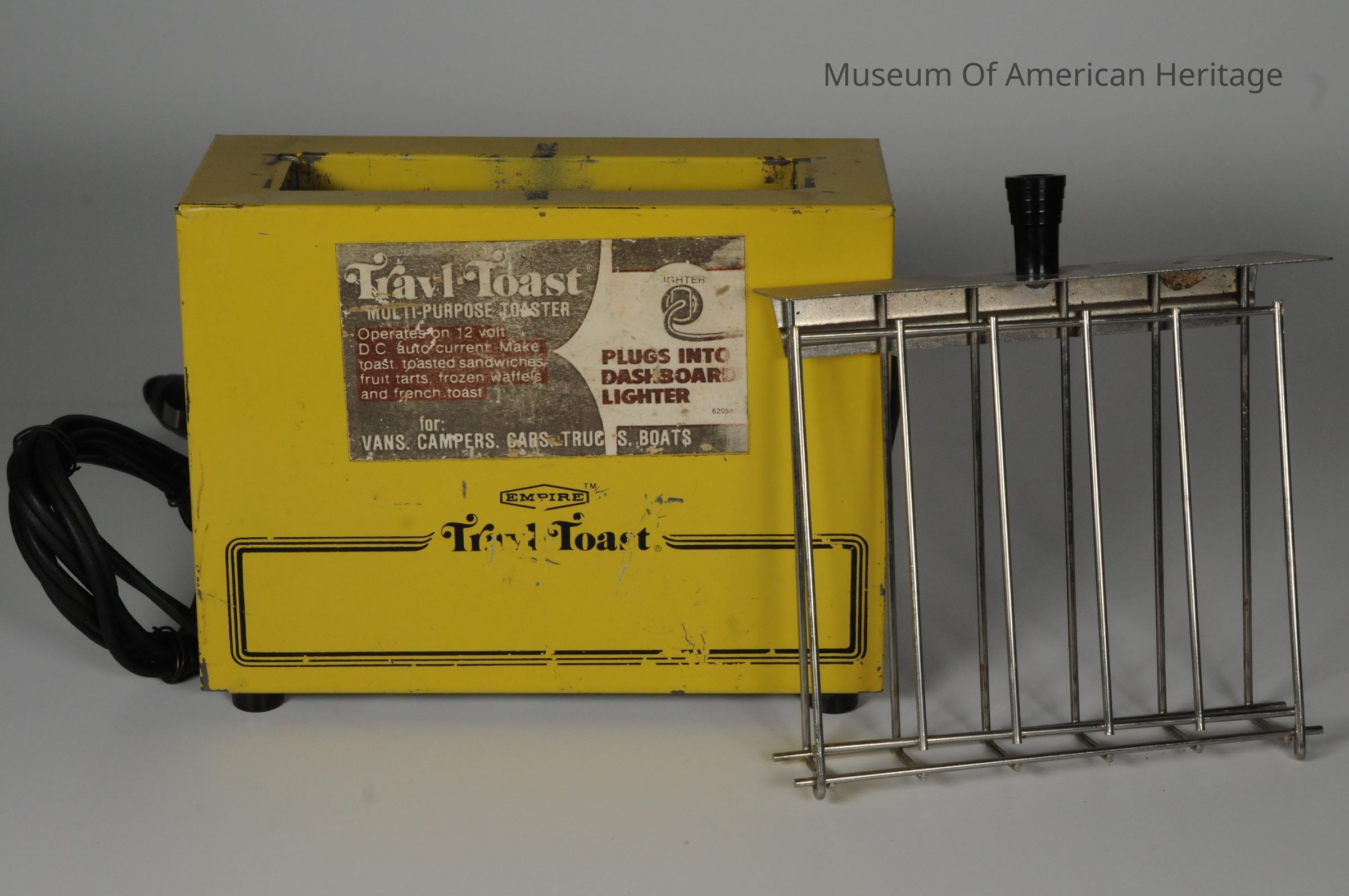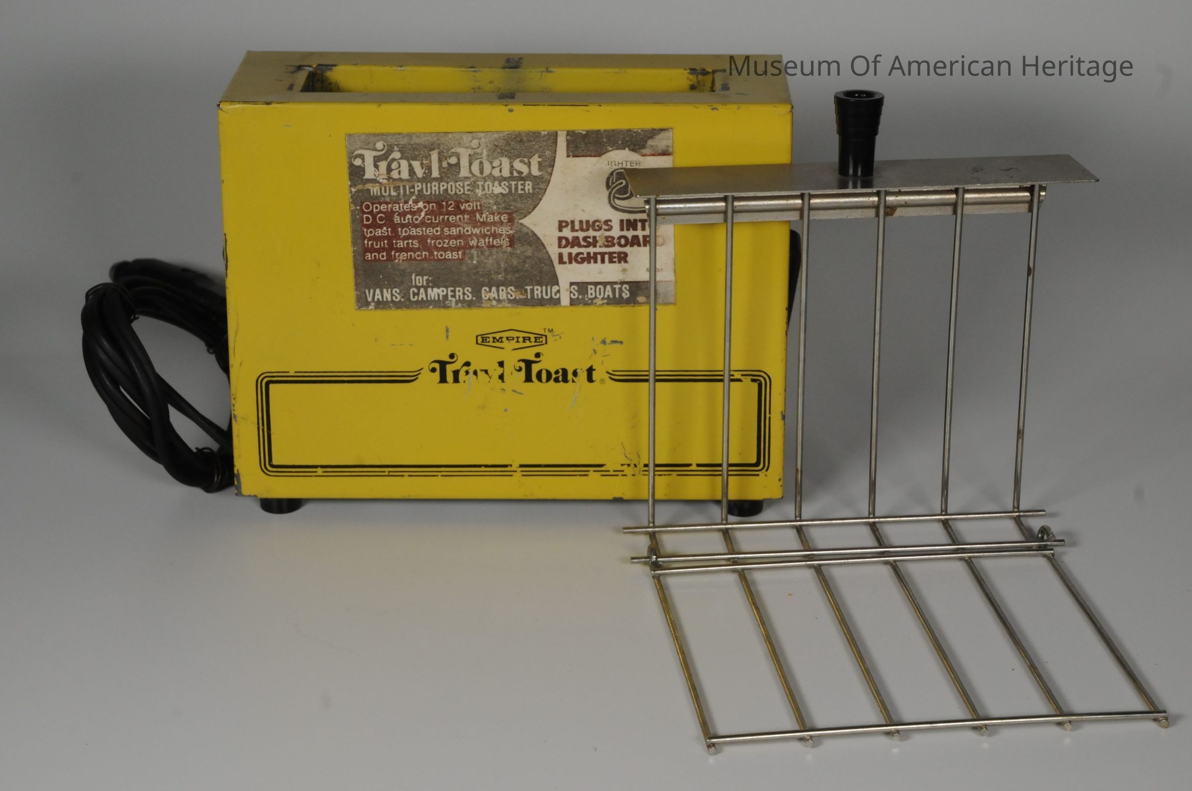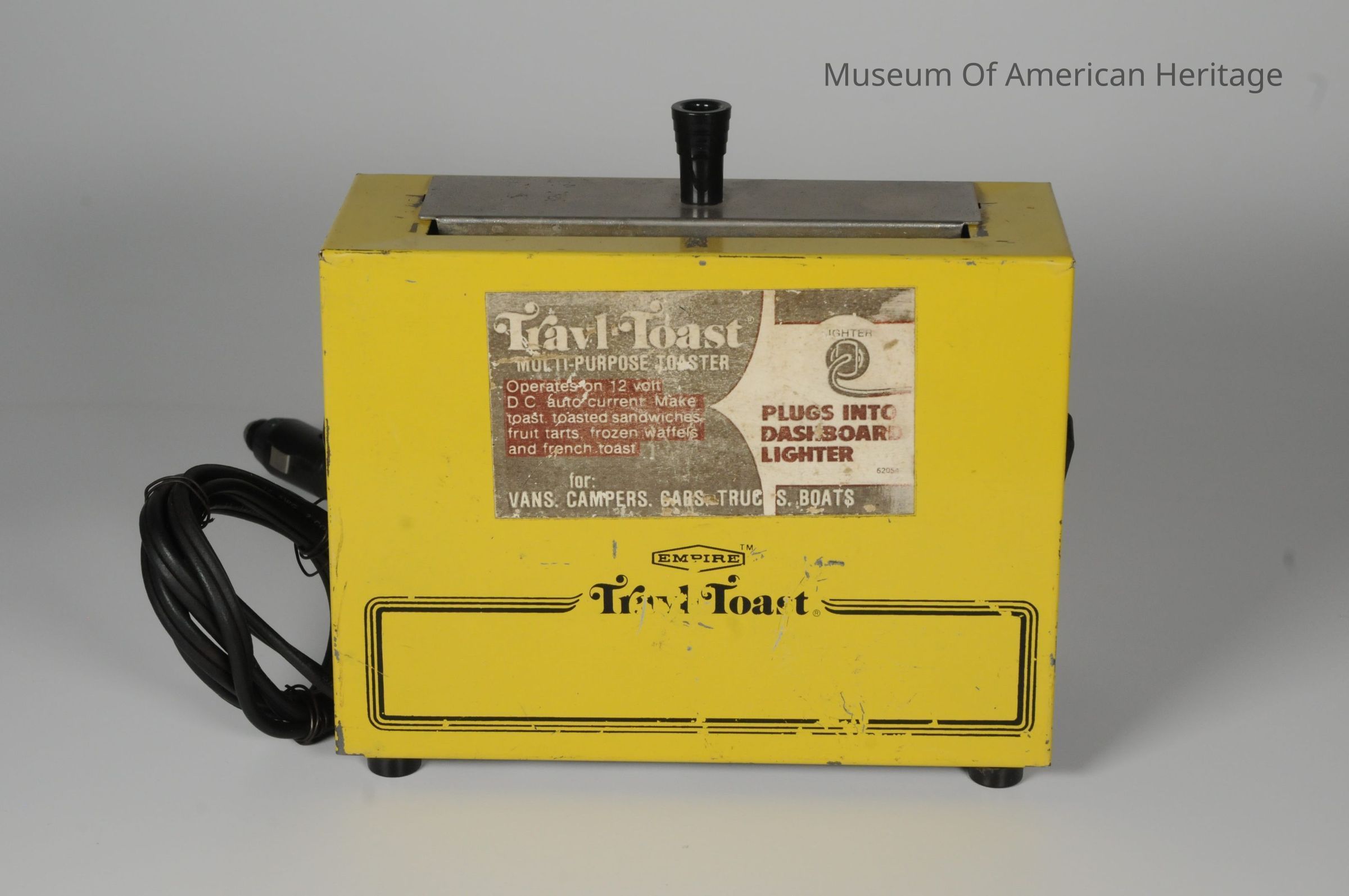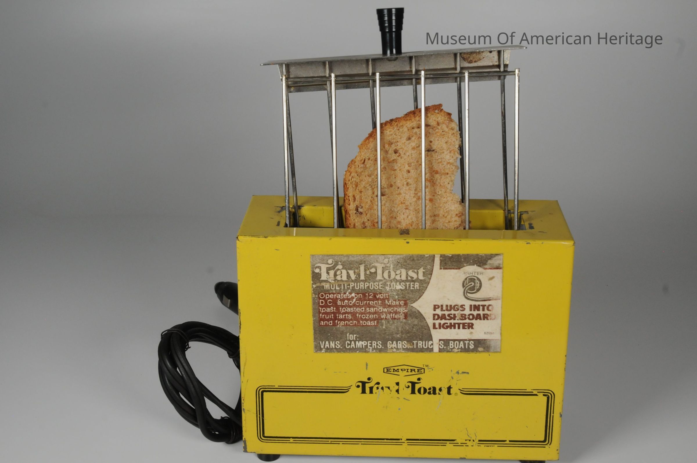 One-slice, 12v- plugs into automobile cigarrette lighter socket, - Still commercially available today, The first automobile toaster was patented in 1929, There is a companion fry pan and sauce pan with a similar look also for the mobile market.