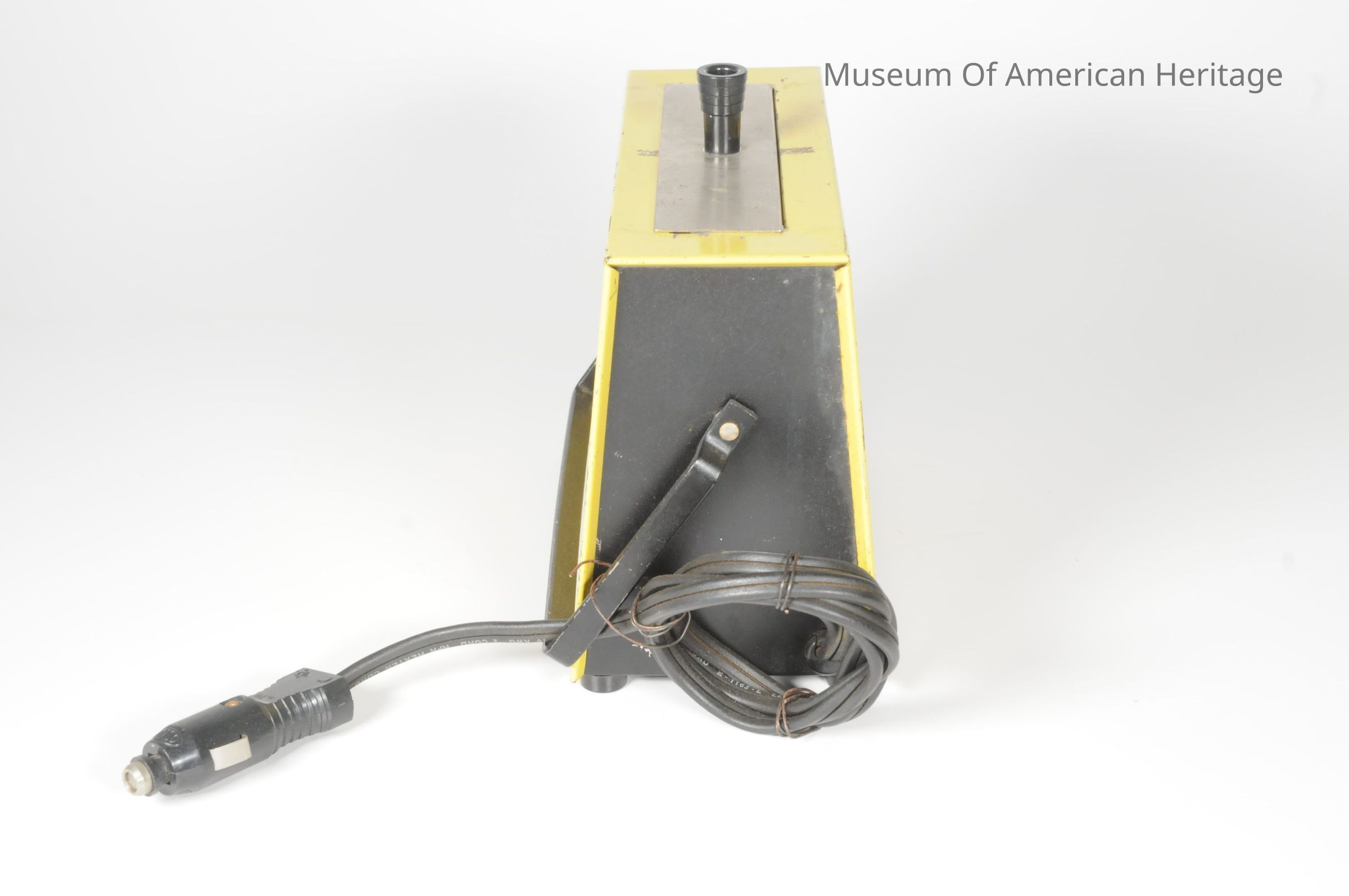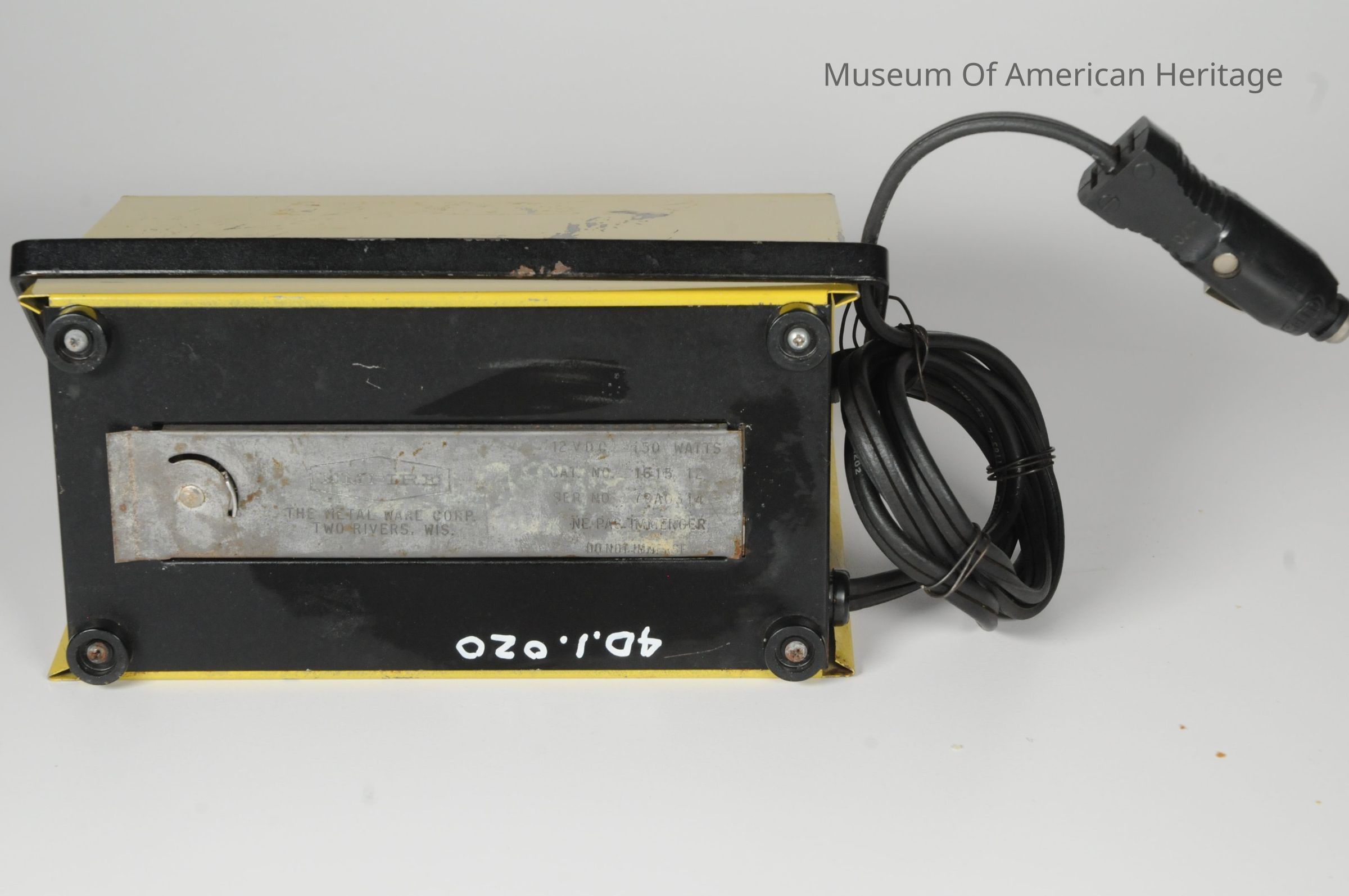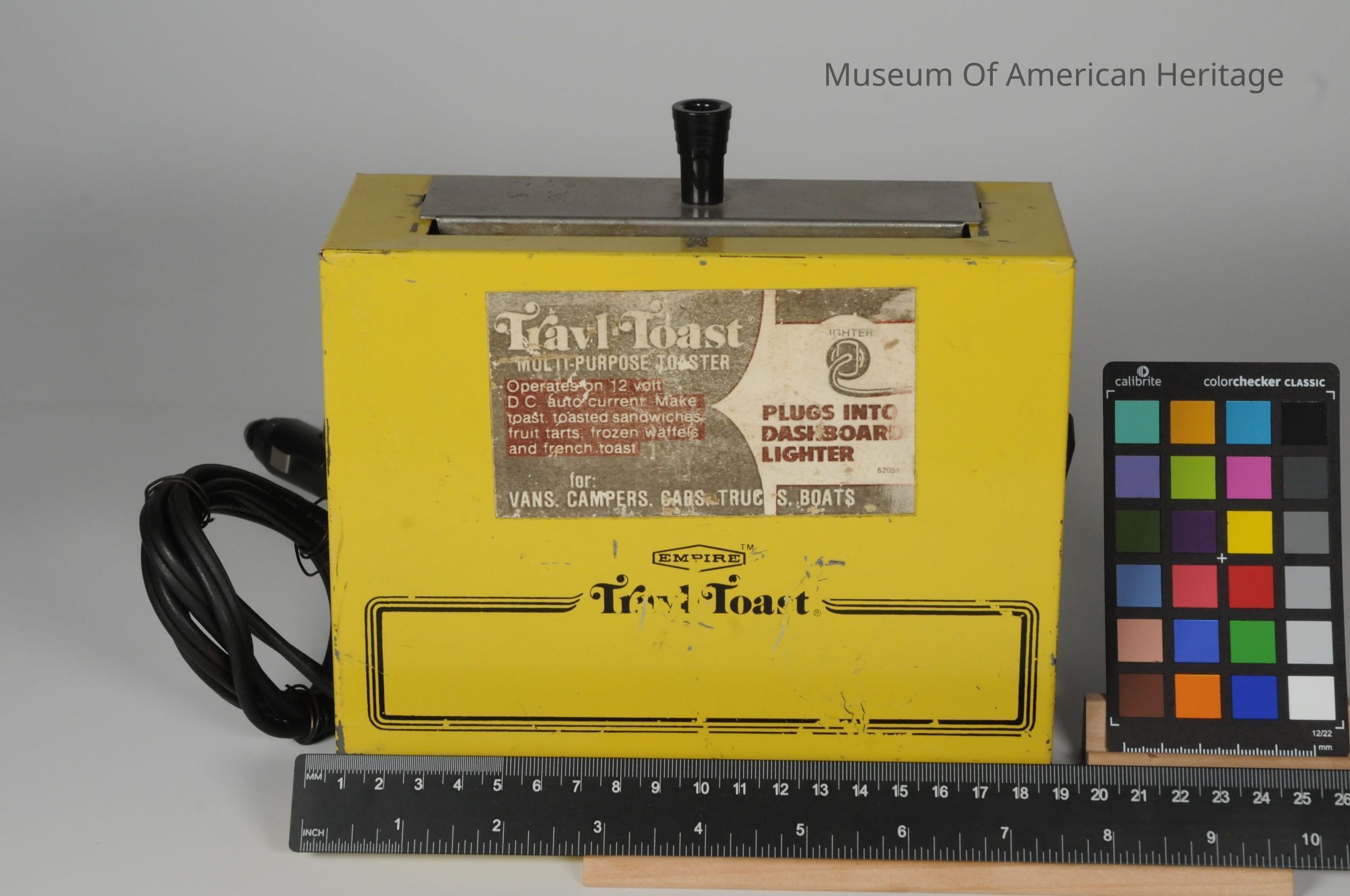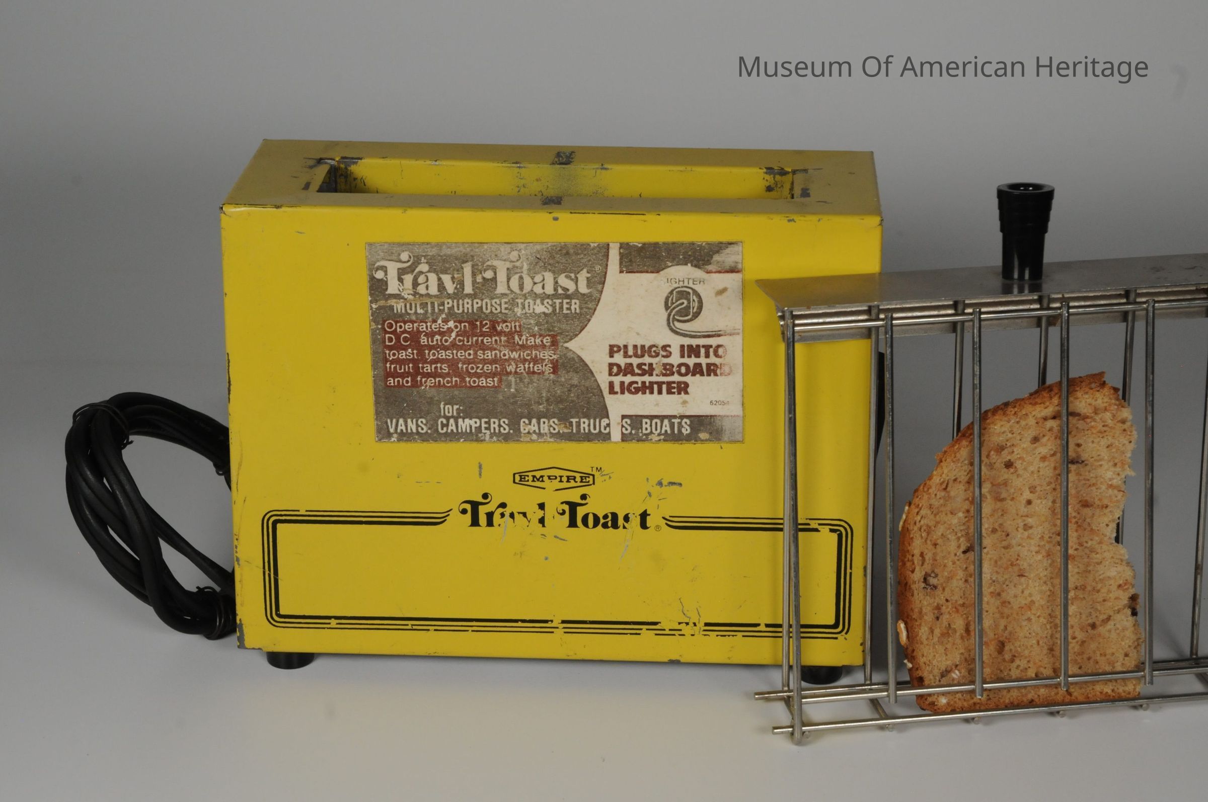 One-slice, 12v- plugs into automobile cigarrette lighter socket, - Still commercially available today, The first automobile toaster was patented in 1929, There is a companion fry pan and sauce pan with a similar look also for the mobile market.