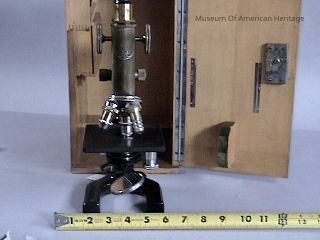 In wood case with lock, monocular, extra lenses, 3 lens turret.