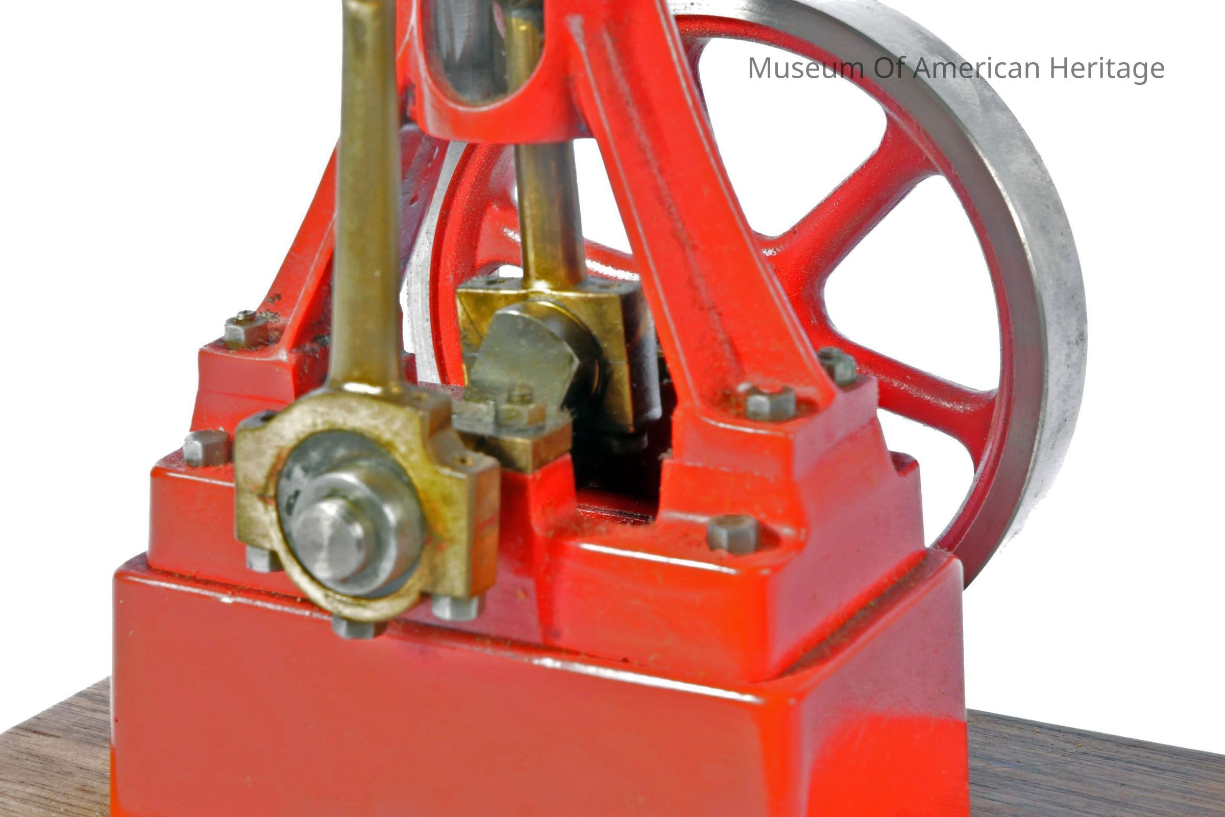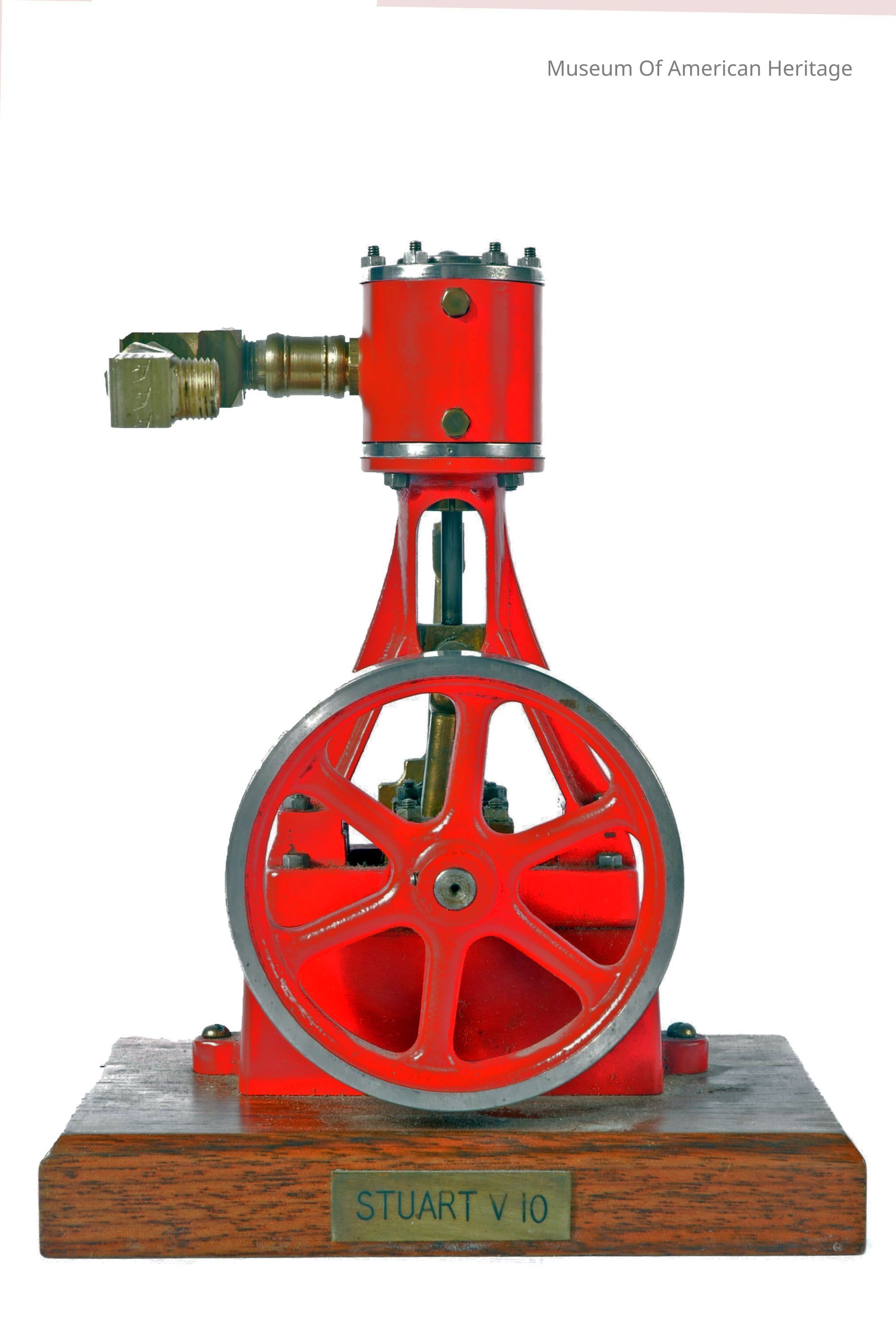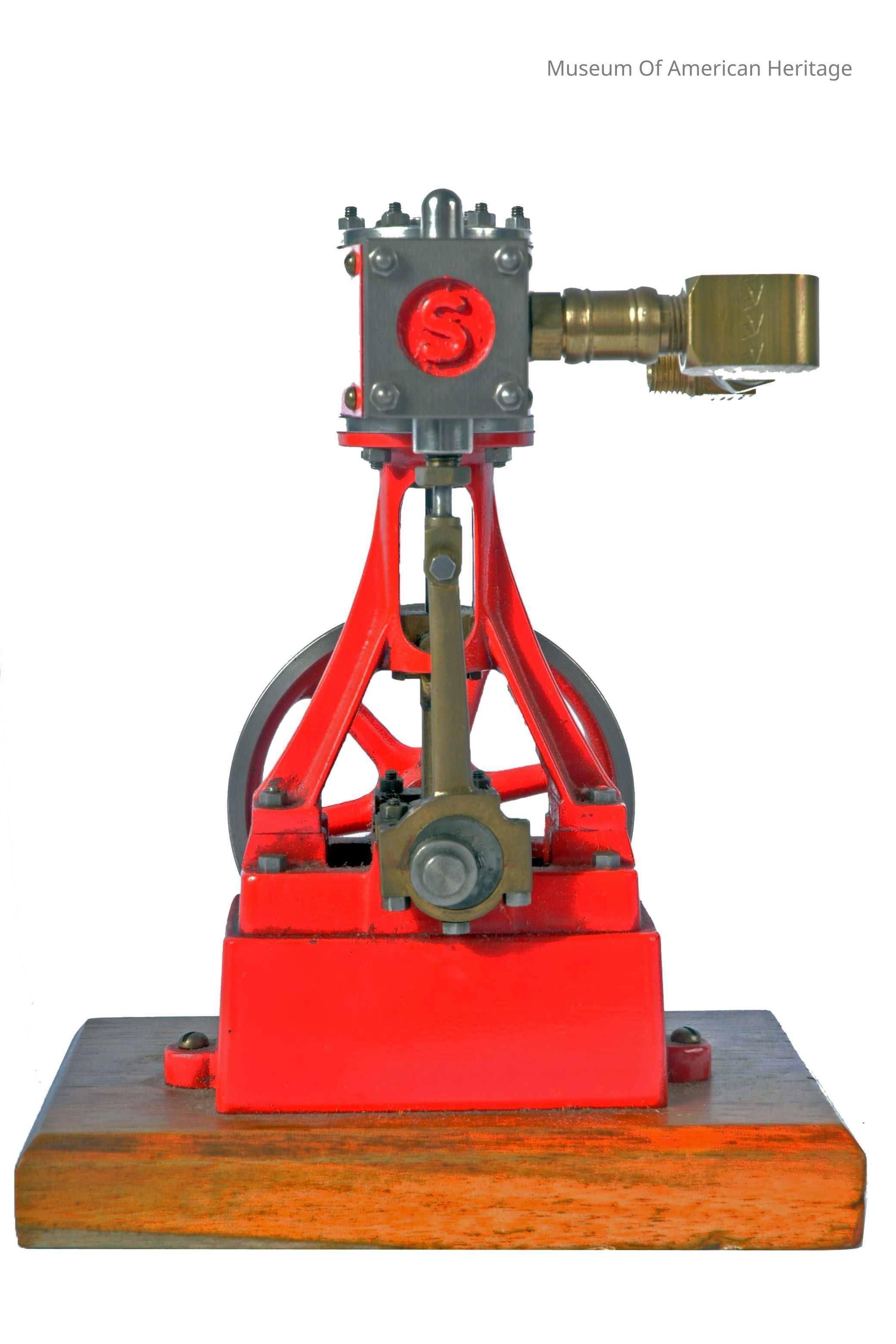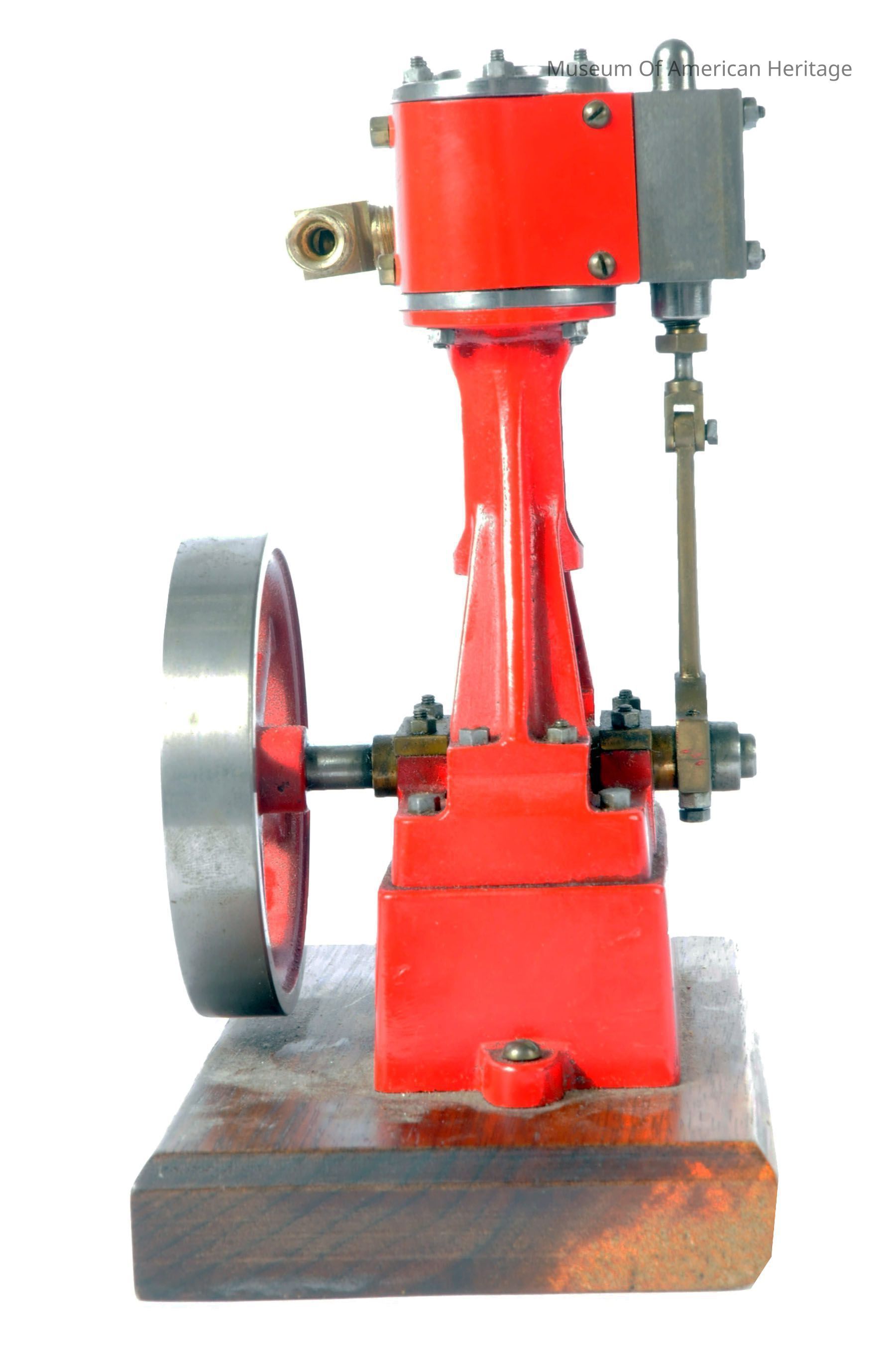 Vertical top piston engine mode, made from a kit, unknown builder, mounted on wood base.
