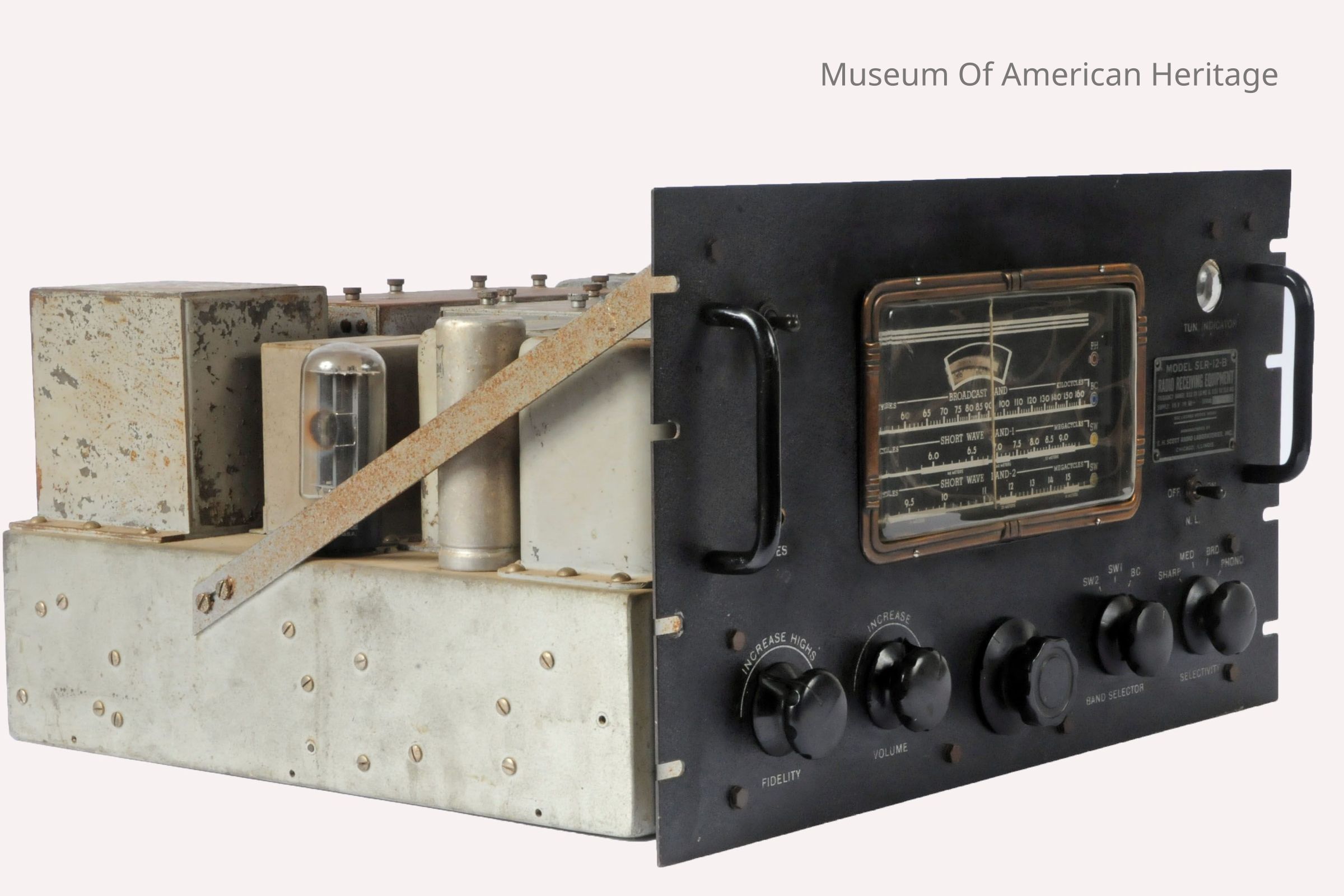 on/off toggle switch, phono jack, fidelity, volume, tuning, band select, selectivity-sharp, med., broad phono, tuning eye.