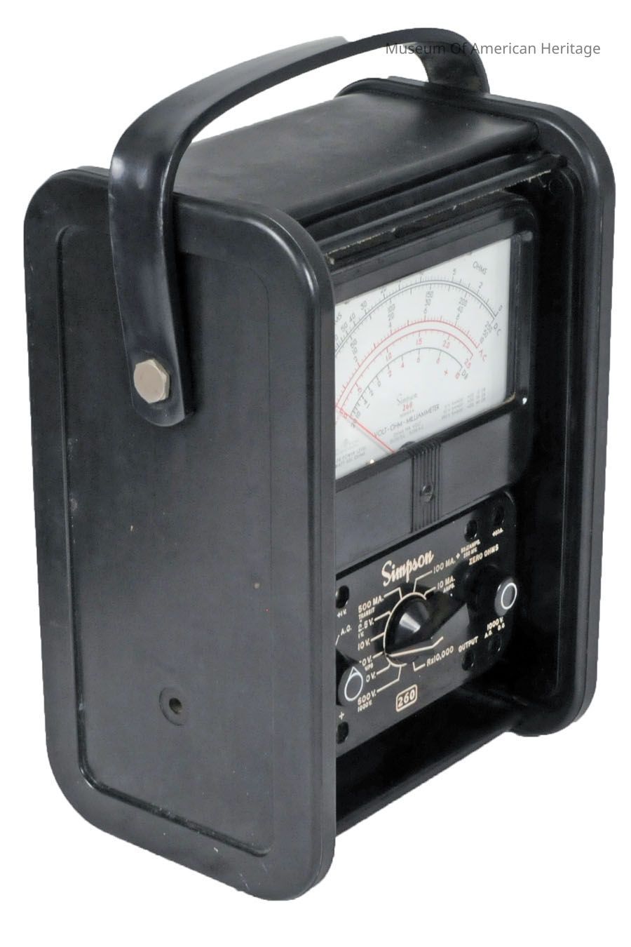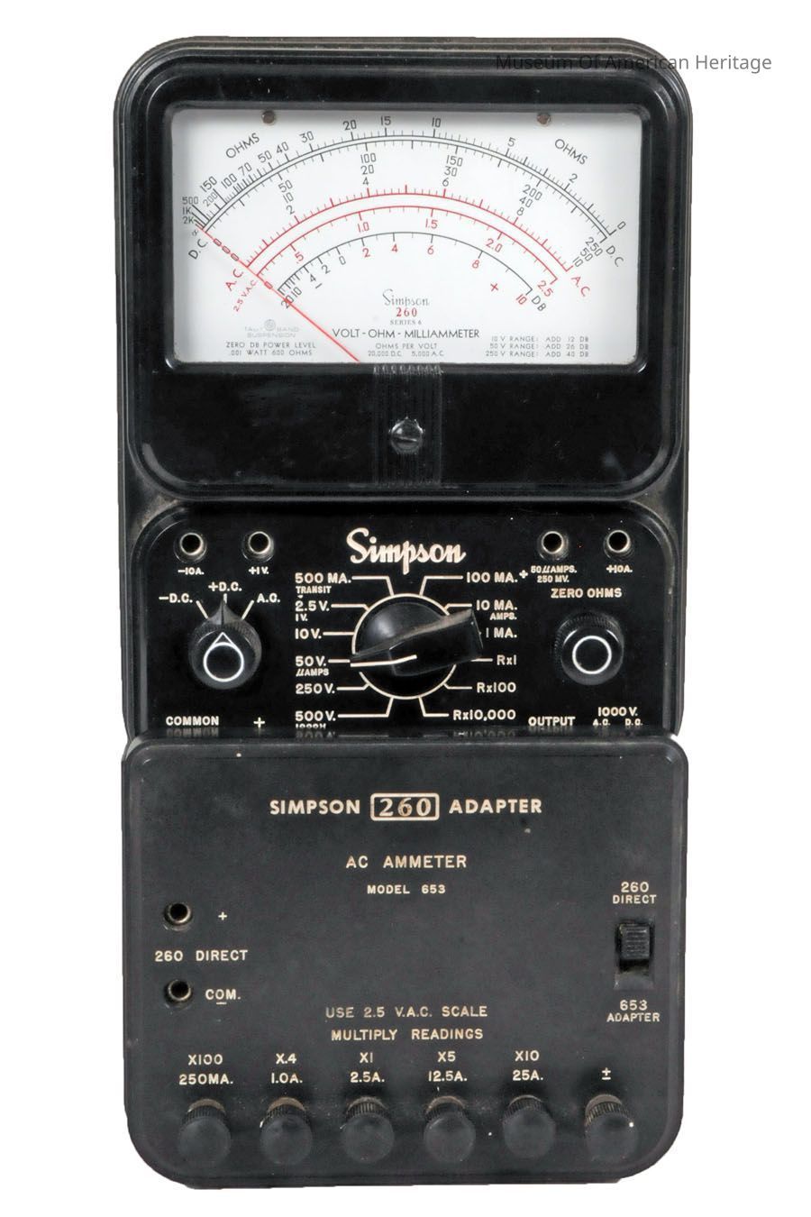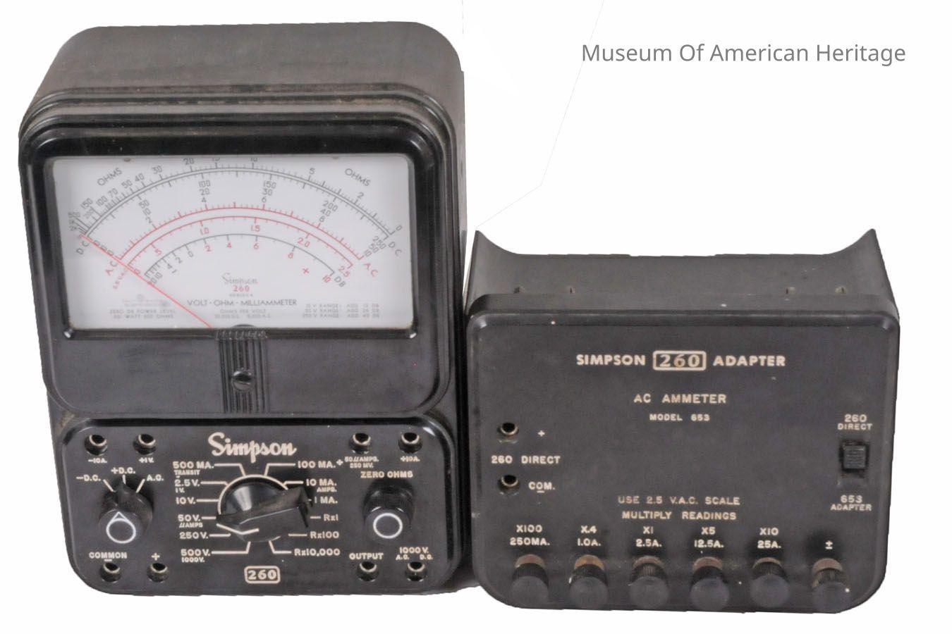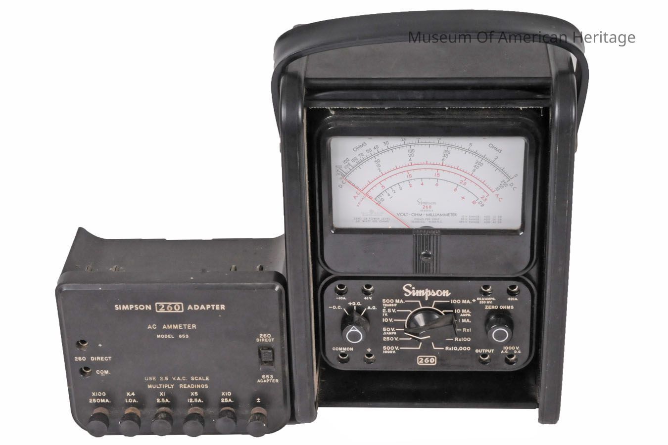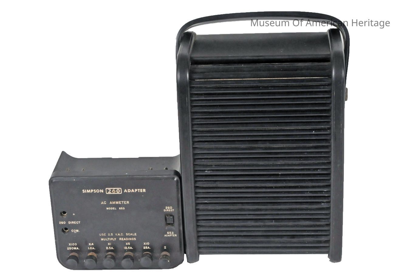 A: Voltmeter installed in roll top front enclosure. B: Model 260 AC Ammeter Attachment. DC/AC volts, milliamps, ohms.