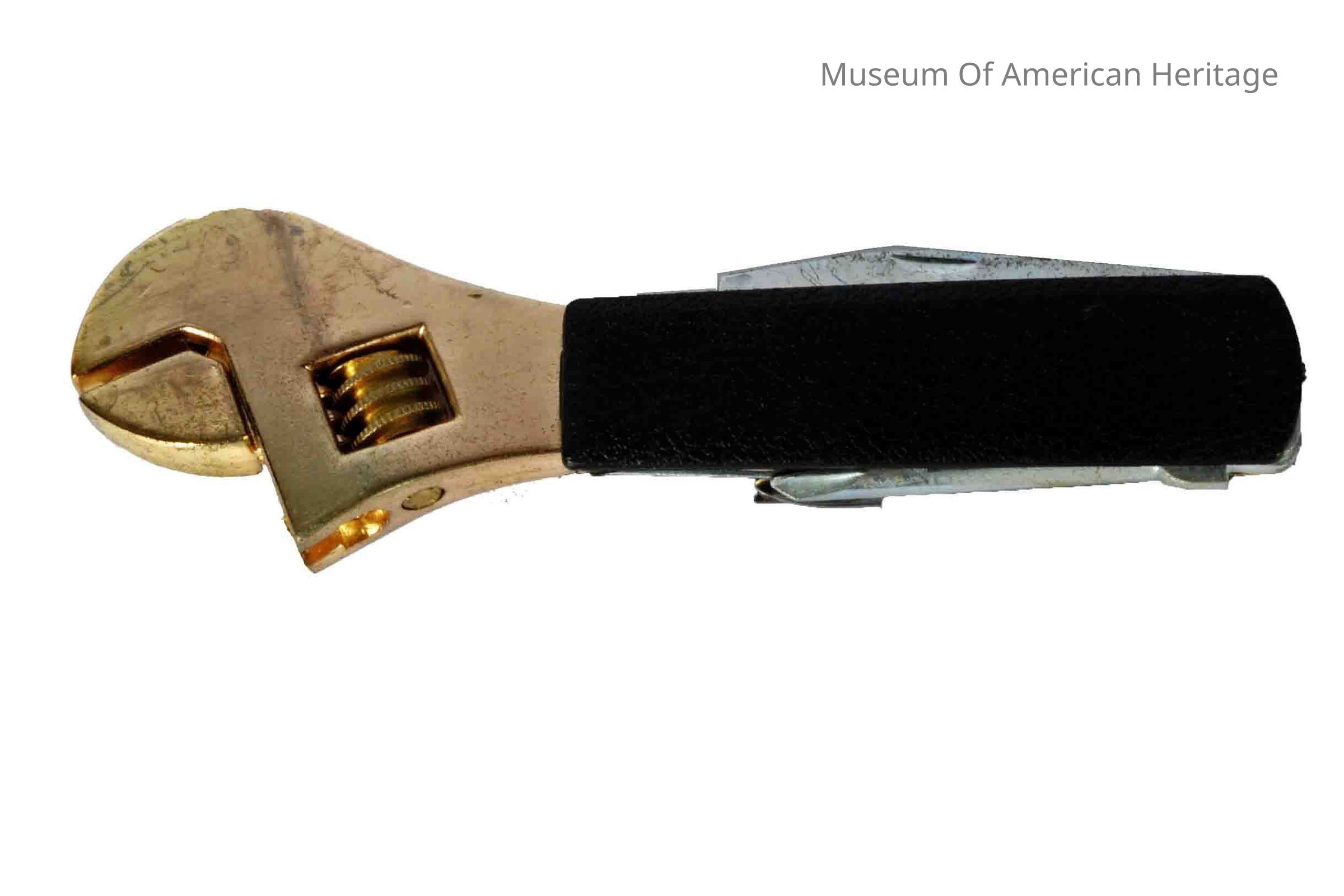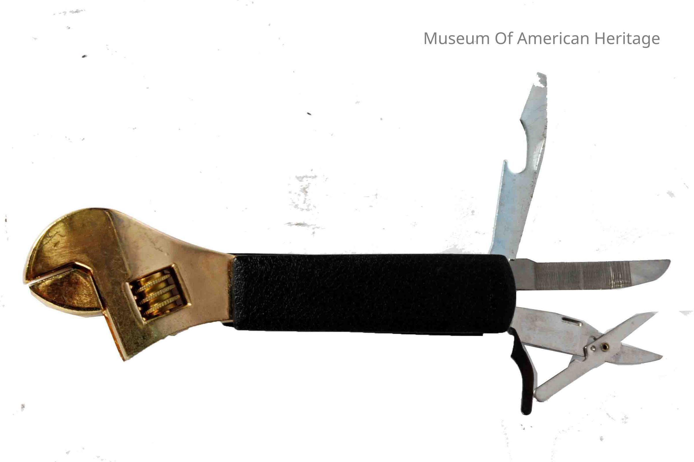 Adjustable wrench with 4 fold out attachments, screwdriver, bottle opener, Phillips screwdriver, scissors.